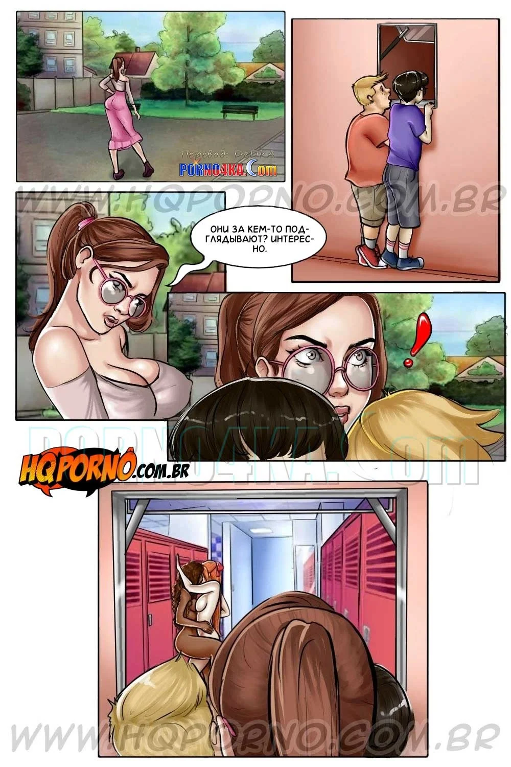 Порно комикс Профессор Кибелли. Часть 2: Лишение девственности ботаников. Кибелли не смогла удержаться до возвращения домой, чтобы порадовать себя там фаллоимитатором, и захотела пойти потрахаться к физруку. Но, по пути она застукала двух ботаников, которые дрочили, подглядывая за тем, как в раздевалке ублажают друг друга две сексапильные лесбиянки. И Кибелли твердо решила, что два ботаника реально могут заменить для нее одного физрука…