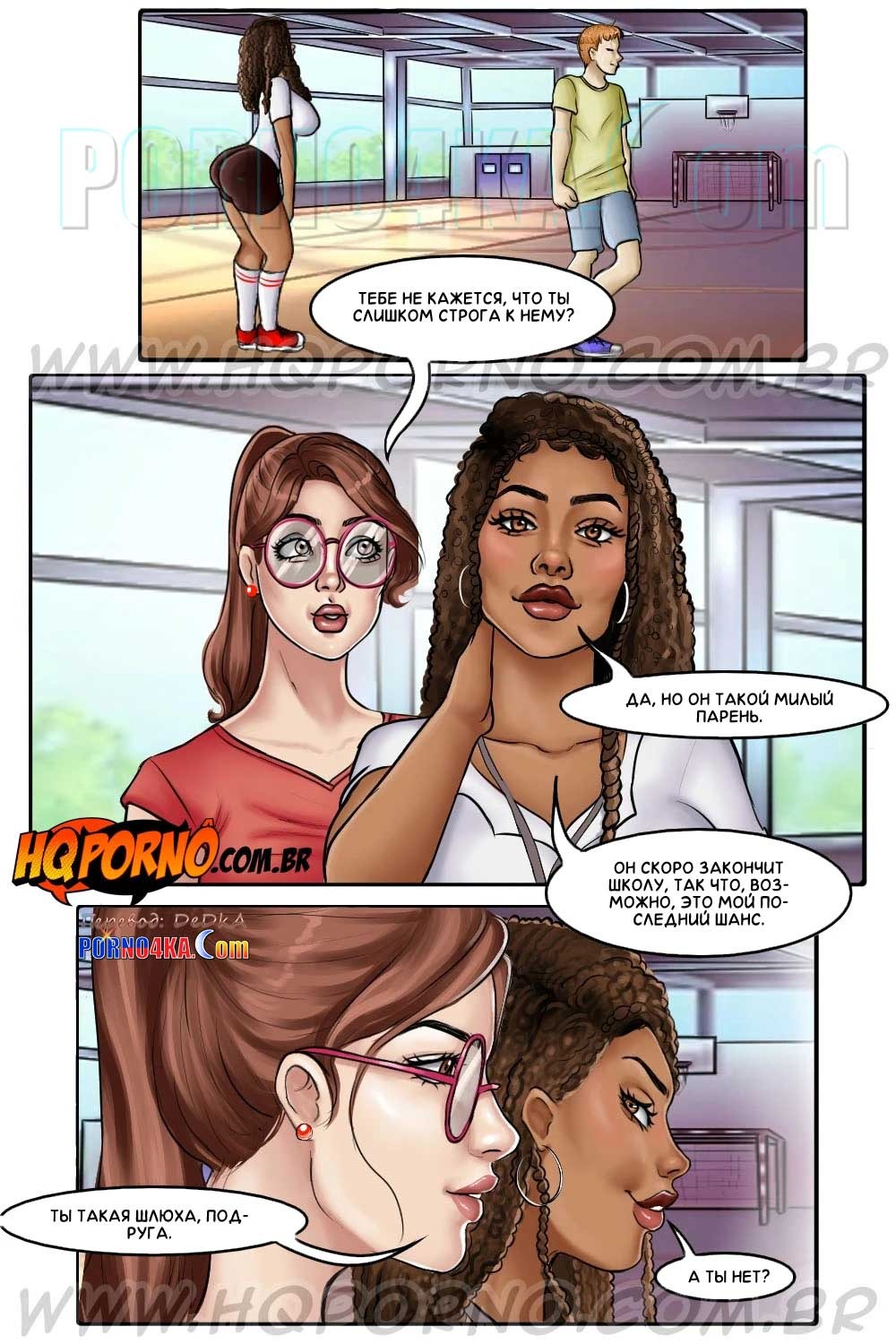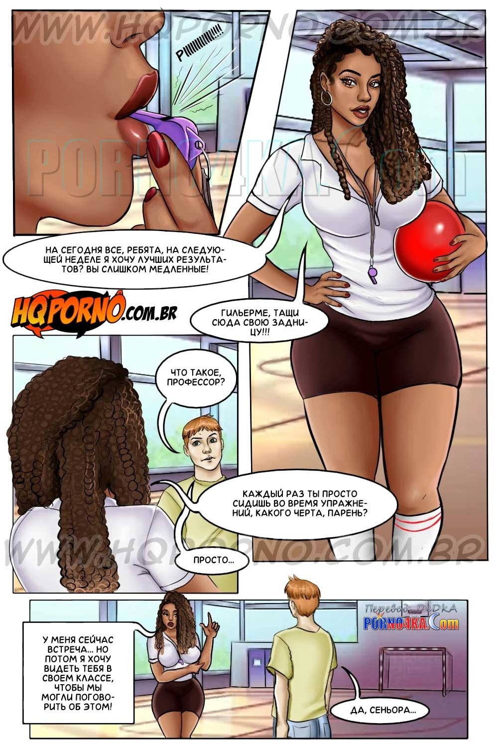 Порно комикс Профессор Кибелли. Часть 3: Зачет. На уроках физкультуры Гильерме всегда сидит на скамейке и не делает никаких упражнений. Преподавательница физкультуры, сеньора Полли, сказала ему, что он не получит зачет, но Гильермо сказал ей, что есть веская причина, из-за которой он стесняется надеть спортивные штаны для занятий физкультурой. Дело в том, что у Гильермо очень большой член. Преподавательница не поверила и потребовала доказательств…