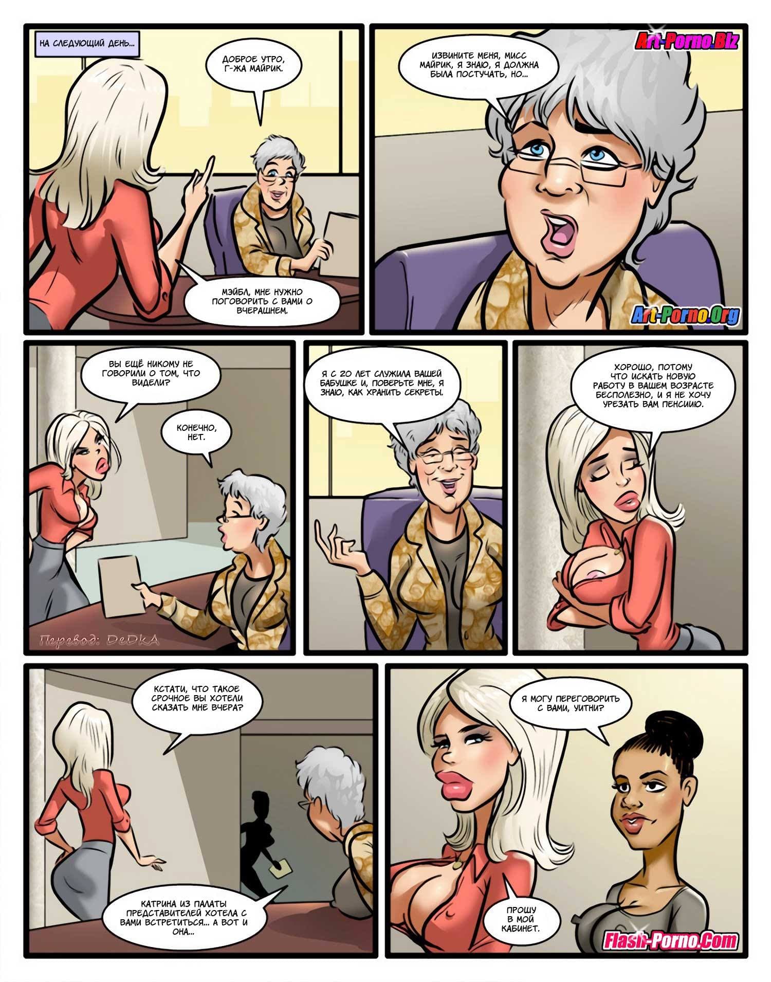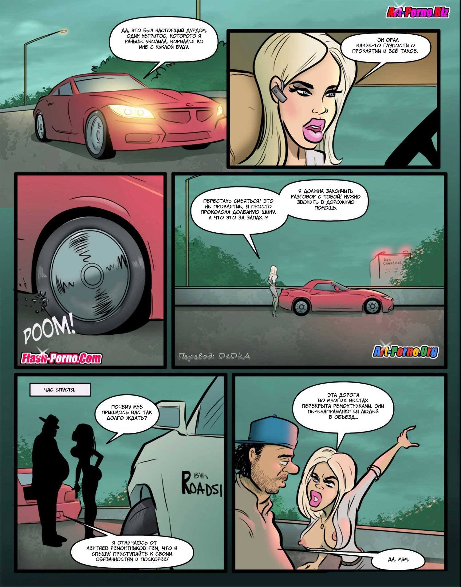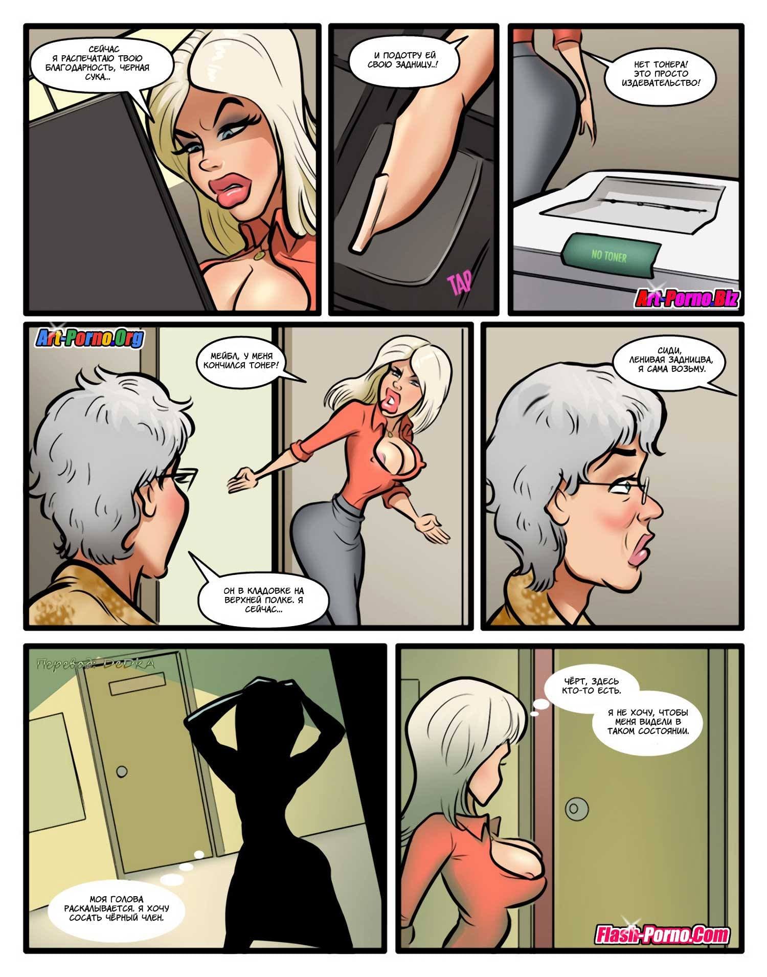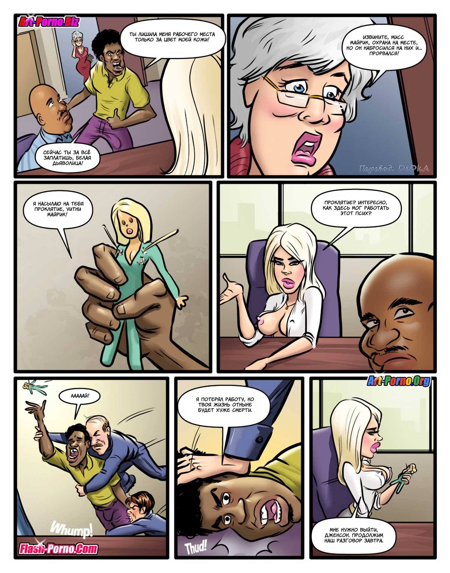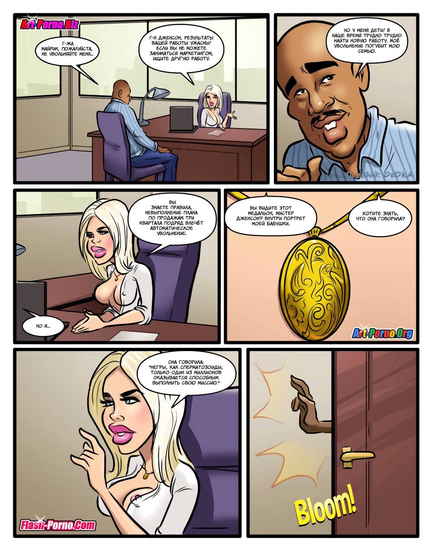 Раз вы здесь, то точно обожаете читать комиксы про секс, не так ли? История данного сюжета начинается с того, что одной дамочке по наследству от бабули досталась крупная компания. Став руководителем, наша героиня стала направо и налево увольнять работников с черным цветом кожи, так как она страдала расовыми предрассудками и считала негров слишком глупыми и очень ленивыми. Такое ее поведение длилось до тех пор, пока обиженный чернокожий сотрудник не проклял обнаглевшую леди. С тех пор белокожая дамочка перестала плохо относиться к неграм, и даже почувствовала особую тягу к ним, хотя будет правильнее сказать к их твердым и большим членам.
