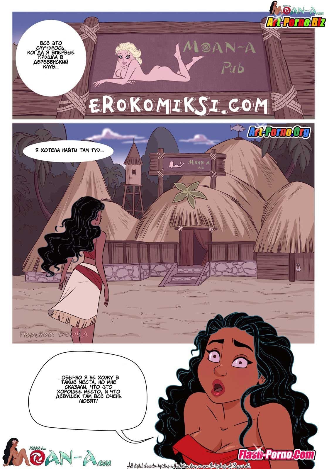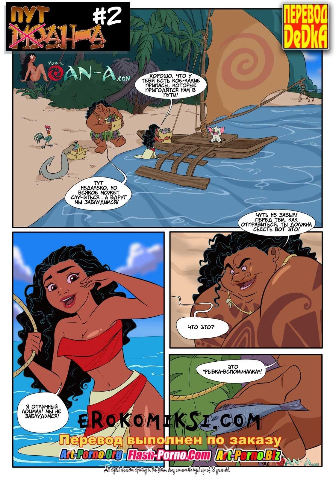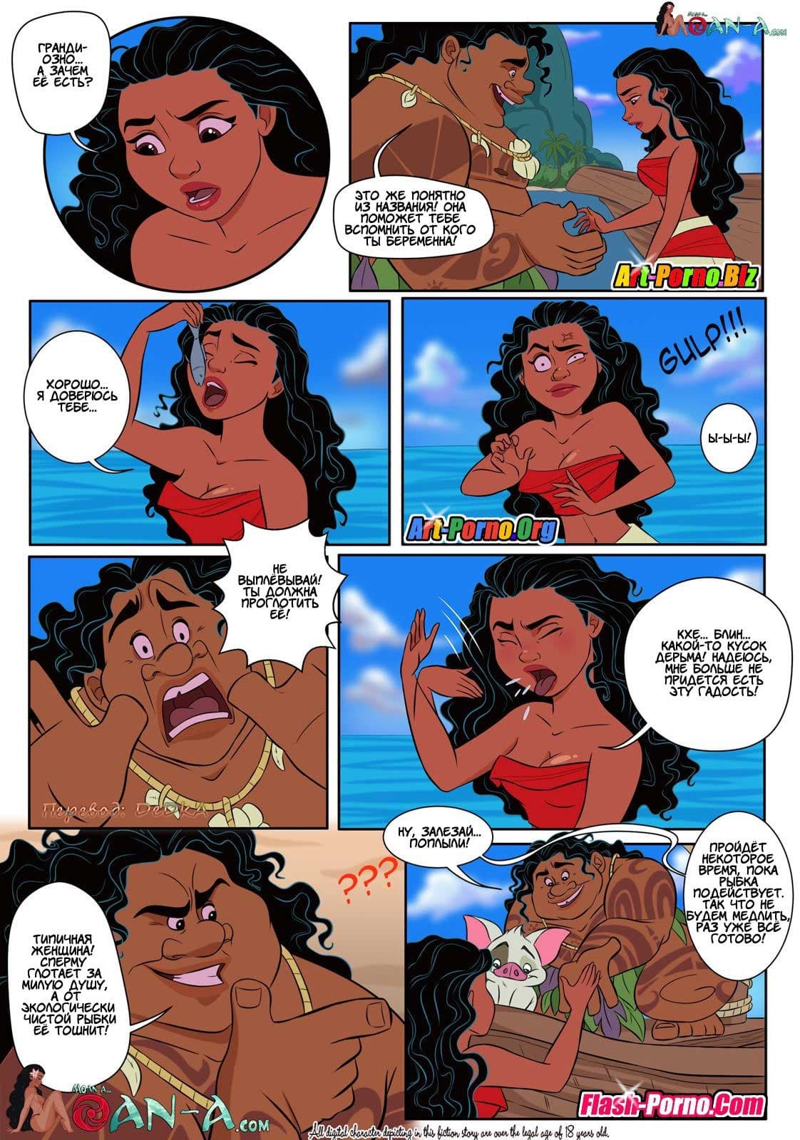 Секс комиксы Моана продолжаются. Вскоре после того, как Путана – Моана с ужасом узнала, что она не только не невинна, но еще к тому же и беременна, (да, представляете, бывает и такое) ей, конечно, стало очень интересно узнать, а кем является папаша ее будущего ребёнка? На помощь в этом вопросе ей пришёл все тот же полубог Мауи. Он дал путане съесть «рыбку – мозгоправку». Правда, для этого Моане пришлось и рыбку съесть и на х… сесть, ну, сами помните… Зато результат был потрясающий. Девушка, вдруг, всё вспомнила! Правда, картина открылась ей очень неприглядная…