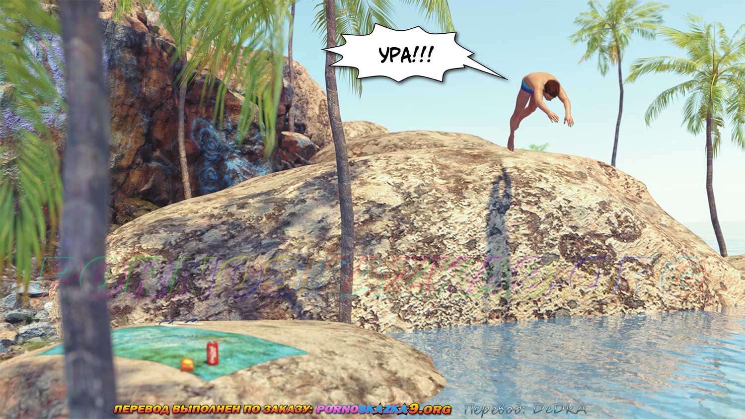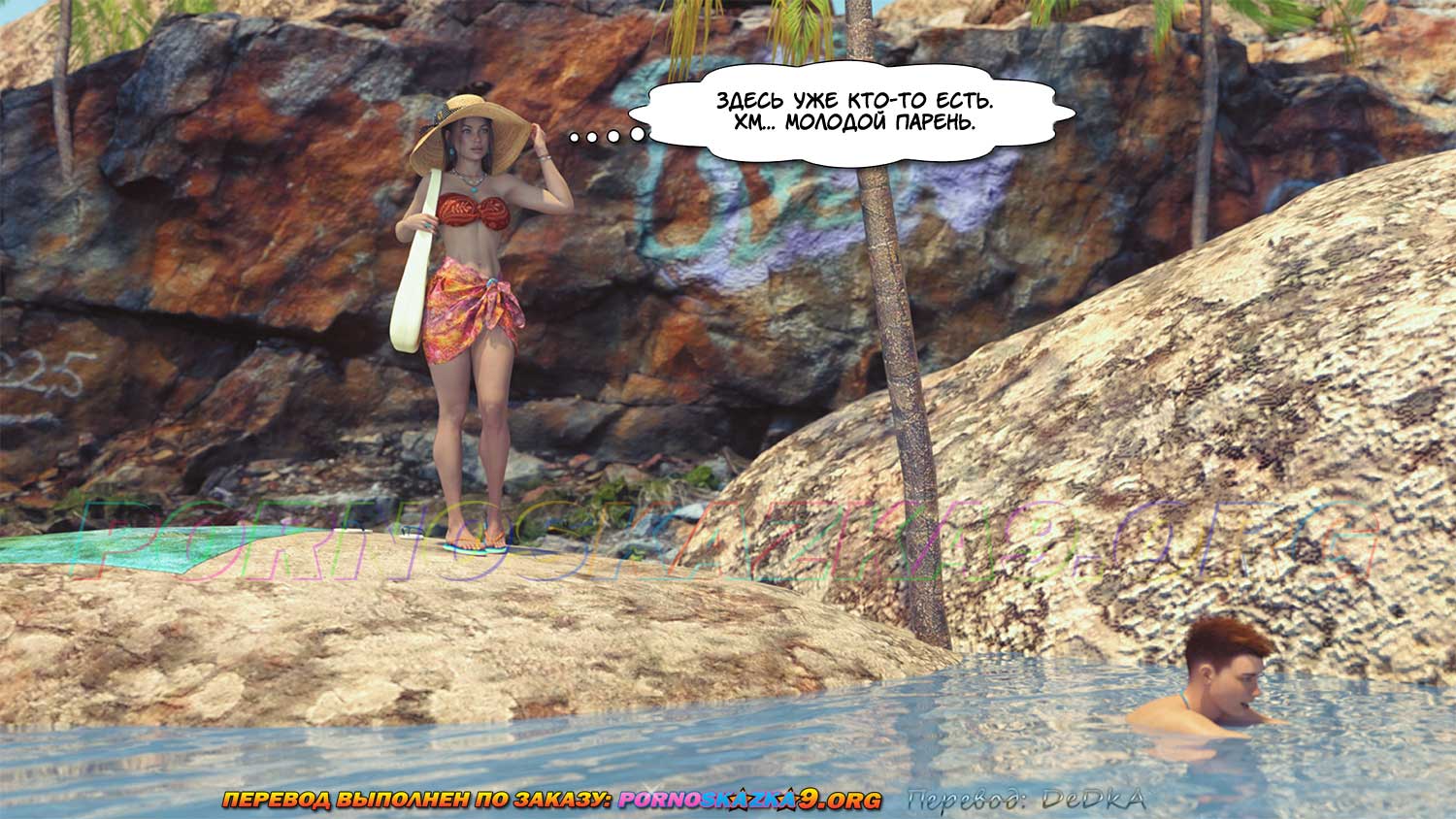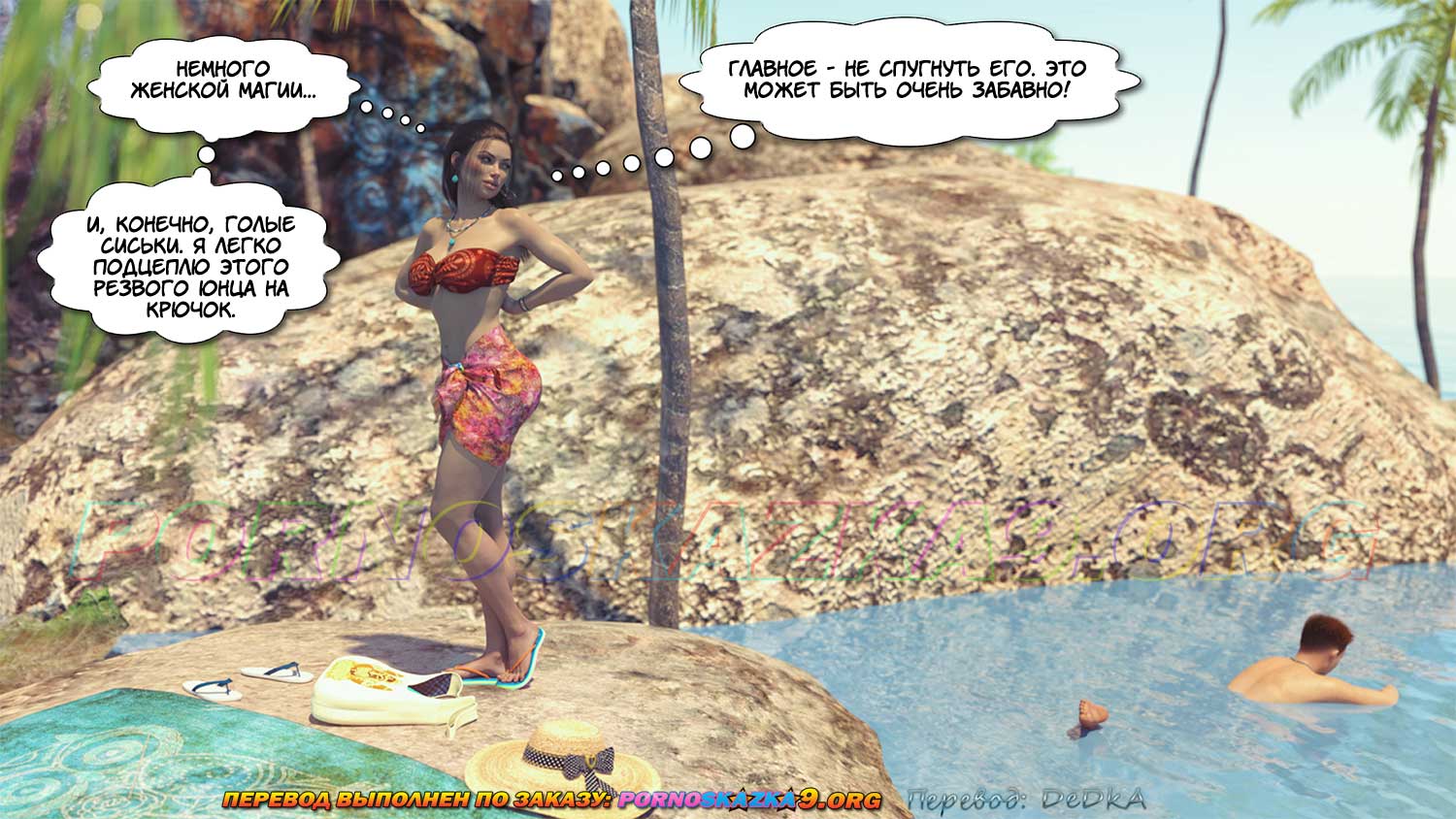 Порно комикс Райское место. Часть 1. Все прямо, как в порно комиксах: Пляж, незнакомка, которая просит натереть солнцезащитным кремом, но… Это только начало такое такое, какое бывает в простеньких порно комиксах.