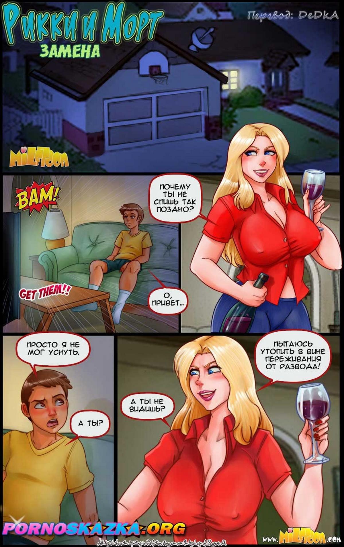 Порно комикс Рикки и Морт. Замена. Супруга хочет второго ребенка, а ее муж совсем не желает кормить еще один рот. Конфликт интересов. Дело пахнет керосином, а точнее, разводом. Женщина пытается утопить свое плохое настроение в вине, и в пьяном виде совершает опрометчивый поступок… Похоже у зрелой героини все-таки будет второй ребенок, но не от мужа…