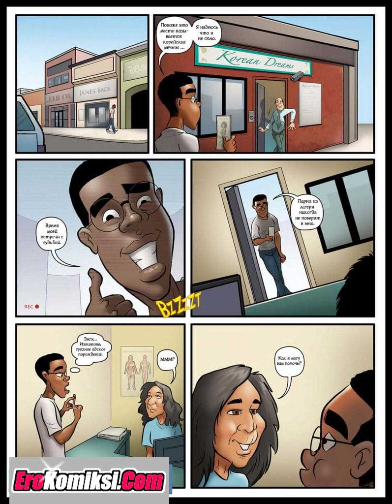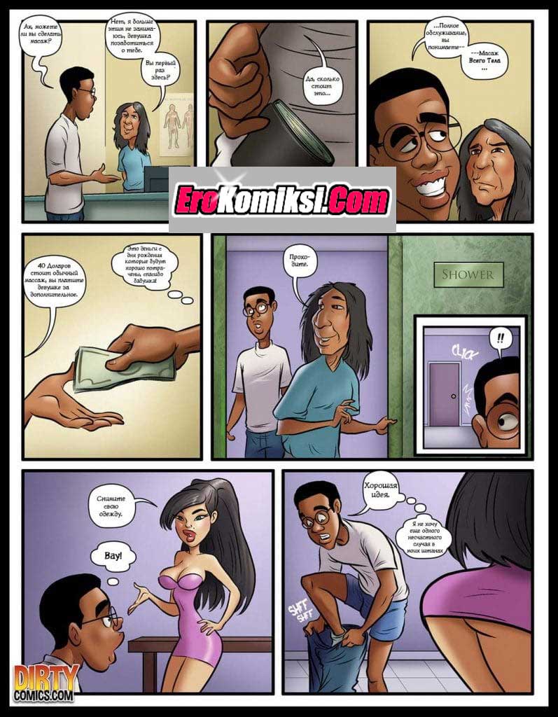 Порно комикс Счастливый конец. Чернокожий парень пошёл на массаж к азиатской девушке. Она разделась до гола и начала массировать его своим сексуальным телом. Парень на ожидал такого, член стоял как железный прут.
