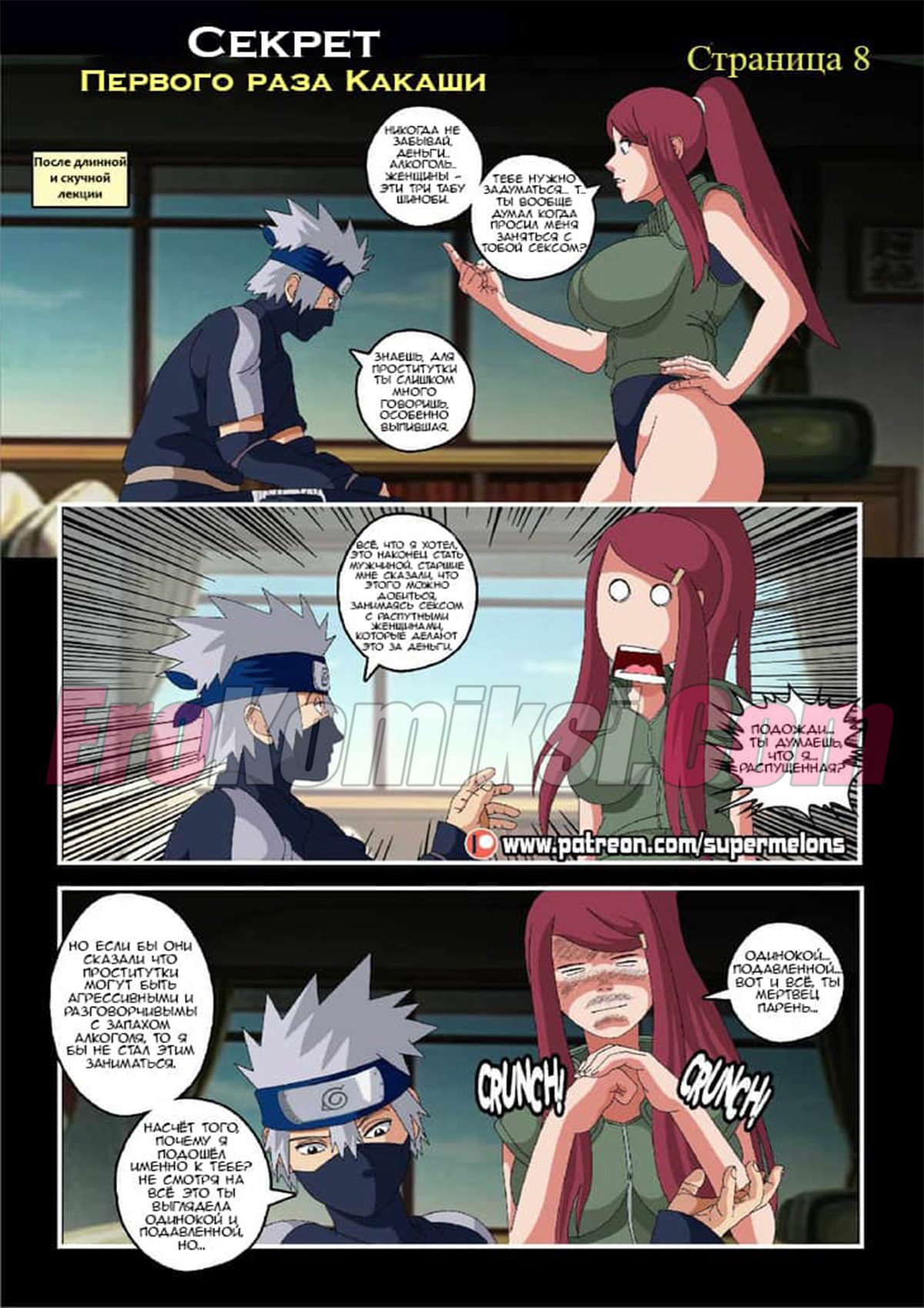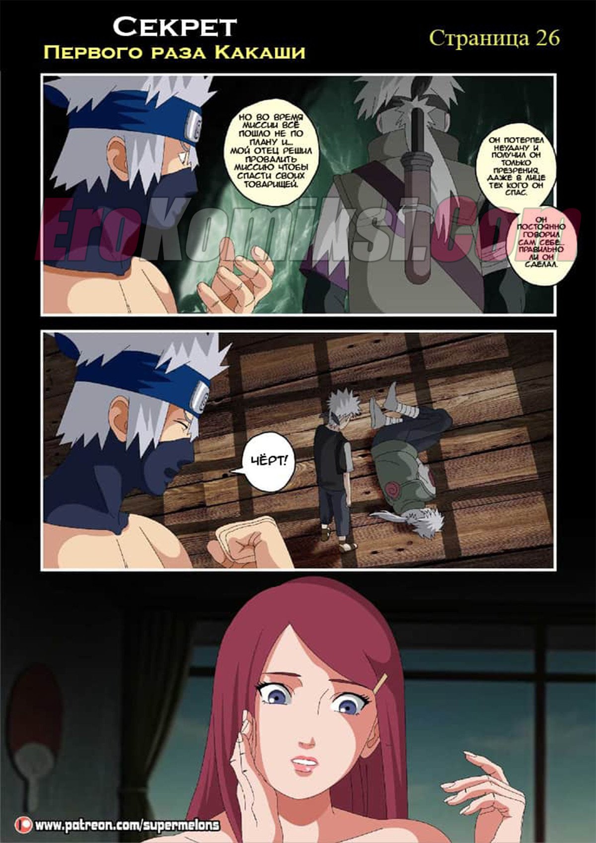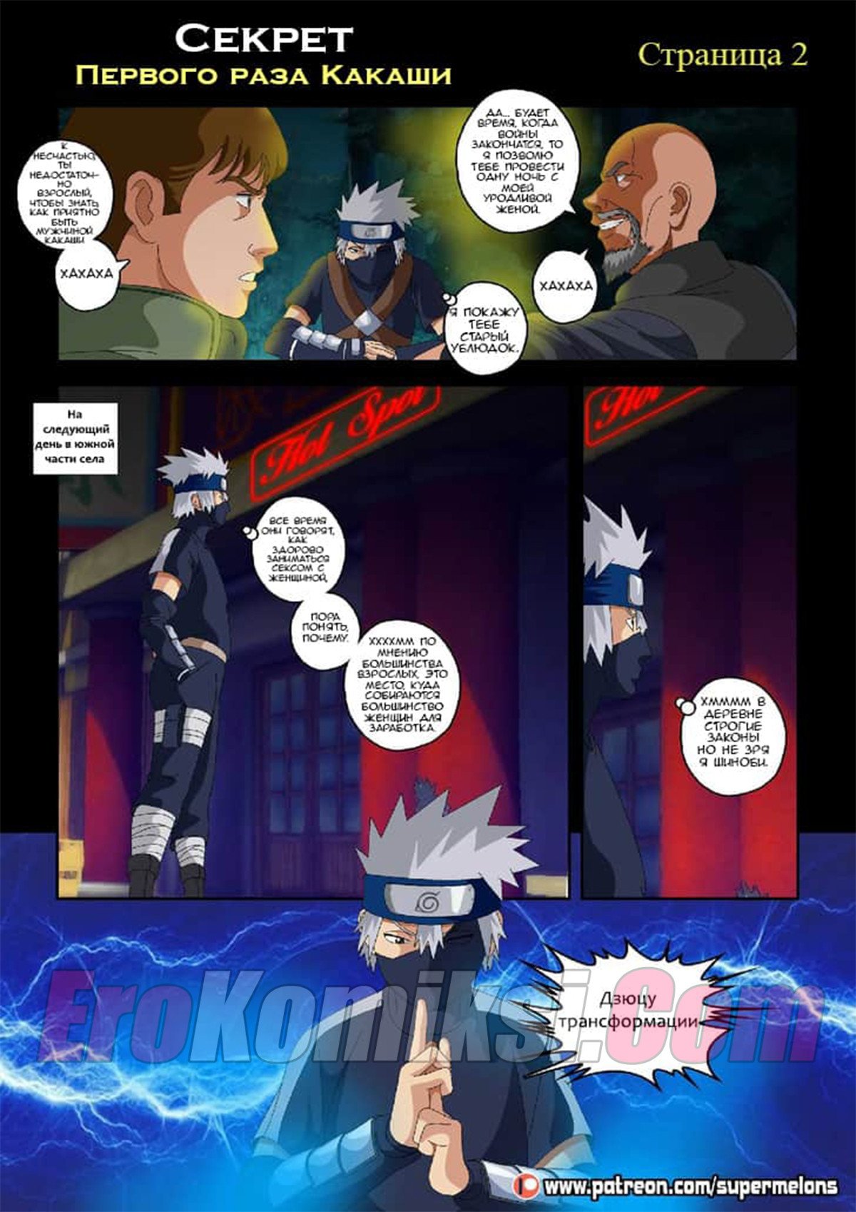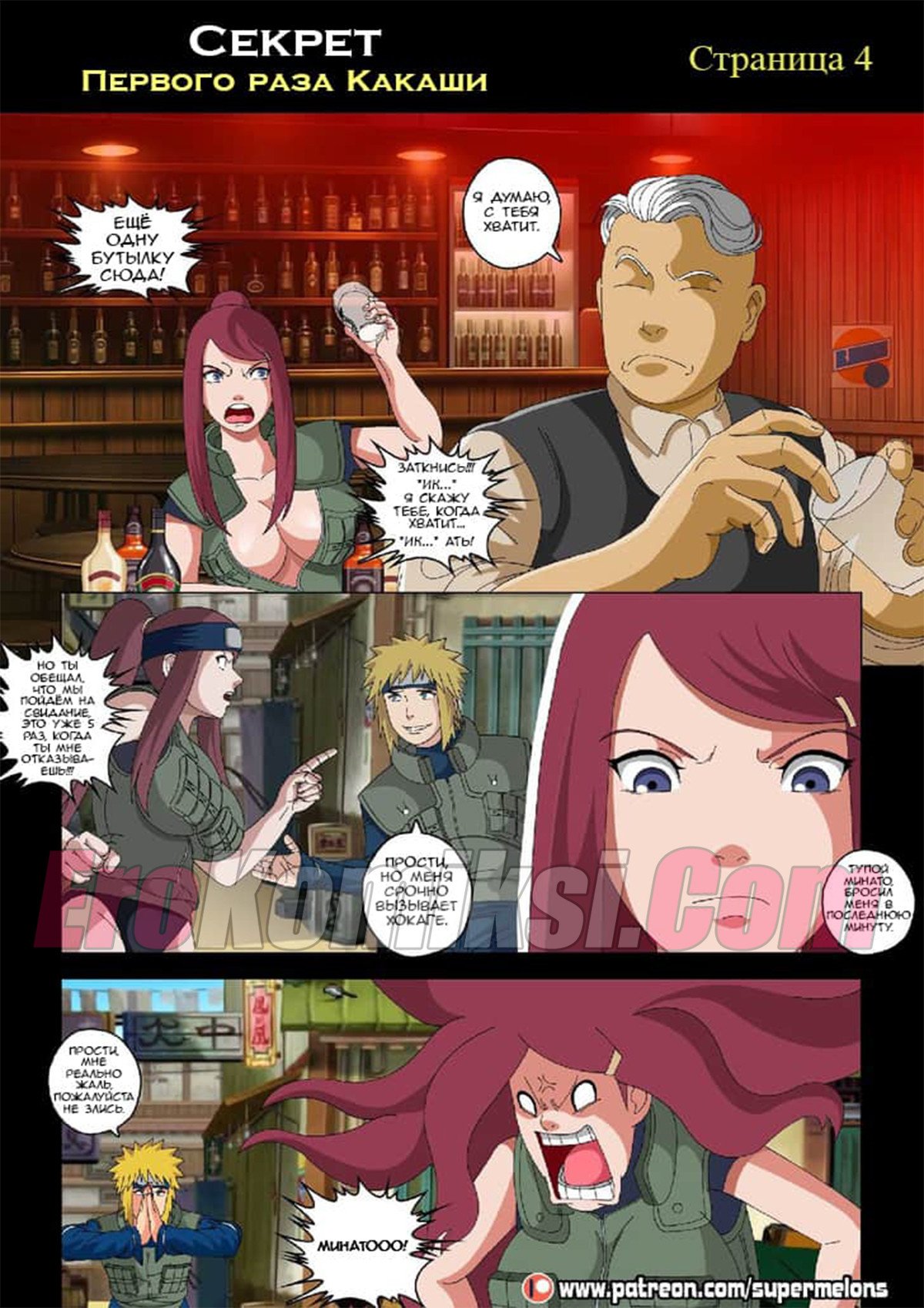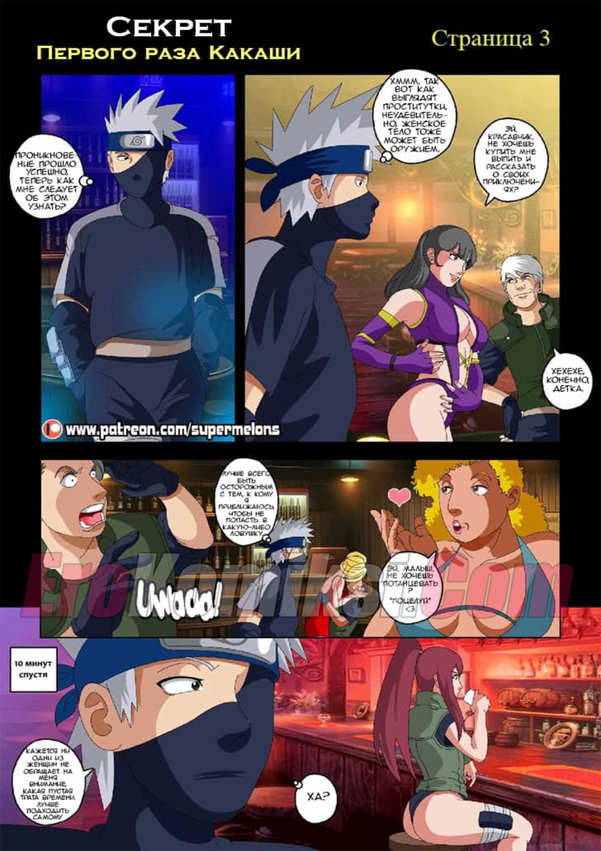 Сидя ночью у костра Какаши слушал истории своих знакомых и их желание пойти в «Красный фонарь» и трахнуть пару сучек. Какаши не выдержал и отправился туда, чтобы наконец-то трахнуть девушку. Придя в бар он увидел, одинокую даму, подумав, что эта проститутка и предложил ей совершить половой акт… А что была дальше читайте в комиксе…