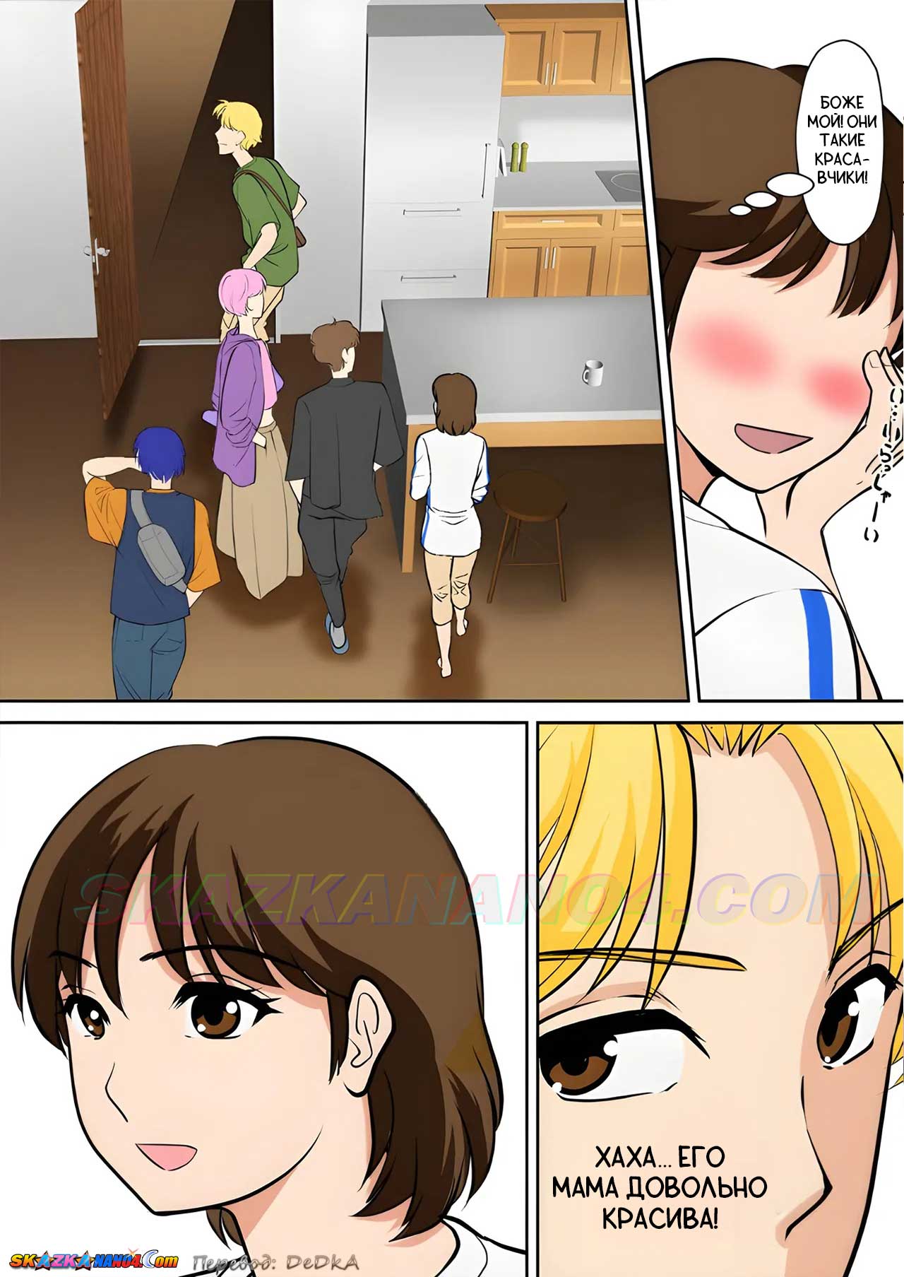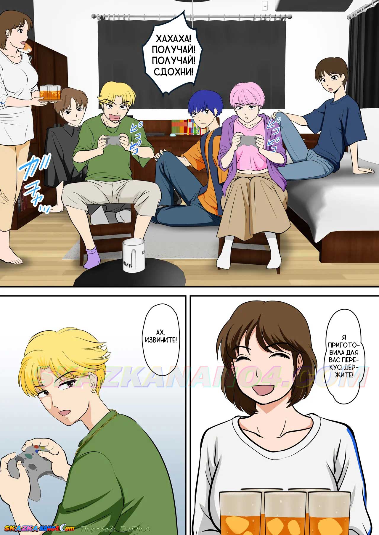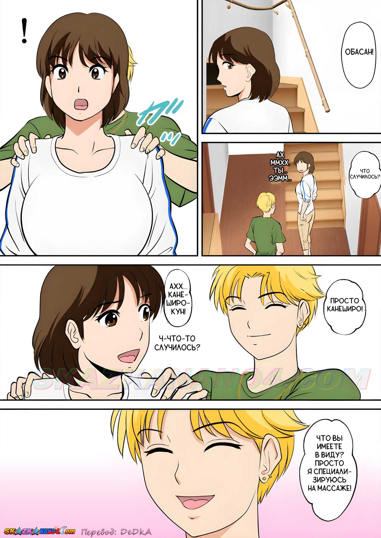 Порно комикс Сексуальная мамочка друга. Шохей привел своих друзей к себе домой, чтобы немного развлечься и отдохнуть. Как только его друзья увидели его горячую маму Оба-сан, у них сразу же проявился сильный животный интерес. Самый хитрый из парней Канеширо заманил похотливую милфу на групповой секс, под предлогом специального массажа…