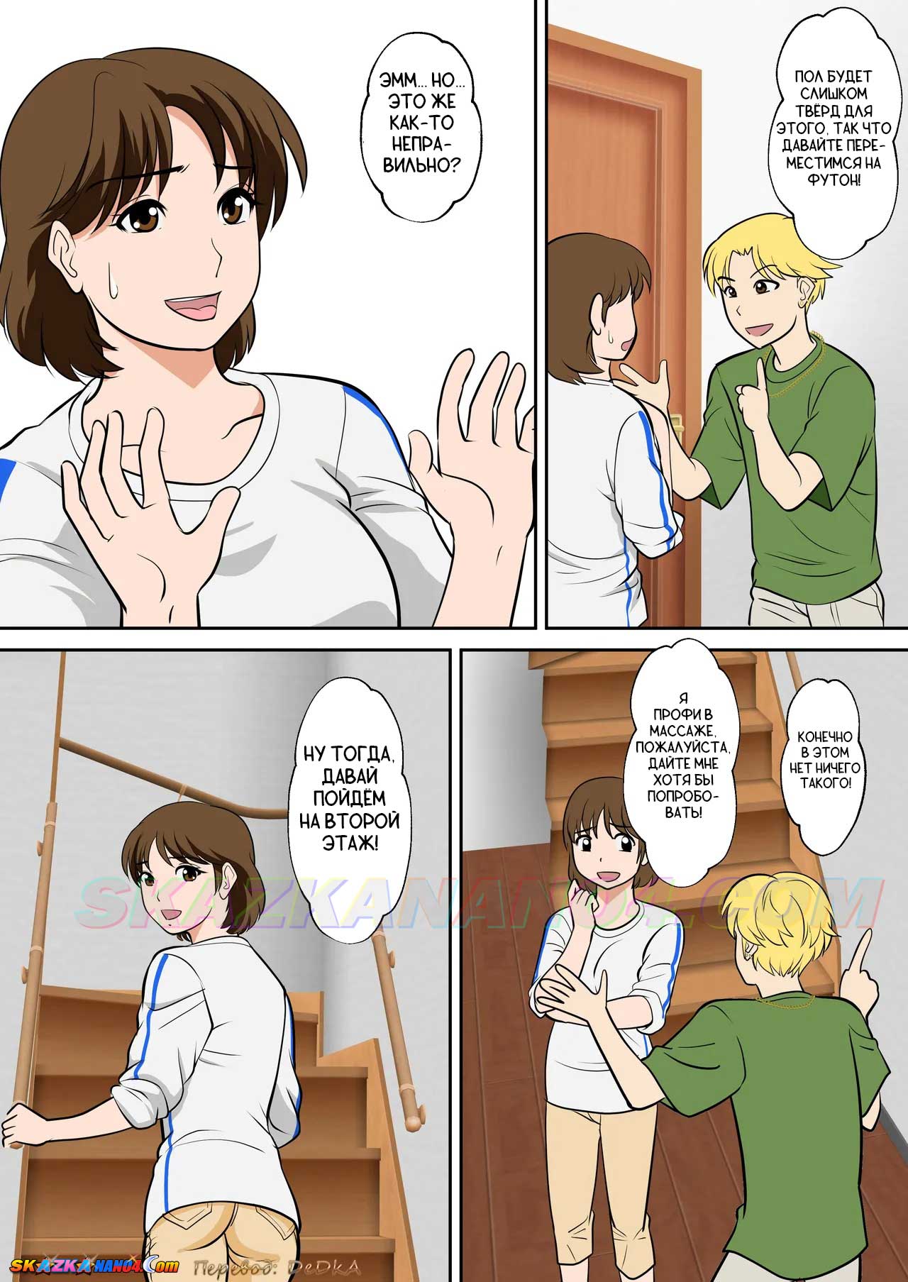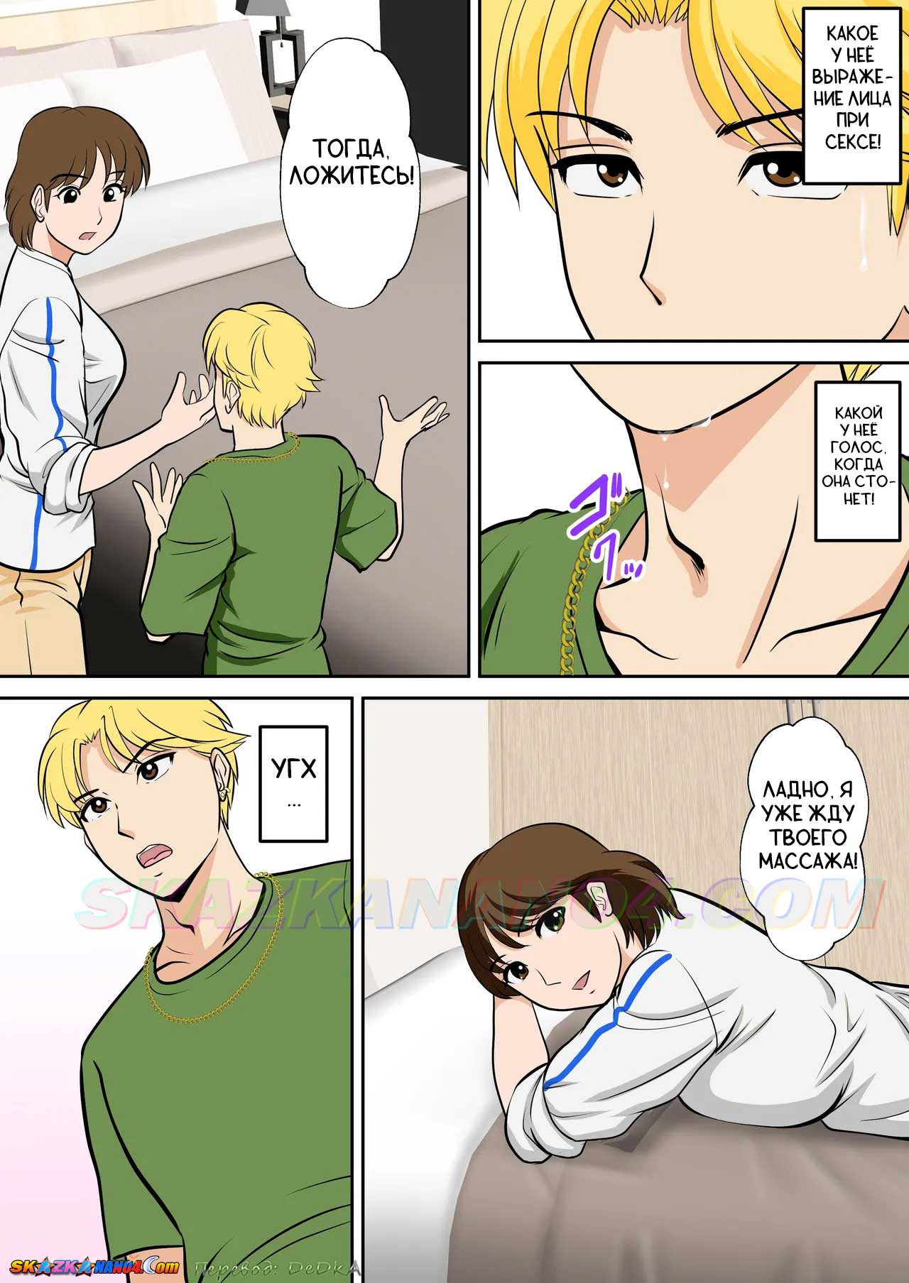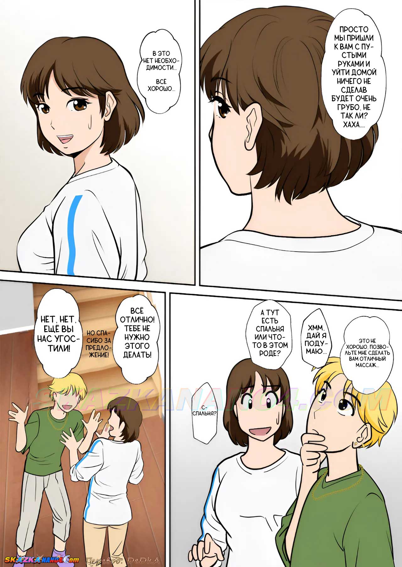Порно комикс Сексуальная мамочка друга. Шохей привел своих друзей к себе домой, чтобы немного развлечься и отдохнуть. Как только его друзья увидели его горячую маму Оба-сан, у них сразу же проявился сильный животный интерес. Самый хитрый из парней Канеширо заманил похотливую милфу на групповой секс, под предлогом специального массажа…