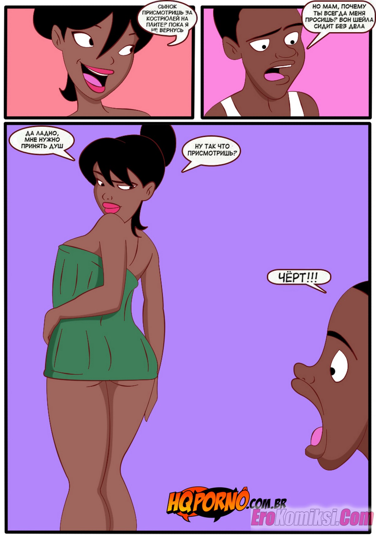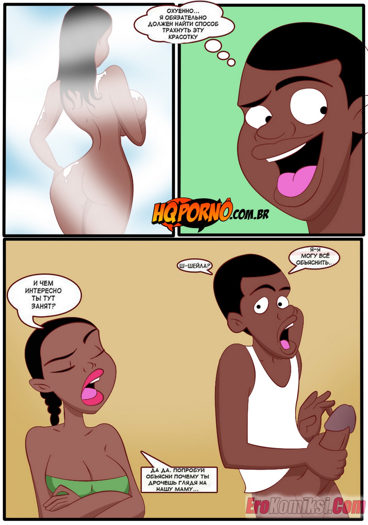Порно комикс Семейка черных. Часть 1. Пойман с поличным. Familia Black. HQPorno. TZComiX Сисястая милфа брюнетка попросила сына присмотреть за кастрюлей на кухне, а сама отправилась в душ. Парень стал за ней подсматривать и дрочить хуй, а мамка его спалила и стала у него сосать.