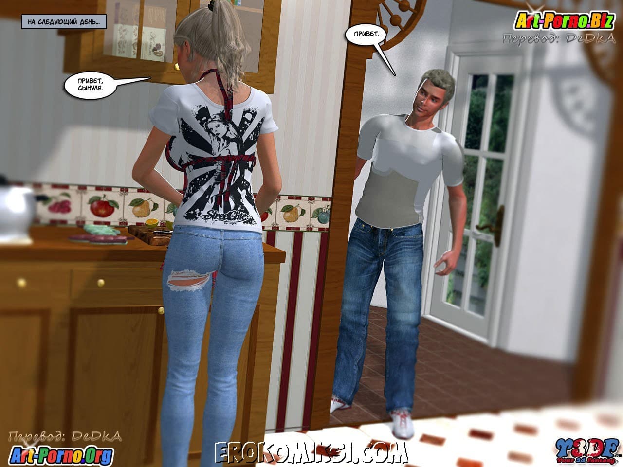 Порно комиксы семейка флауэрс после длительного перерыва дарят своим поклонникам новое продолжение! Вовсю идет подготовка к предстоящей пышной свадьбе. Переживания, связанные с данным событием так овладели сознанием парня, что ночью ему приснился жуткий кошмар. Резко проснувшись в холодном поту, молодой человек захотел перекусить, дабы развеяться от неприятного сна, но по дороге на кухню, он случайно заглянул в спальню родителей, и тут…