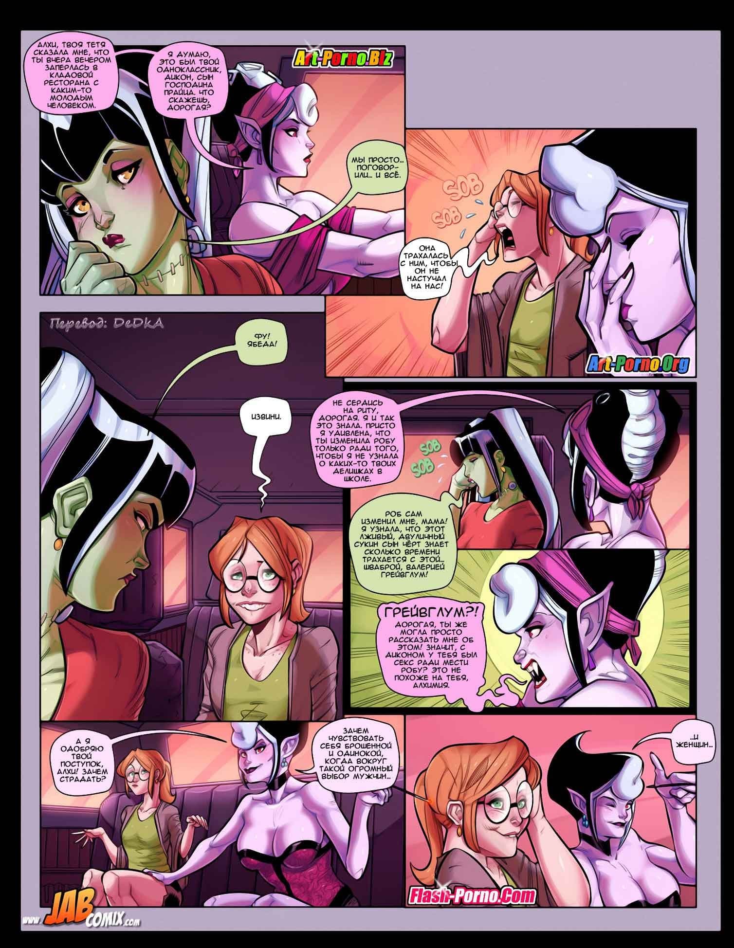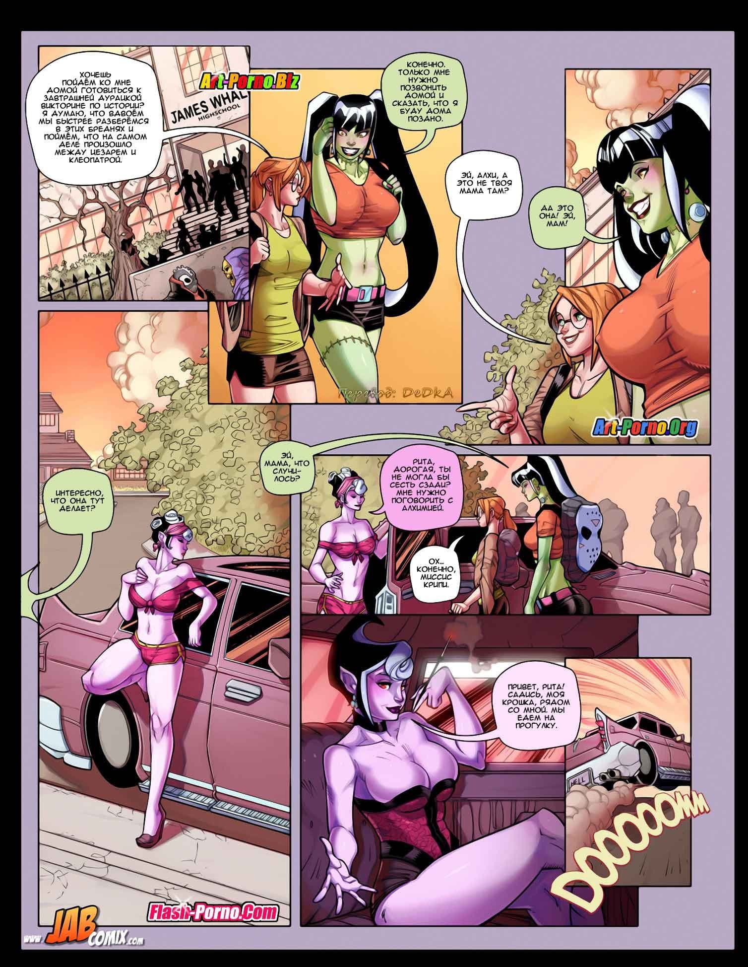 Порно комиксы Семейка Крипи продолжаются! В 4 части сюжета вы узнаете о том, что миссис Крипи узнает правду про то, что во время пребывания в ресторане её дочь Алхимия изменила своему парню, занявшись сексом с сыном директора школы, Диконом Прайц. Пожелав выяснить причину данного поступка, женщина встречает дочь после занятий и проводит с ней воспитательную беседу. Но, выяснив, что у Алхимии были причины на измену, мамаша не ругает дочь, а, даже наоборот, берет с собой в злачное заведение, где присутствует много симпатичных мужчин…