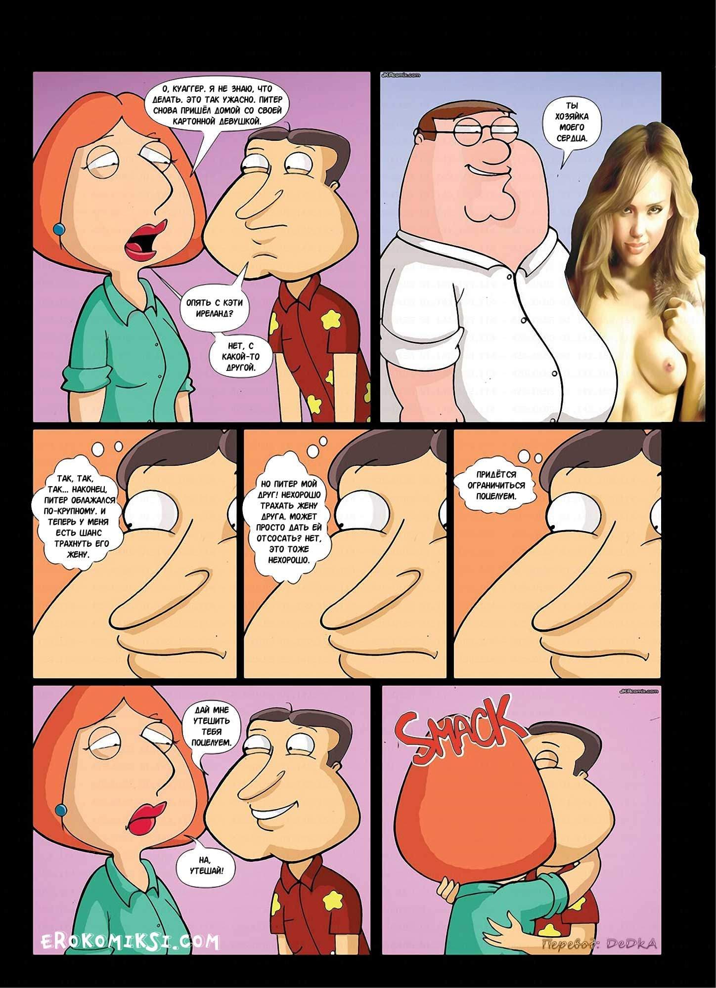 Порно комикс Семейный пирог расскажет историю о том, что Лоис едва не впала в депрессию от горя, когда Питер принёс домой картонную любовницу. Ладно бы резиновую, а то картонную! Расстроенная такой оскорбительной изменой мужа, Лоис пожаловалась в жилетку соседу, и у того появилась идея! Он решил утешить несчастную соседку…