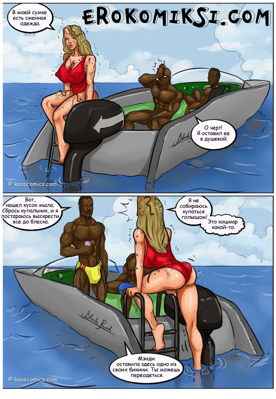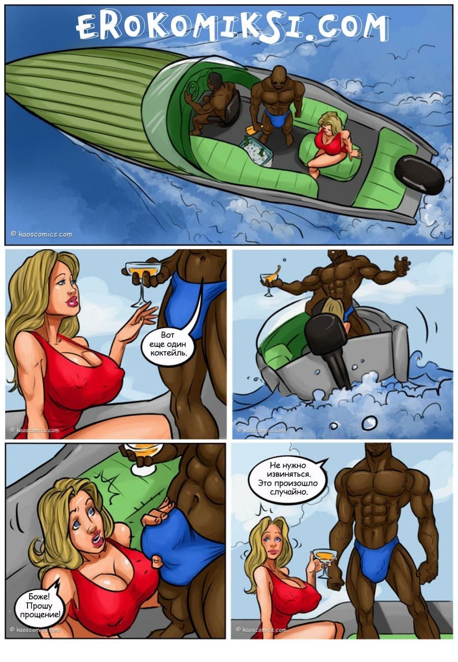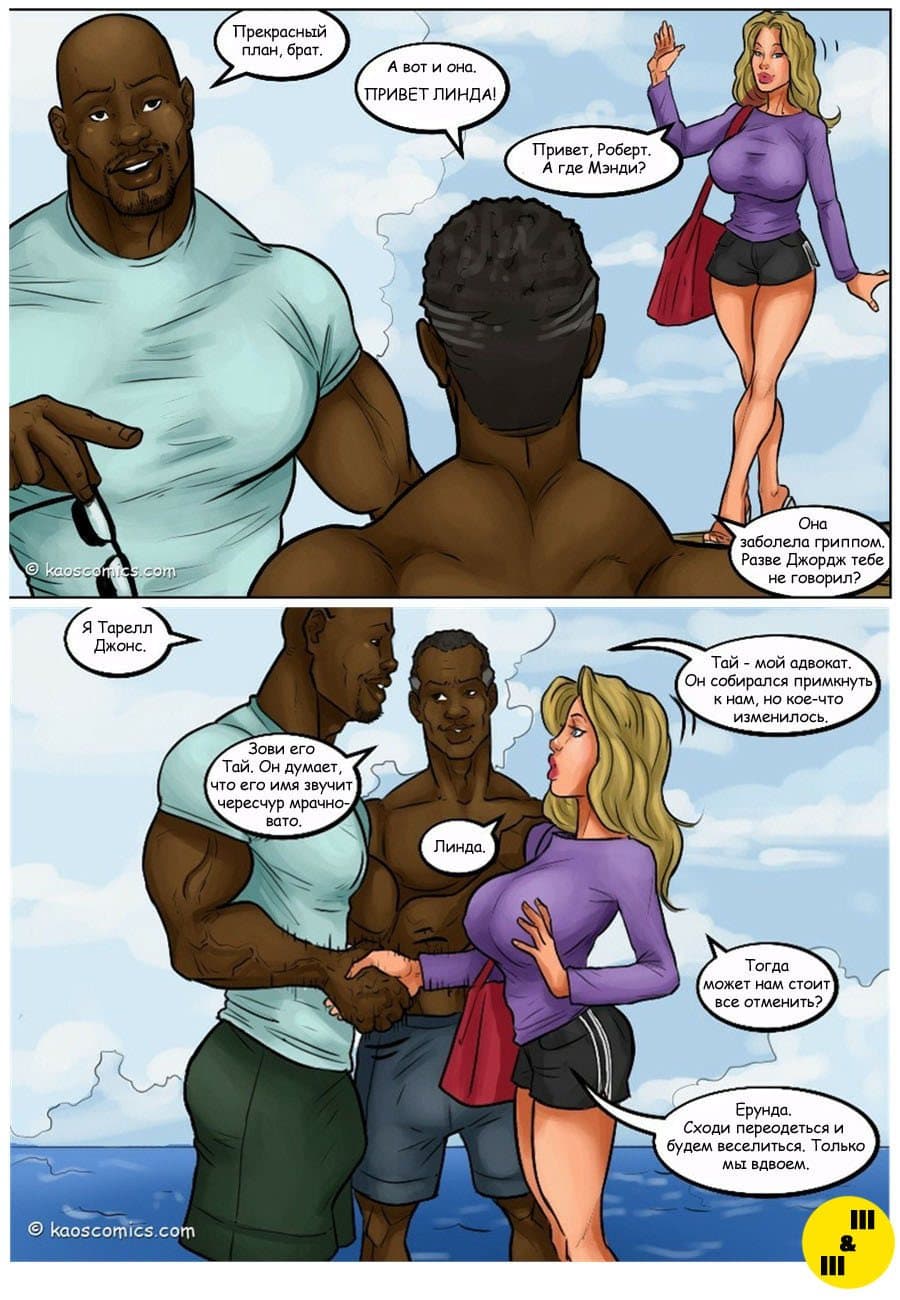 По вашим просьбам публикуем порно комиксы про жену – красивую замужнюю блондинку со звучным именем Линда. Она кормящая мать, от чего ее сиськи объемны, а соски невероятно чувствительны. Сегодня, по стечению многих обстоятельств, которые произошли, благодаря усердиям начальника мужа Линды Роберта, девушка остается на отдыхе в лодке с двумя крупными чернокожими мужчинами, которые, надо отметить уж очень явно желали сексуального внимания со стороны Линды. Как поведет себя замужняя женщина в компании могучих атлетов с крупнокалиберными стволами?