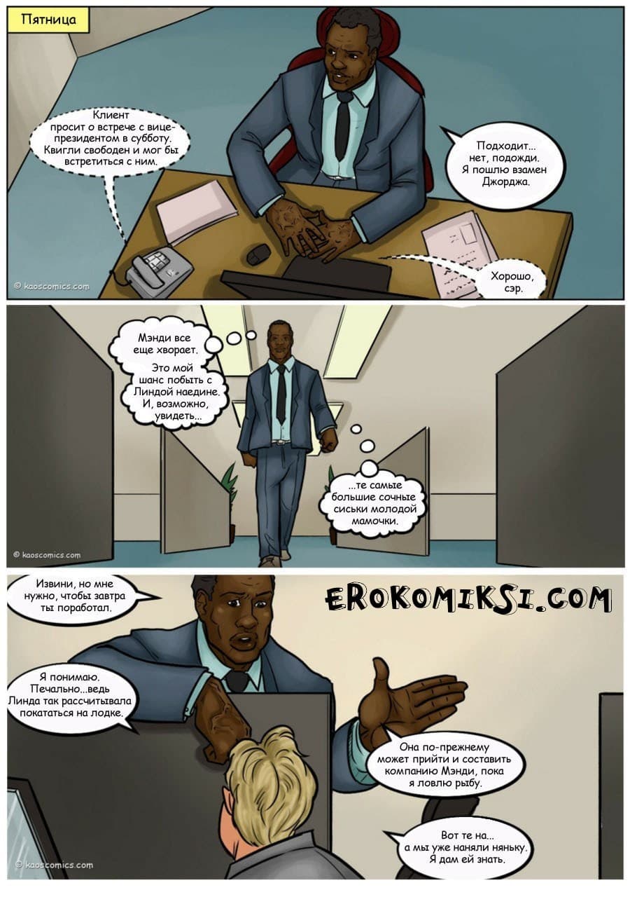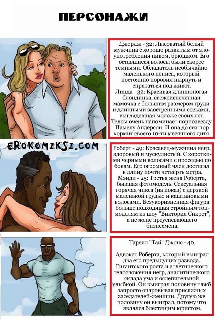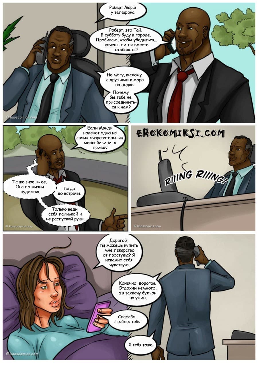 По вашим просьбам публикуем порно комиксы про жену – красивую замужнюю блондинку со звучным именем Линда. Она кормящая мать, от чего ее сиськи объемны, а соски невероятно чувствительны. Сегодня, по стечению многих обстоятельств, которые произошли, благодаря усердиям начальника мужа Линды Роберта, девушка остается на отдыхе в лодке с двумя крупными чернокожими мужчинами, которые, надо отметить уж очень явно желали сексуального внимания со стороны Линды. Как поведет себя замужняя женщина в компании могучих атлетов с крупнокалиберными стволами?