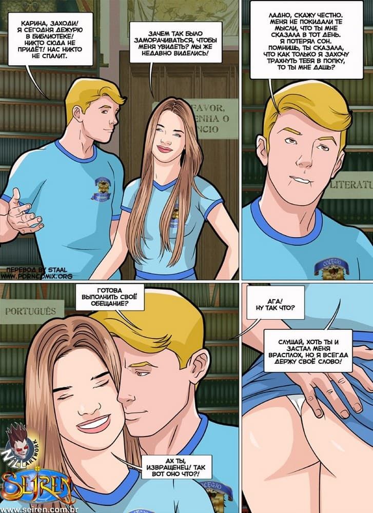 И вновь перед вами любимые эротические комиксы. Как вы помните, предыдущая глава закончилась тем, что Карина давала обещание красавчику Рикарду о том, что позволит ему трахнуть ее попу. Парень этого не забыл и при возможности увлек девушку в библиотеку для анального секса. Но как понимаете, свидетелем любовных утех становится еще одна героиня истории по имени Кэрол, она сестра Карины.
