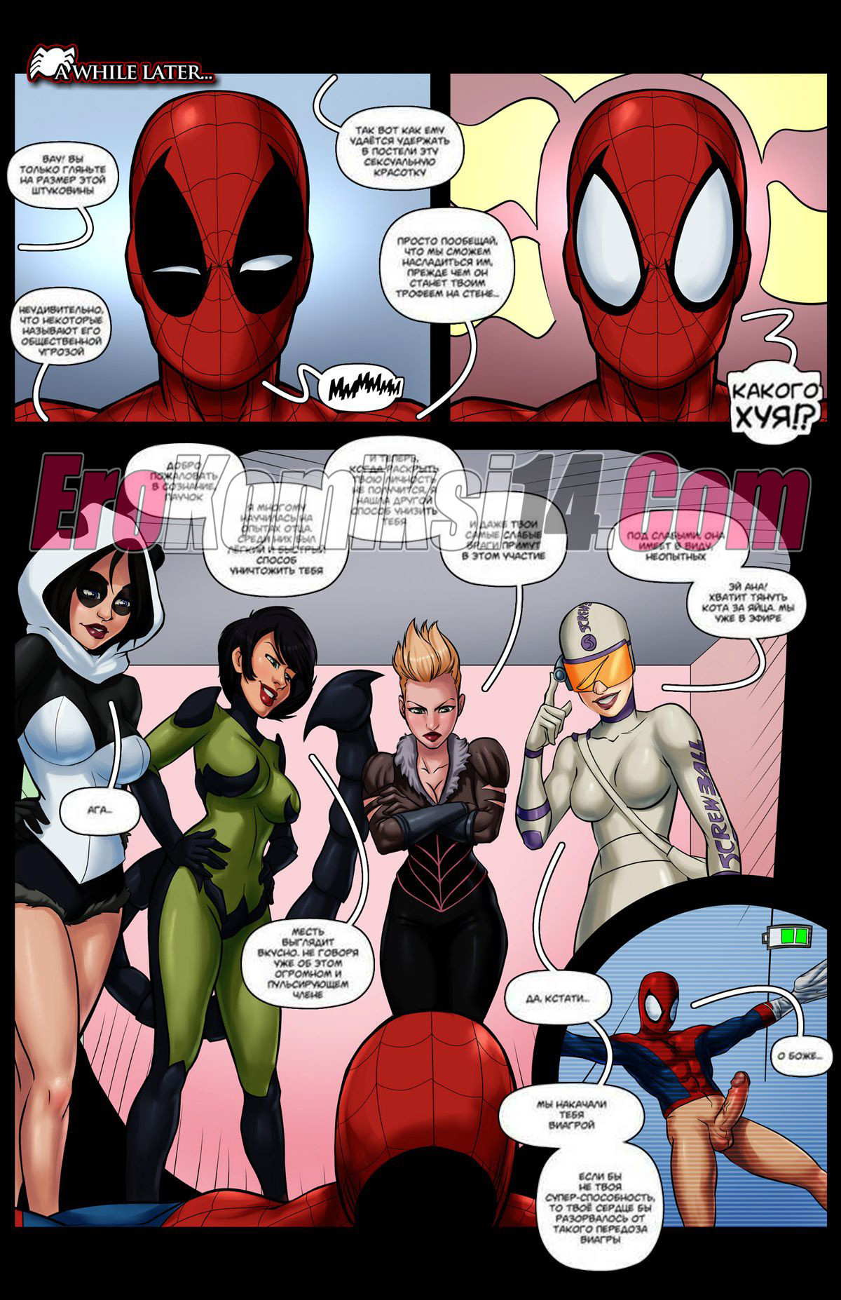 Человек — Паук попал в окружение четырех красоток, которые связали его, чтобы поиграться с его членом и хорошенько повеселиться. Паучок лежал трахаясь с дамочками, не в силах что-то сделать. Но к счастью, его спасли супергероини и решили тоже поебаться с ним.