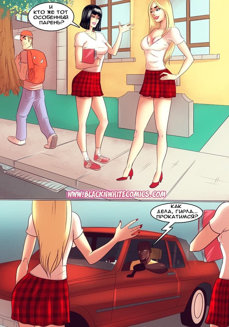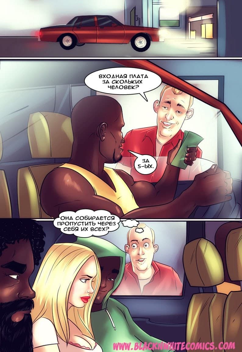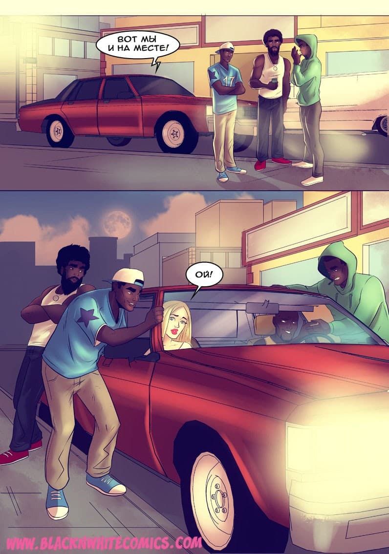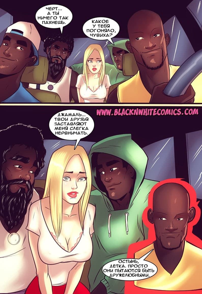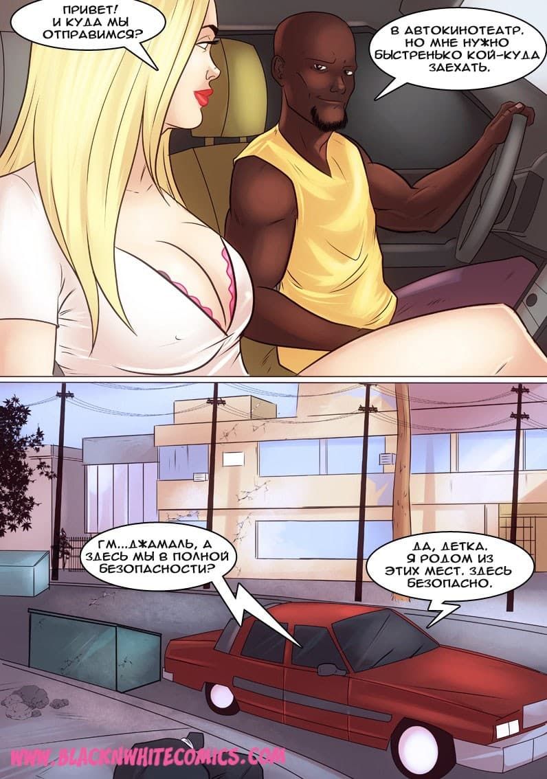 Возбуждающие американские секс комиксы про отношения чернокожих парней и белокожих девушек продолжают радовать глаз. В данной истории одна чикса по имени Гирла начала встречаться с одним негром. И вот, на очередное свидание он пригласил ее провести время в авто кинотеатре. Правда, по пути, к ним в машину подсели друзья чернокожего ловеласа. Они совсем не скрывали своих намерений трахнуть красотку, и даже вытащили перед ней свои большие, готовые к сексу болты…