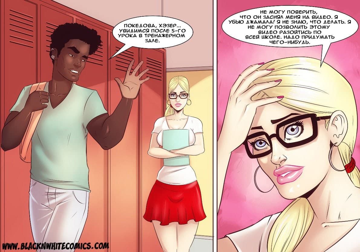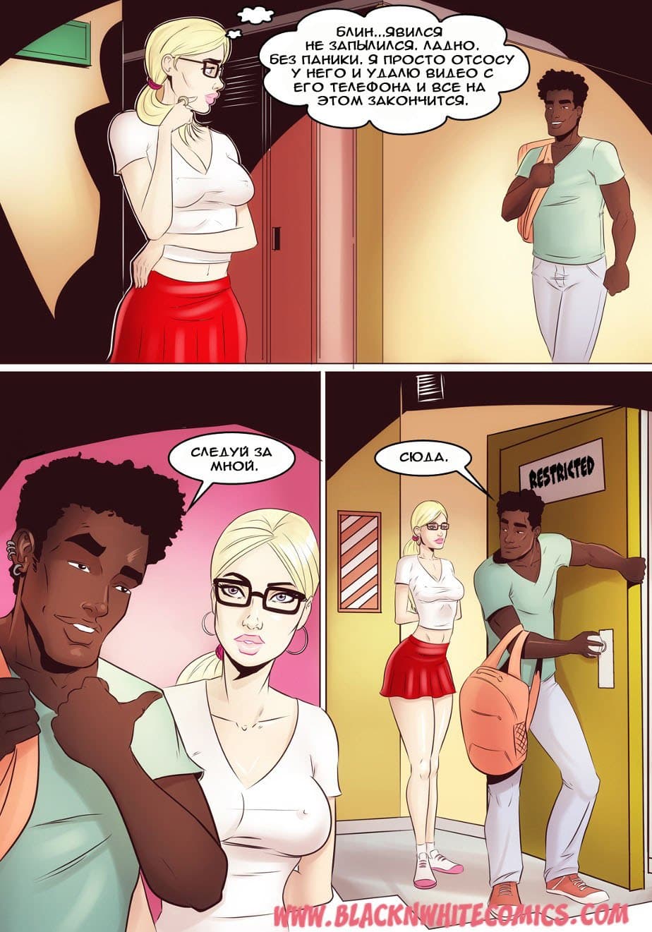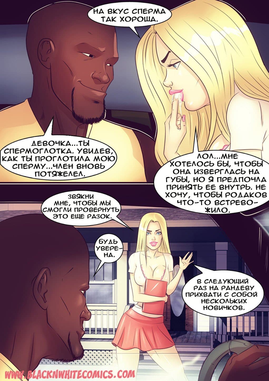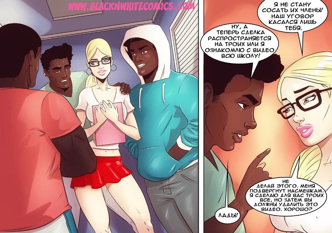 Возбуждающие американские секс комиксы про отношения чернокожих парней и белокожих девушек продолжают радовать глаз. В данной истории одна чикса по имени Гирла начала встречаться с одним негром. И вот, на очередное свидание он пригласил ее провести время в авто кинотеатре. Правда, по пути, к ним в машину подсели друзья чернокожего ловеласа. Они совсем не скрывали своих намерений трахнуть красотку, и даже вытащили перед ней свои большие, готовые к сексу болты…