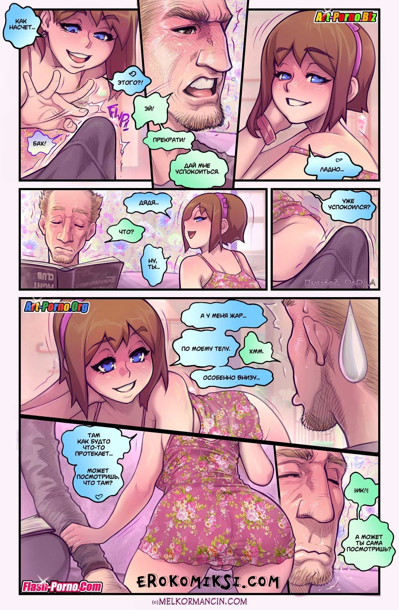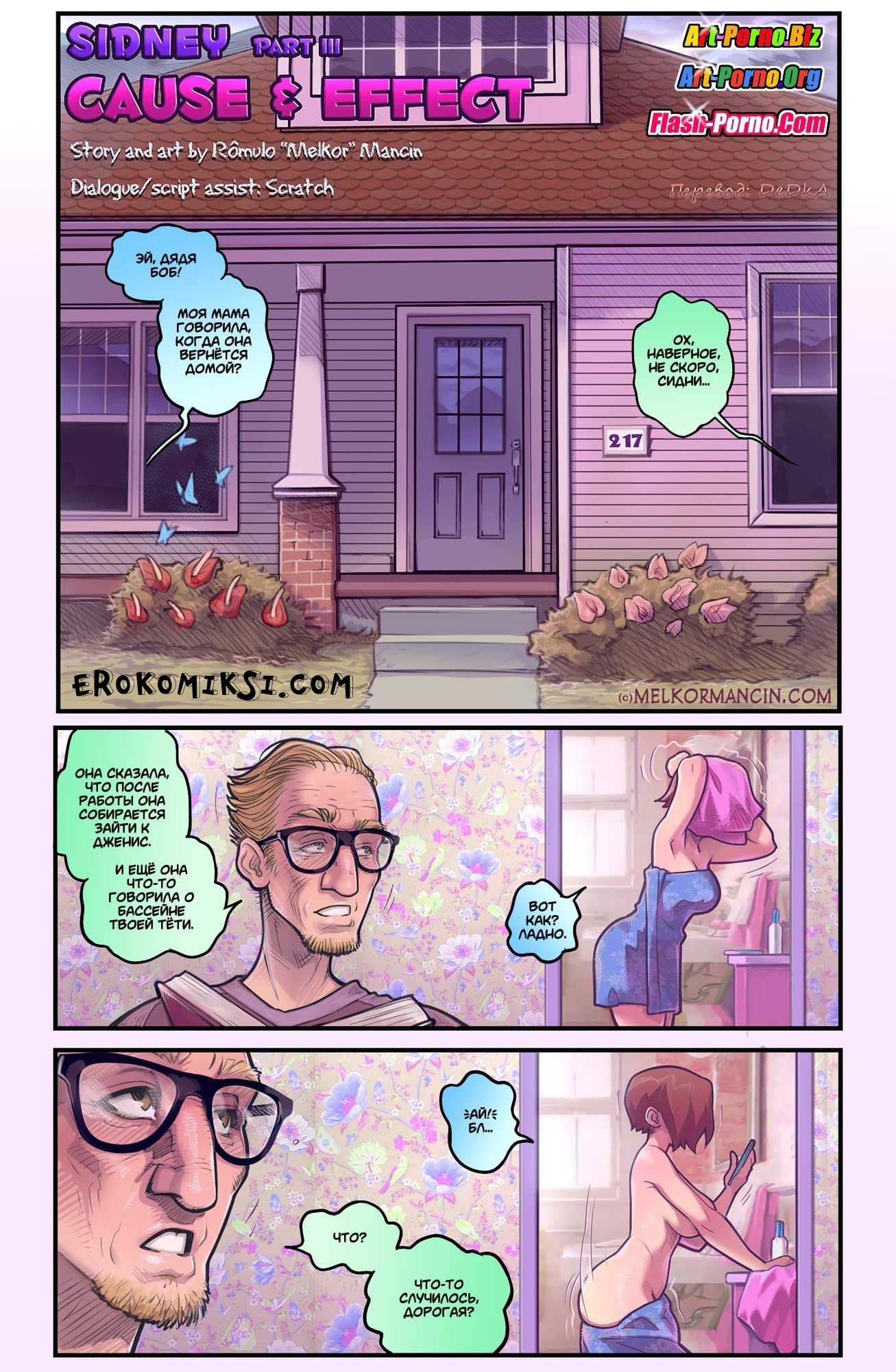 Перед вами порно комикс Сидни 3 часть, и несмотря на то, что уже есть секс комикс «Сидни 3: Хлоя», художники данного творения присвоили и ему вновь порядковый номер 3. Возможно, за этим скрывается какой-то смысл? Ну, да ладно… Итак, мамаша Сидни пошла после рабочего дня к своей сестре Дженис. Девушка Сидни и её похотливый дядя Боб, остались в доме одни. Наша героиня решает не упускать такого отличного случая. Развратник дядя Боб, якобы из моральных соображений, хочет избежать эротических недоразумений с аппетитной племянницей, но как ему устоять перед такой зажигательной красоткой!