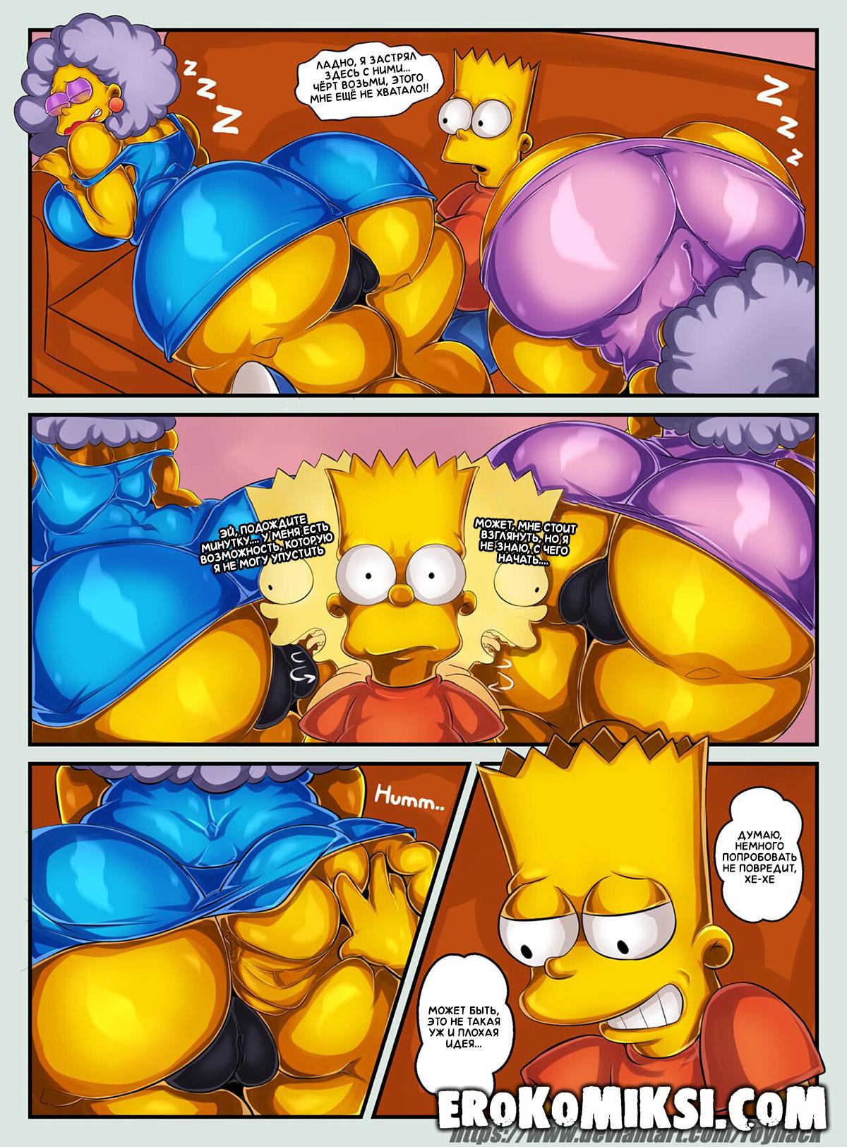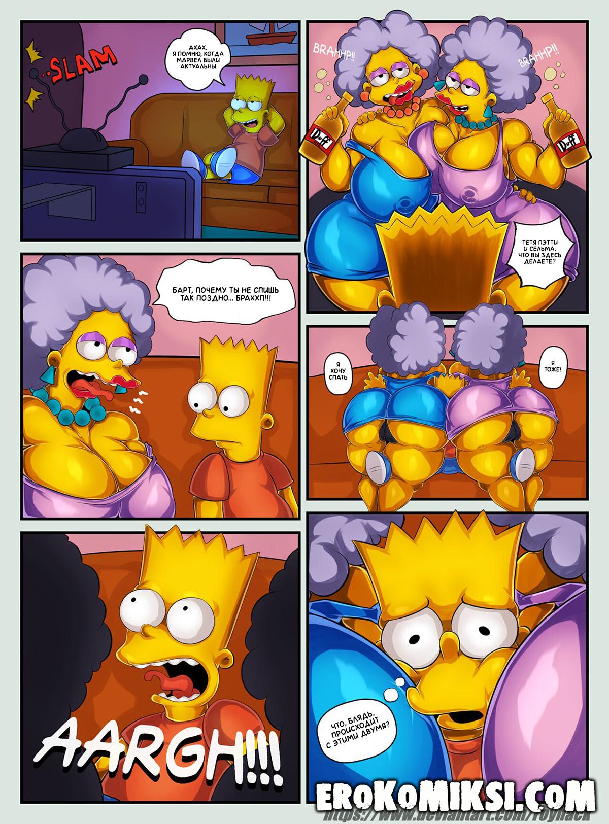 Порно комикс Симпсоны. Блинчики с Клубникой. Барт сидел и смотрел в гостиной телевизор, когда пришли его пьяные тётушки Пэтти и Сельма. Тётушки были настолько пьяны, что уснули прямо на диване и Барт решил воспользоваться моментом и попробовать на вкус киски своих любимых тётушек. Каково же было его удивление, когда он обнаружил, что киска одной на вкус как блинчики, а у второй, как у клубники…