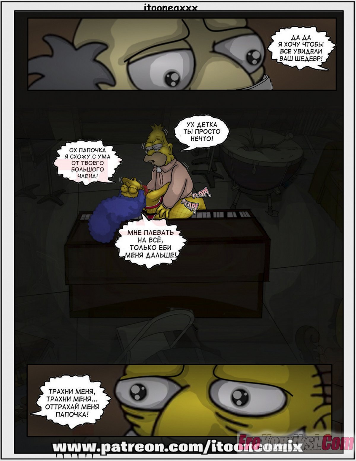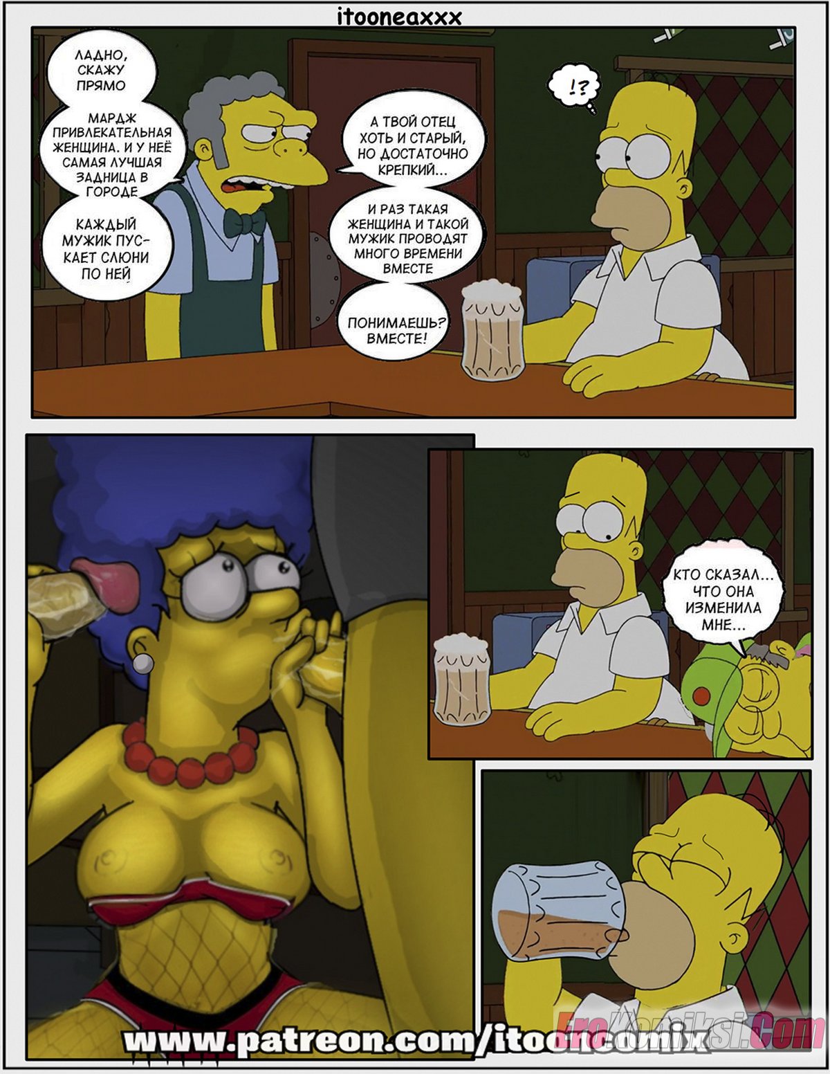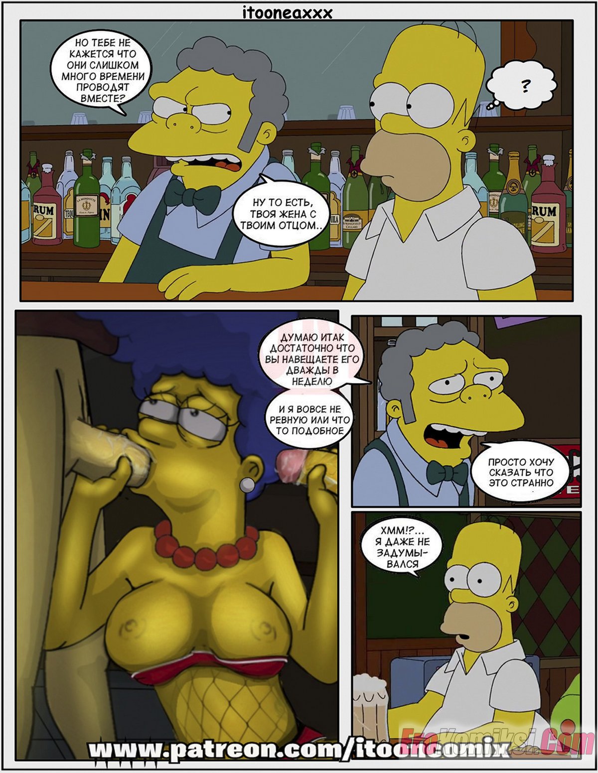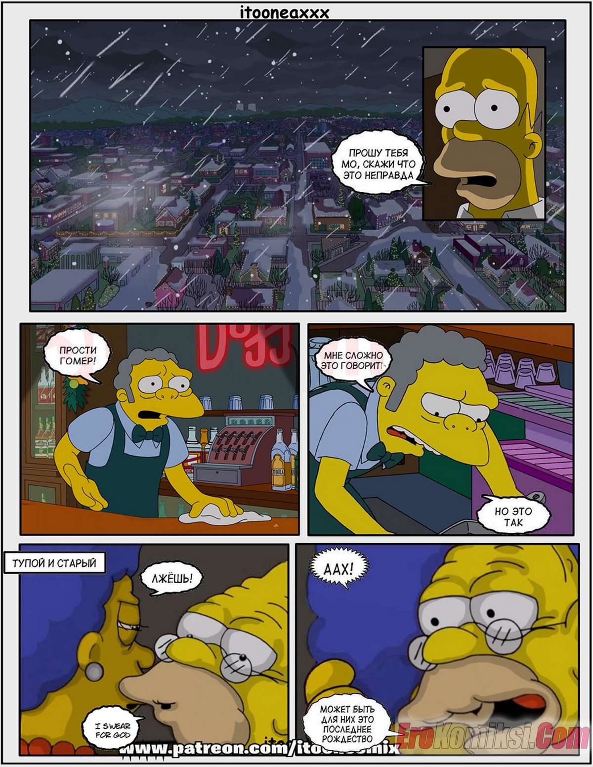 Порно комикс Симпсоны. Часть 12. Рождество Часть 4. Simpsons. IToonEAXXX Сисястая милфа Мардж продолжает получать наслаждение от секса, но не своим мужем, а с его друзьями. Сучка с удовольствием отсасывает в парней, после чего дает им себя выебать во все дырочки.