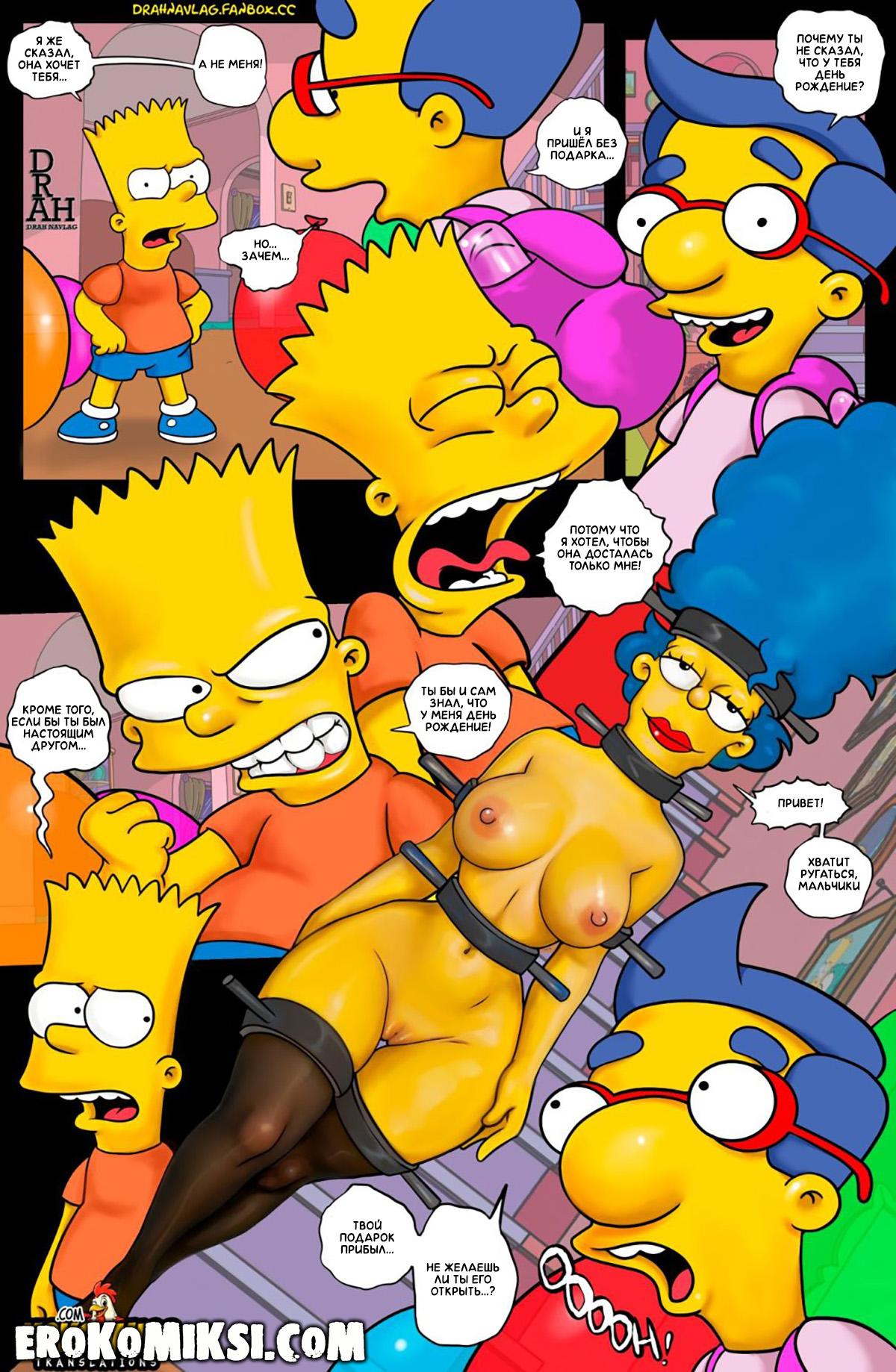 Порно комикс Симпсоны. Перезагрузка. Мардж заходит за Бартом после школы, чем сильно его смущает. Но Милхаус рад появлению мамы друга, так как она очень сексуальна, и при её появлении, Милхаус сразу же возбудился и побежал дрочить…