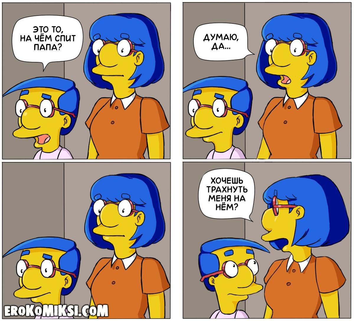 Порно комикс Симпсоны. Помощь Маме. Эксклюзив!!! Версия с Текстом только у Нас!!! У Луан натянутые отношения с её мужем Кирком и они почти не разговаривают, не говоря уже о сексе, а горячей милфе очень требуется сексуальное удовлетворение и Луан обращается с этой проблемой к своей подружке, Мардж. Не долго думая, Мардж предлагает Луан совратить её озабоченного сыночка, Милхауса. Луан следует совету подруги и теперь, у Луан нет недостатка в сексе, ведь Милхаус трахает её при первом удобном случае и сполна удовлетворяет все её потребности…