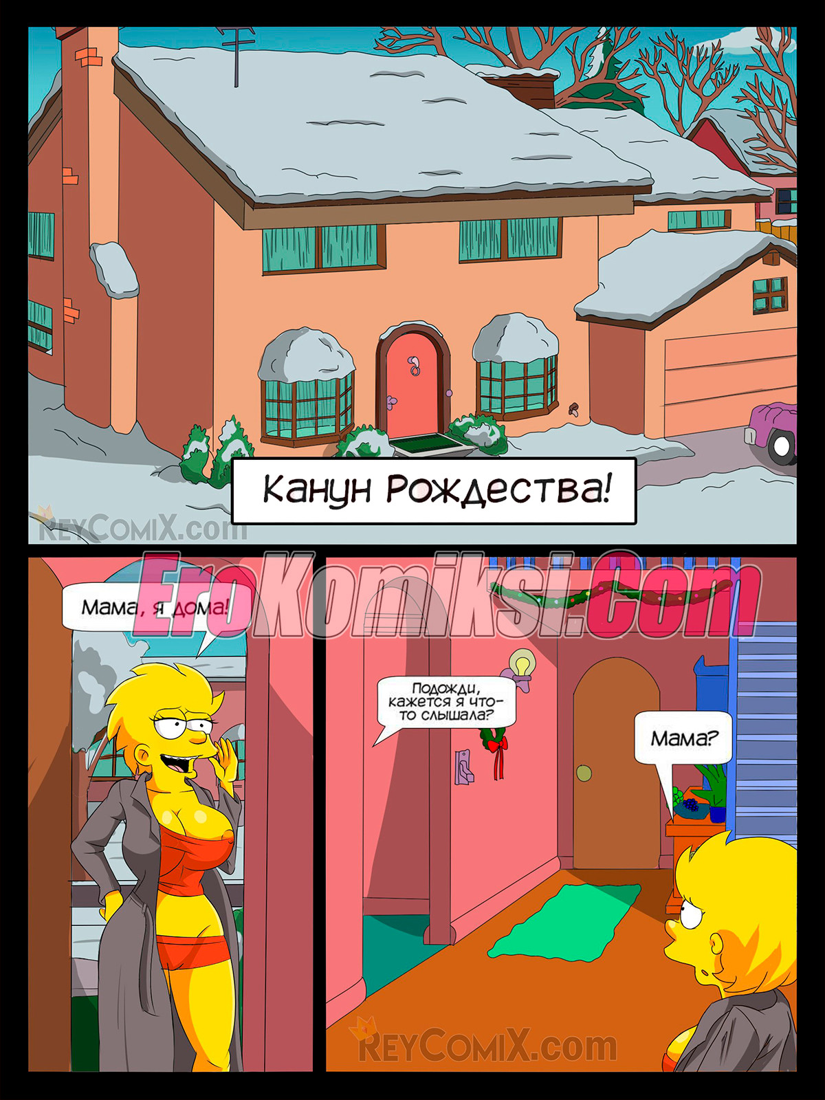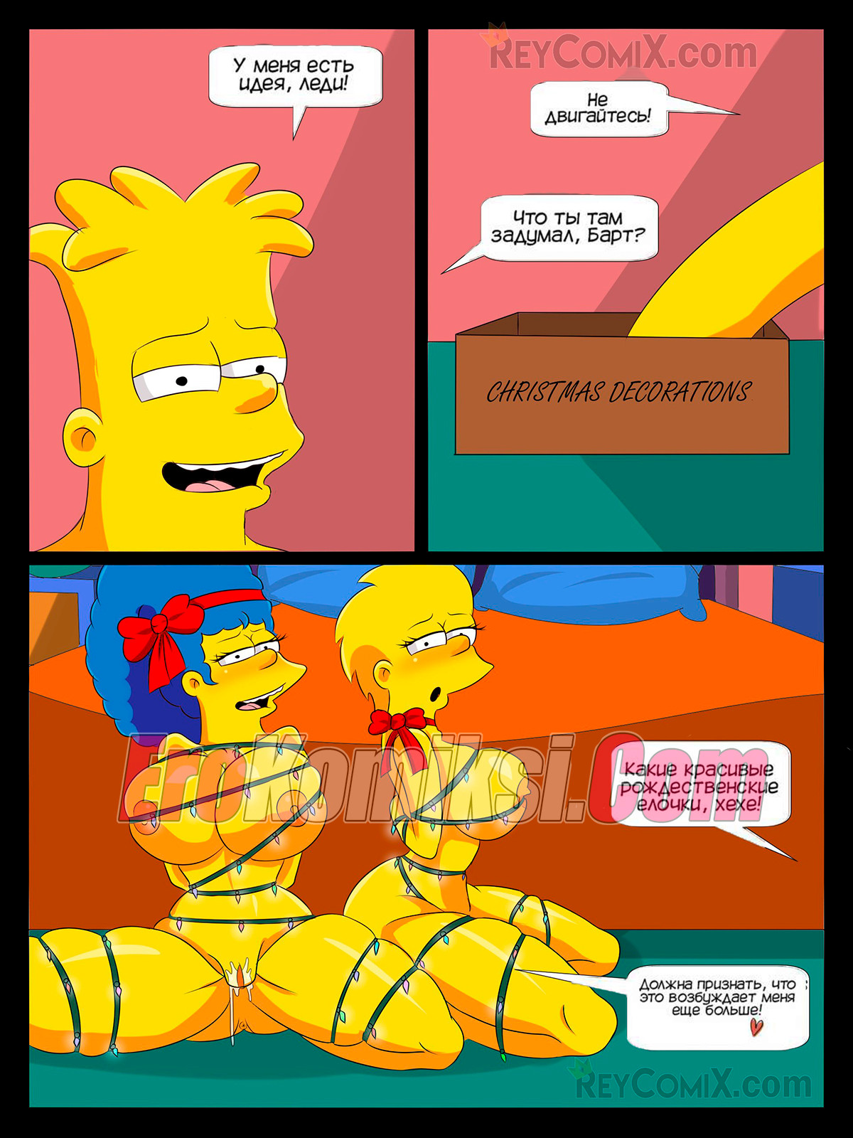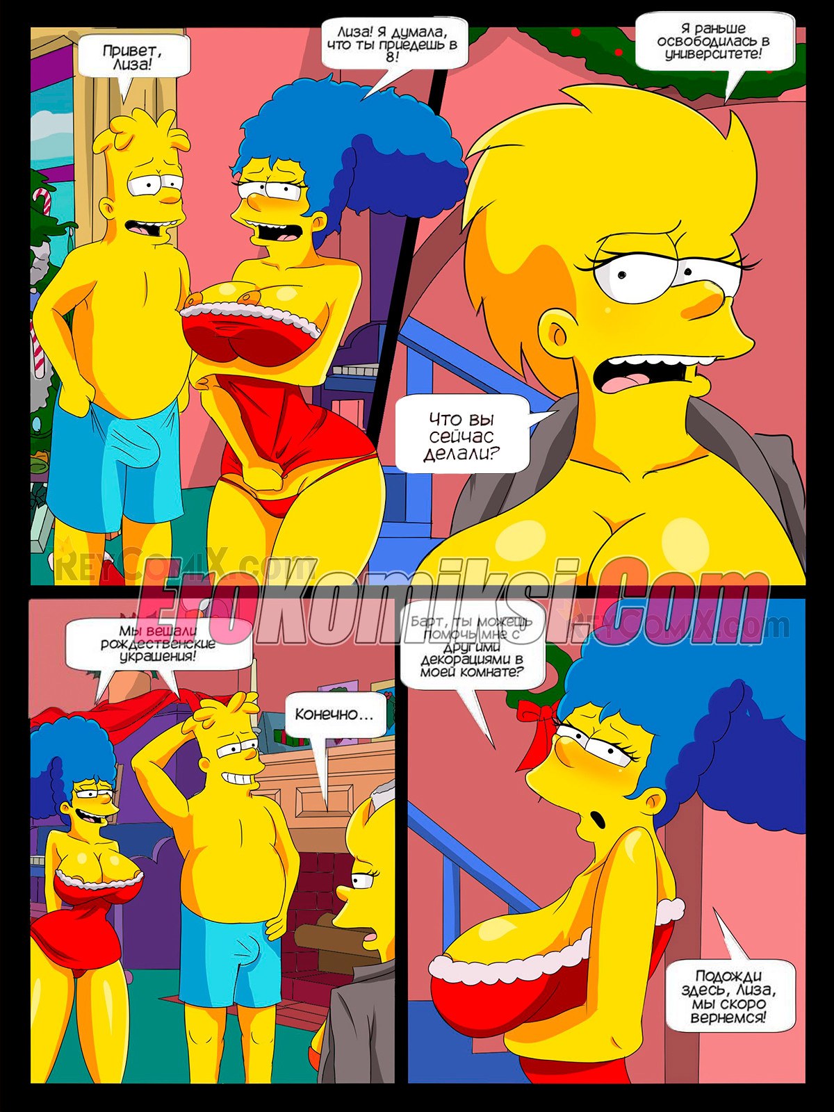 Порно комикс Симпсоны. Семейное Рождество. Family Christmas. Pokuarts Лиза приехала на рождество домой и спалила свою мамку и брата. Сучка разозлилась, что они не позвали ее к себе и присоединилась к ним. Барт выебал двух красоток, а затем обкончал их сиськи.