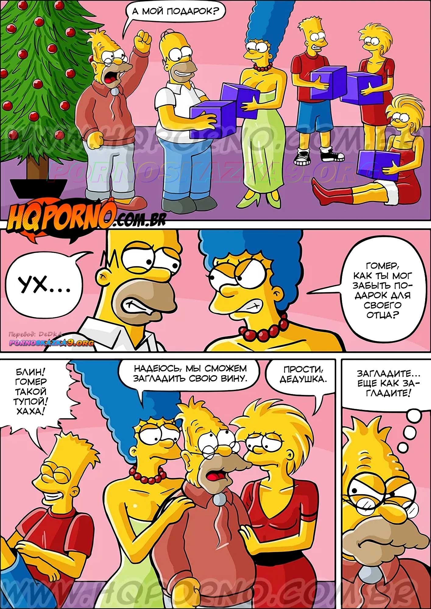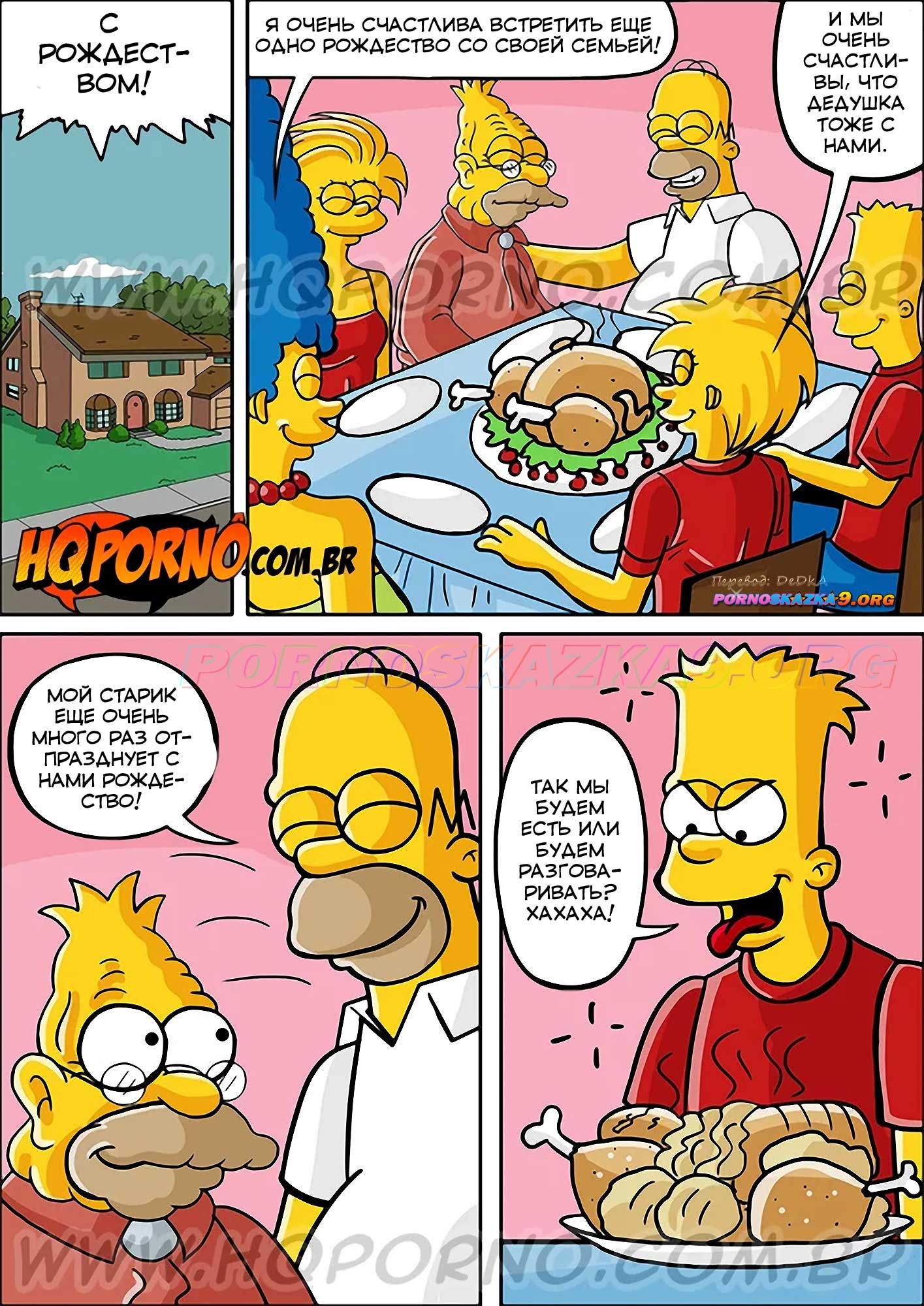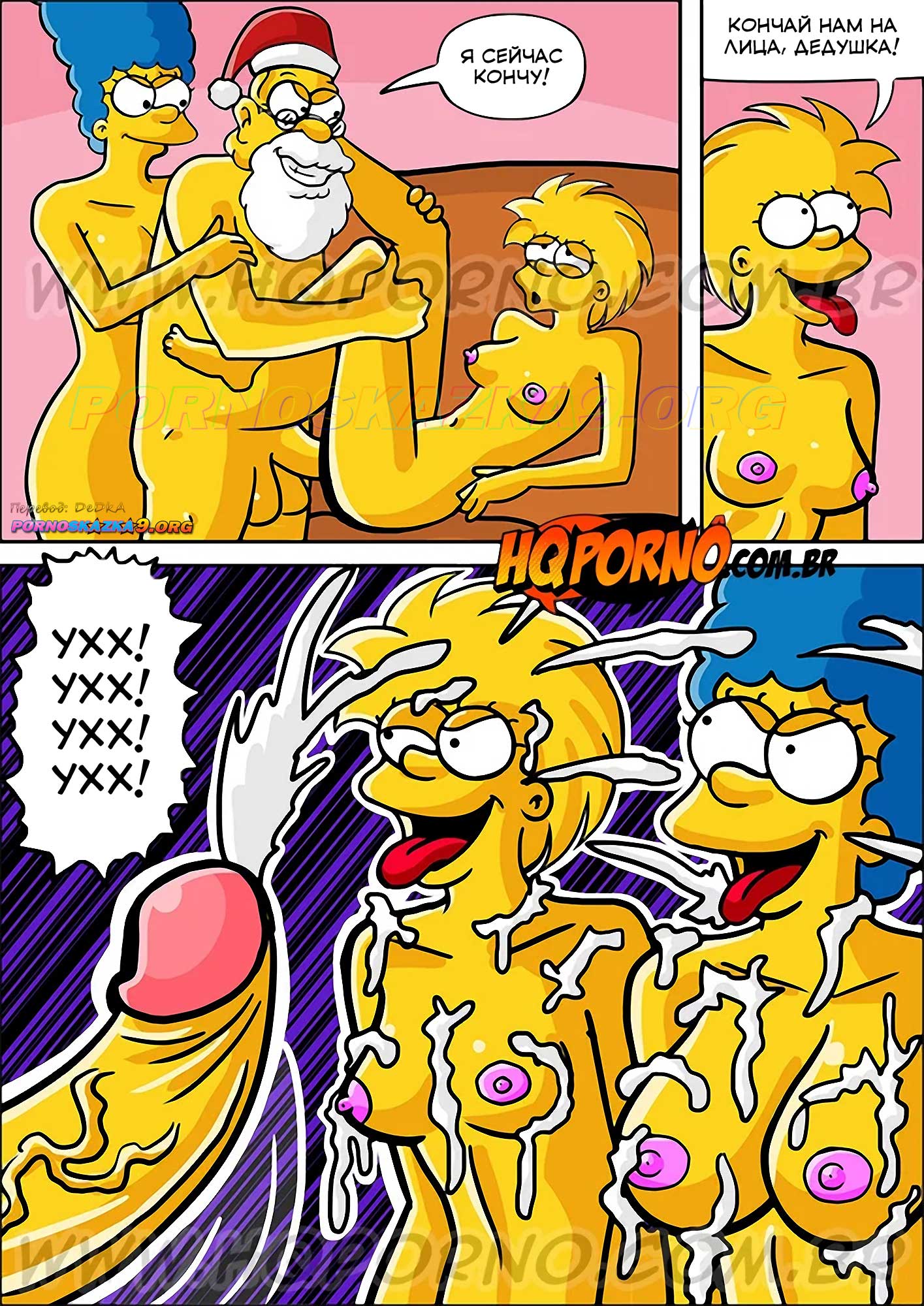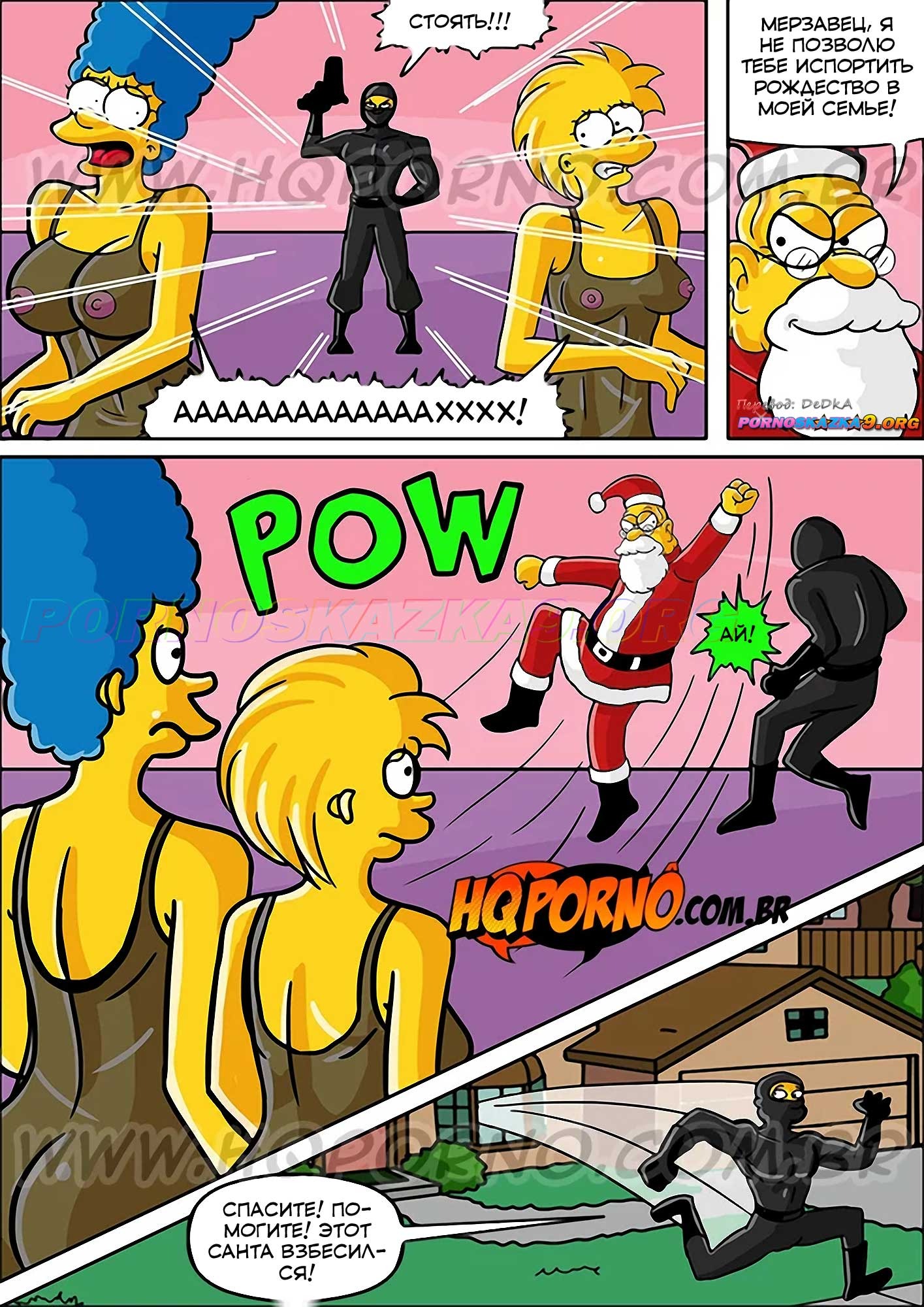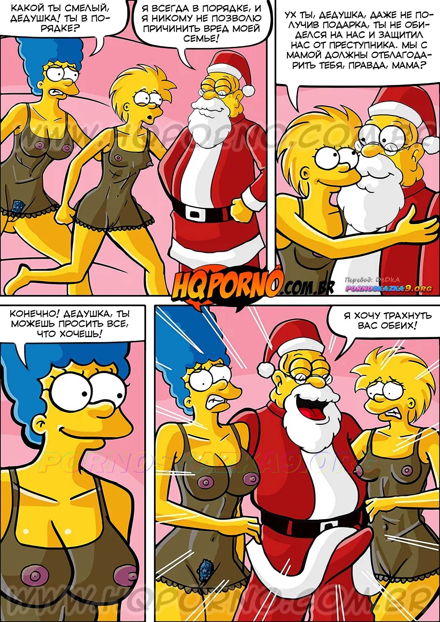 Порно комикс Симпсоны: Симпсексы. Часть 12: Санта герой. Рождество в семье Симпсонов, как всегда, было очень счастливым, правда, Гомер забыл купить подарок для дедушки… А ночью на дом Симпсонов напал преступник, которого дедушка прогнал и спас Мардж и Лизу. После этого храбрый дед захотел получить от Мардж и Лизы и награду за свое геройство, и компенсацию за неполученный подарок…