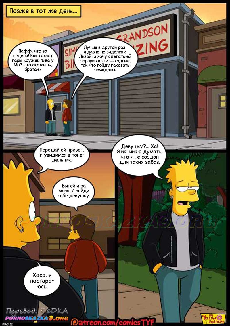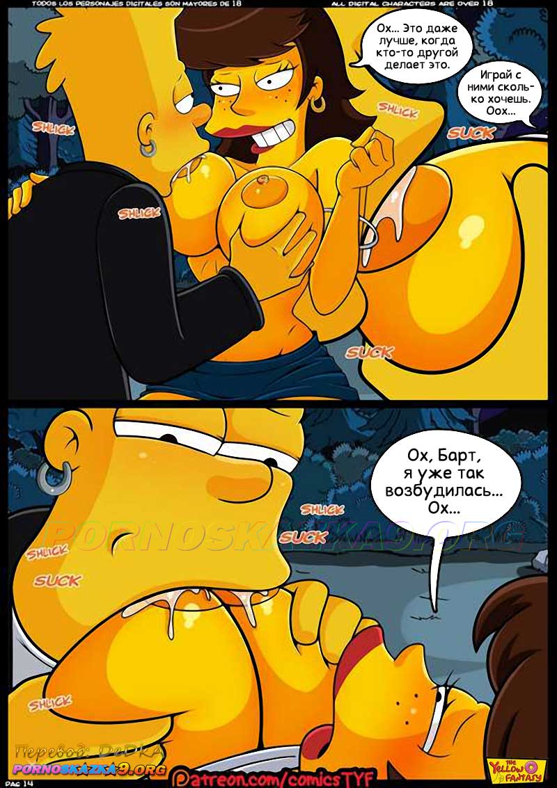 Порно комикс Симпсоны. Желтая фантазия. Встреча. Шона была первой девушкой, которая показала возбужденному Барту свои голые сиськи. Это было уже давно, с тех пор дойки Шоны сильно выросли, но не смотря на это, бойфренд Шоны, по имени Джимбо, изменил ей с бывшей няней Барта, которую звали Орали. И вот, совершенно случайно Шона встретила Барта…