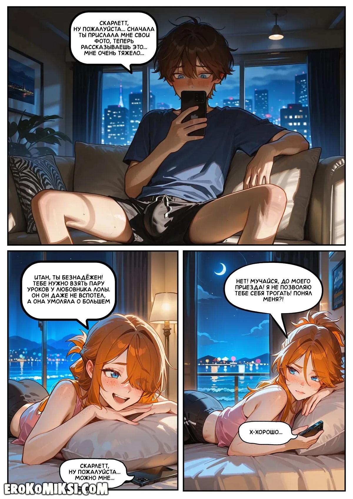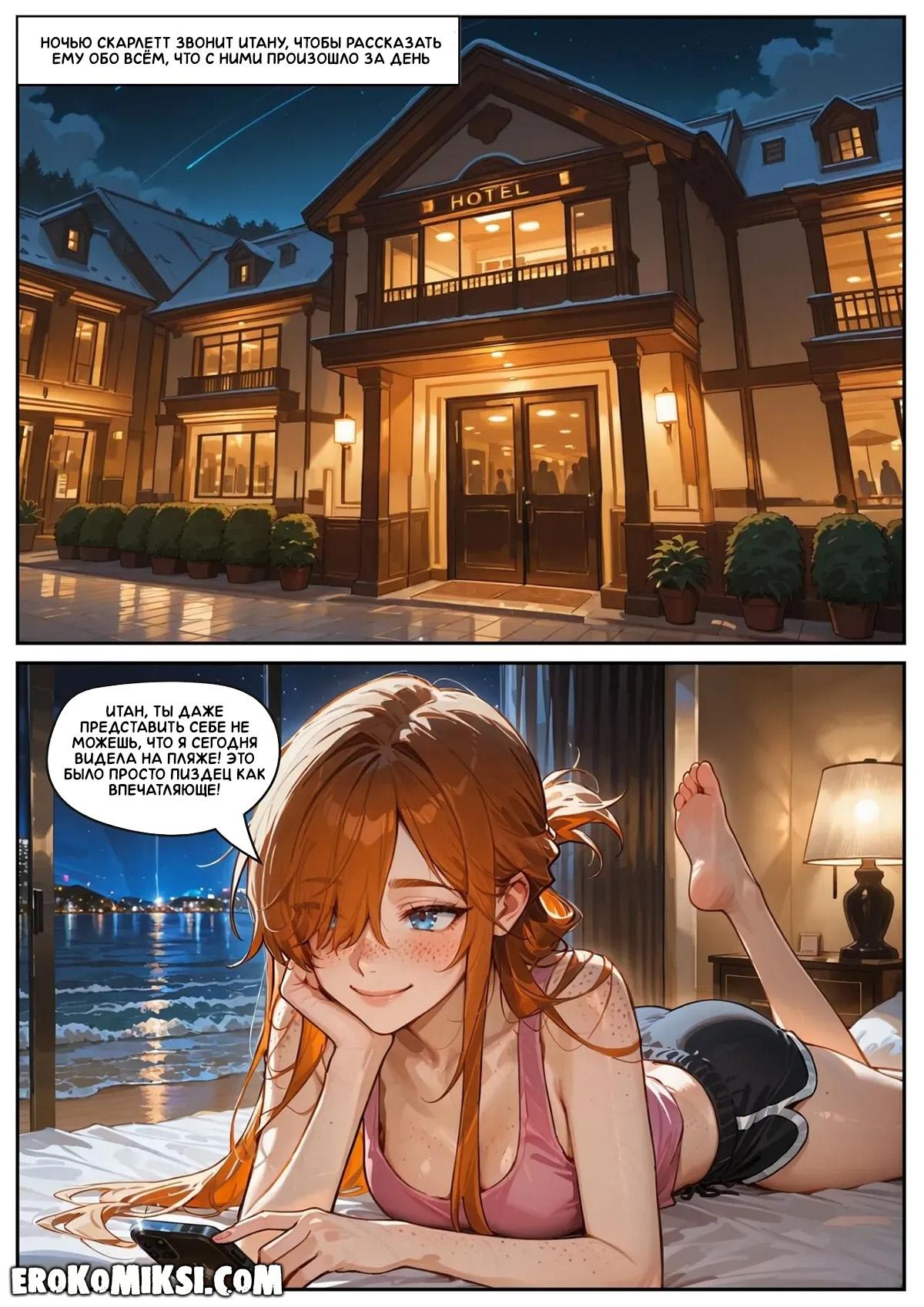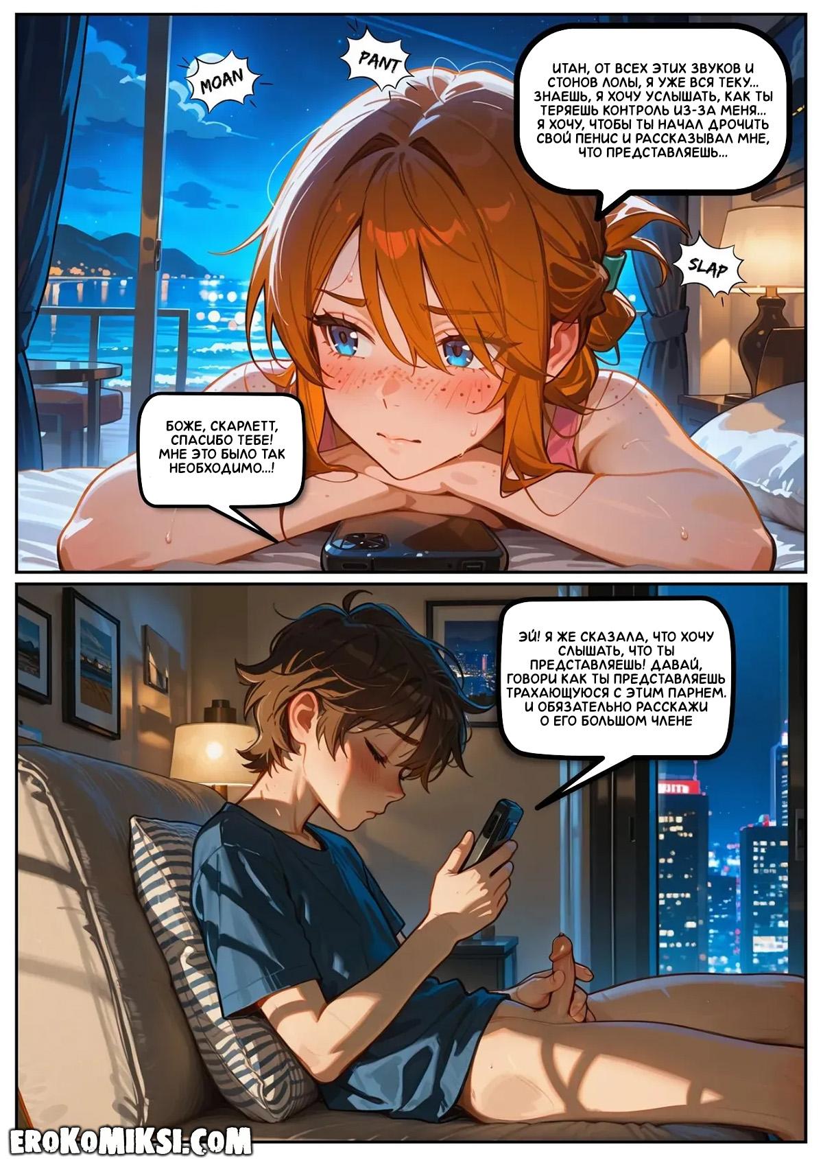 Порно комикс Скарлетт Блейз. Часть 5. Награда за сдержанность. После увиденного на пляже, Скарлетт вечером звонит Итану и всё ему рассказывает. Во время разговора, Скарлетт слышит, как Лола трахается в соседнем номере, от чего сильно возбуждается и они с Итаном устраивают секс по телефону…