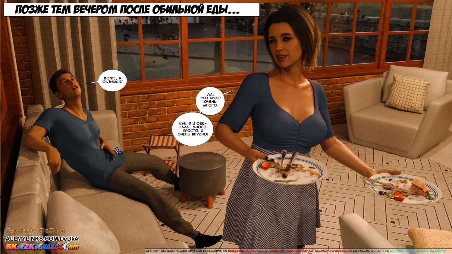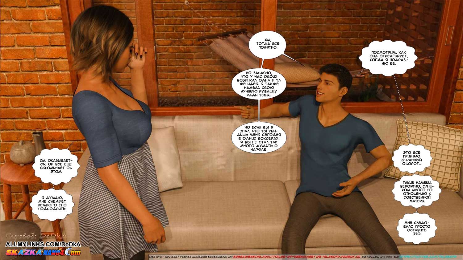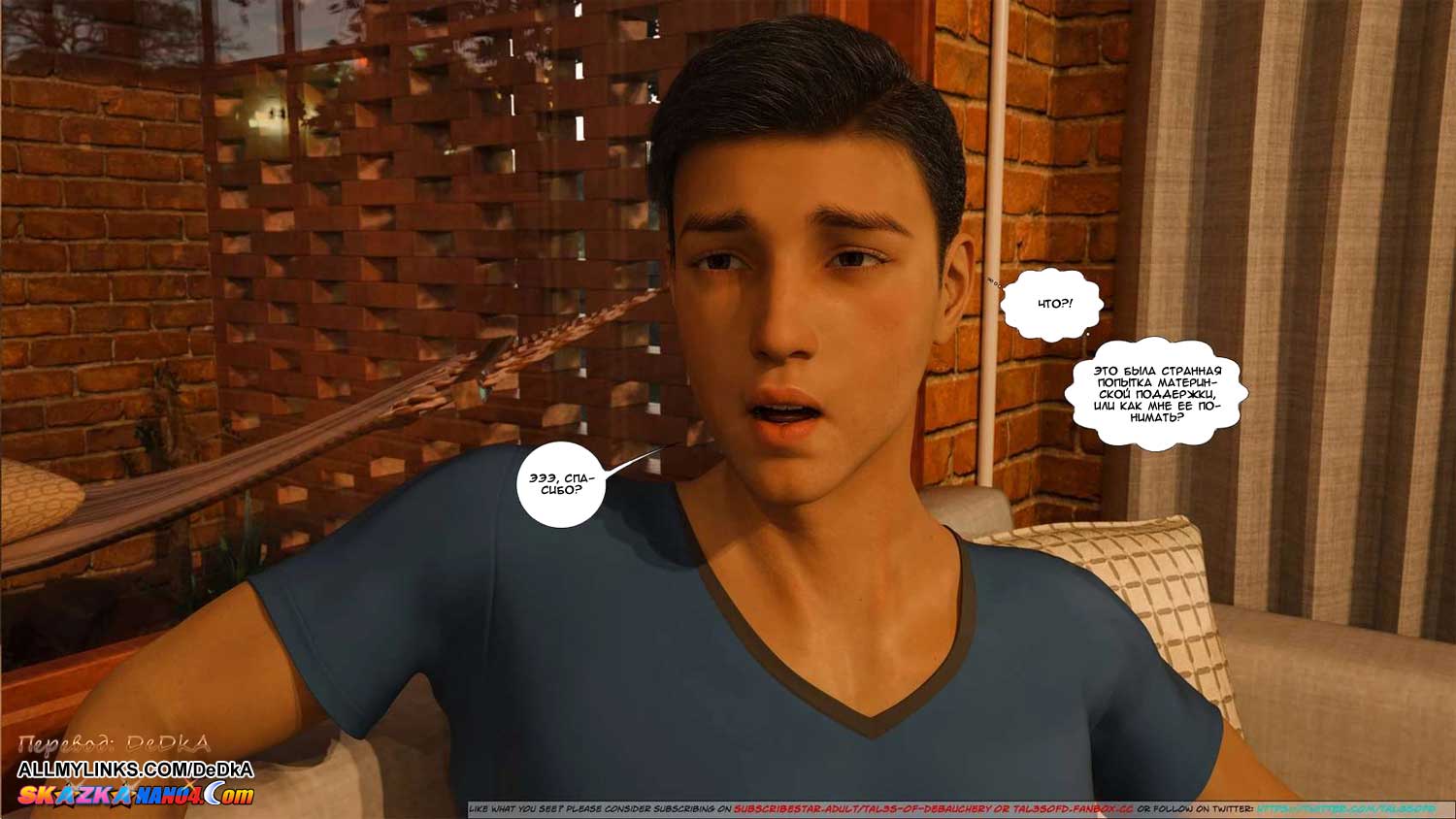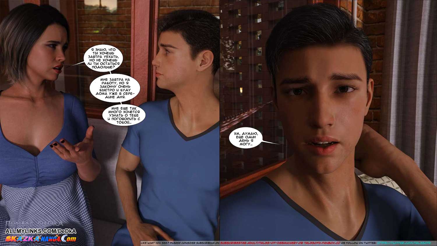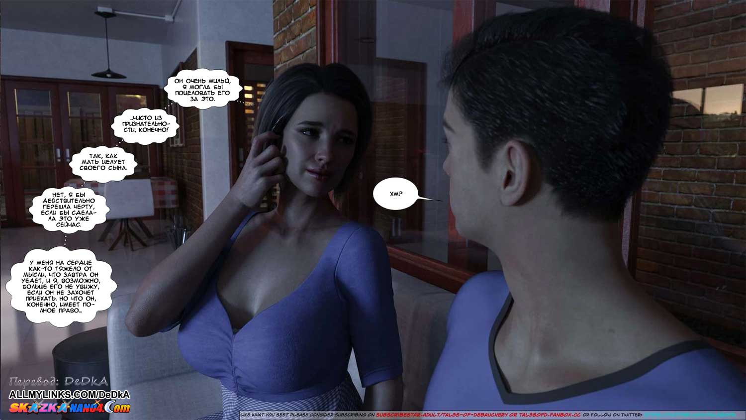Порно комикс Слабость матери. Часть 2. Дилан собирался провести в доме Изабеллы один день и вечером уехать. Но он пропустил время отправления последнего автобуса и собирался пойти снять комнату в мотеле, но Изабелла уговорила его остаться у нее на ночь. Более того, она уговорила Дилана и следующий день провести у нее…