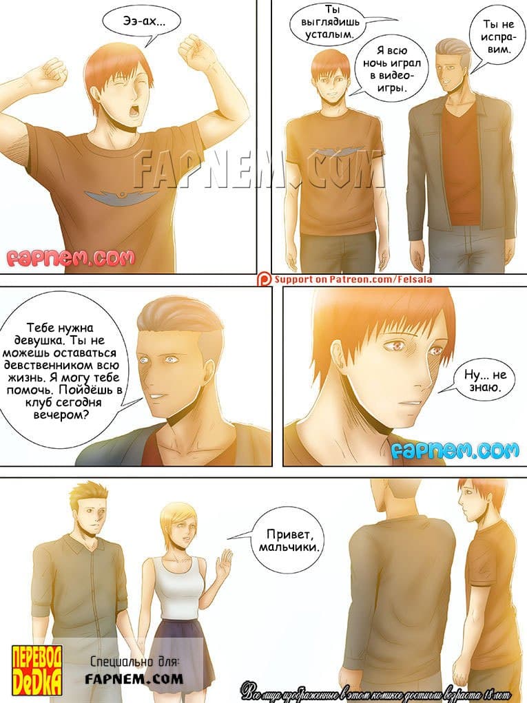 Представляем вам аниме комиксы про секс, речь в котором пойдет о парне по имени Ашер, которому уже 24 года, но он до сих пор ещё остался девственником. Как же так вышло? А просто, он же настолько обожал видеоигры, что все время напролет тратил на них. И даже то, что дома у него есть не только сестра, которая всегда не против поплескаться с ним в бассейне, но и аппетитная домработница, мимо которой невозможно пройти, не задумавшись о сексе, абсолютно ничего для него не значит. Но, слава Богу, у Ашера есть замечательный друг, который не смог наблюдать такое вопиющее безобразие, и он решает вытащить парня на кураж в ночной клуб.