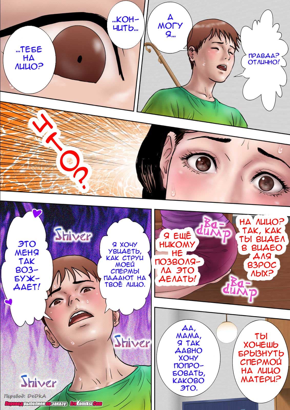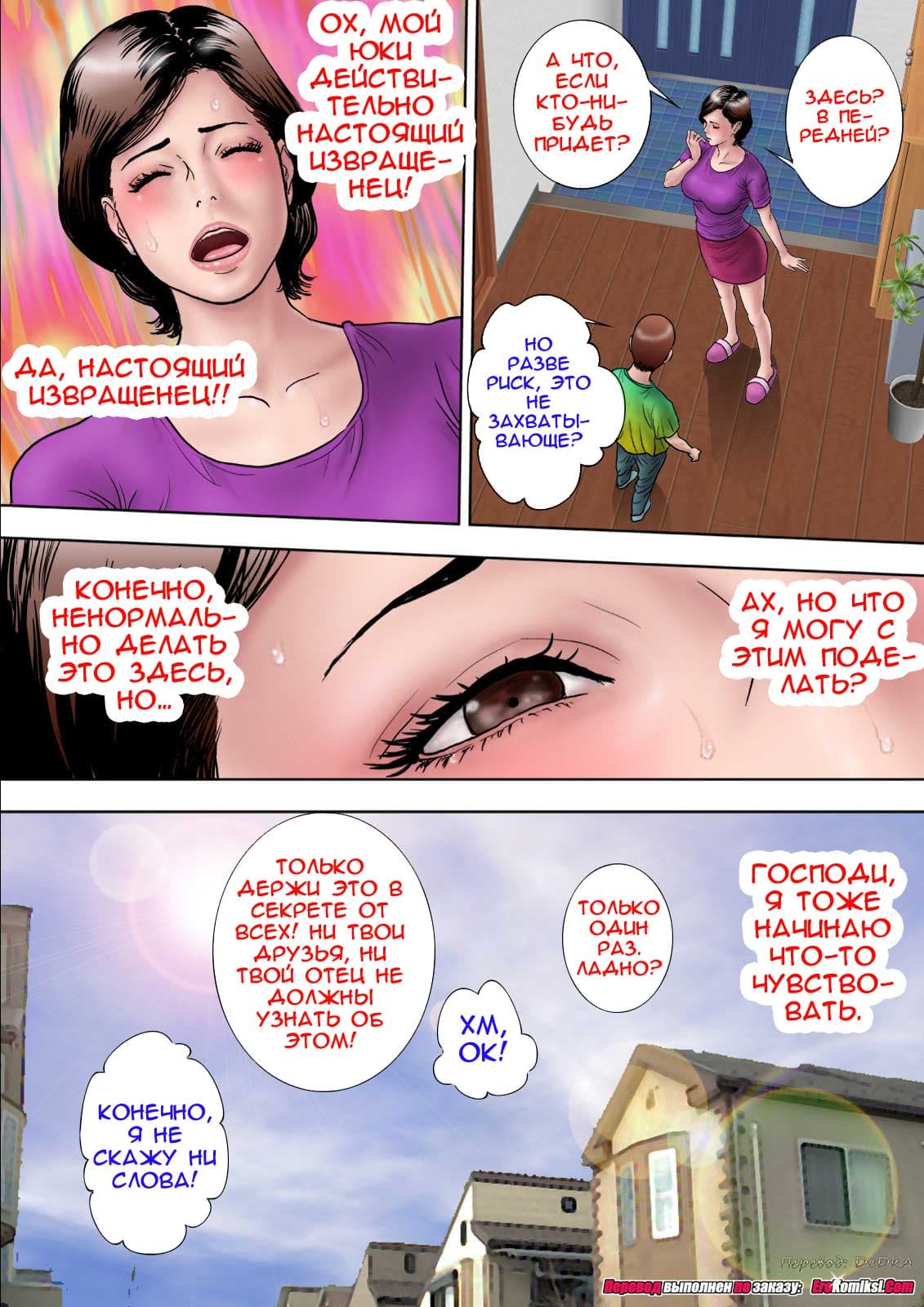 Согласившись сделать сыну минет, мать не была готова к тому, что он попросит её сделать это прямо в передней, где любой человек открывший дверь в дом, может увидеть их. Но сын уговорил её. Не была мать готова и к тому, что сын попросит её разрешить ему кончить ей на лицо, но он снова смог её уговорит. Что тут сказать, умеет парень уговаривать…