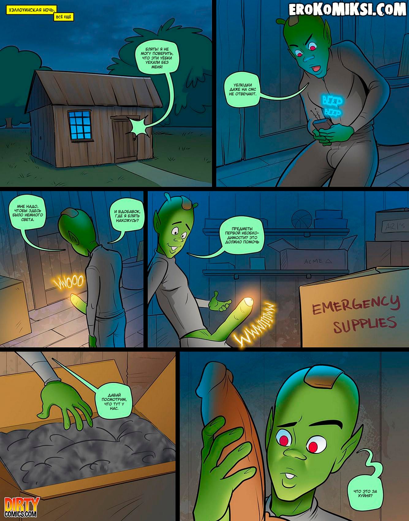 Порно комикс Спасение Хэллоуина. Часть 2. Saving Halloween. Dirtycomics. Горячая брюнетка была недовольна отсутствием секса со своим парнем и отправилась за своим любимым дилдо. Но вместо этого красотка обнаружила инопланетного парня с огромным стояком…