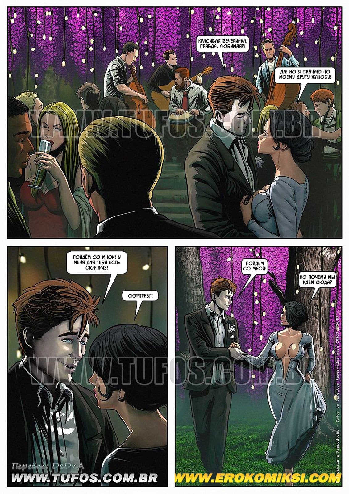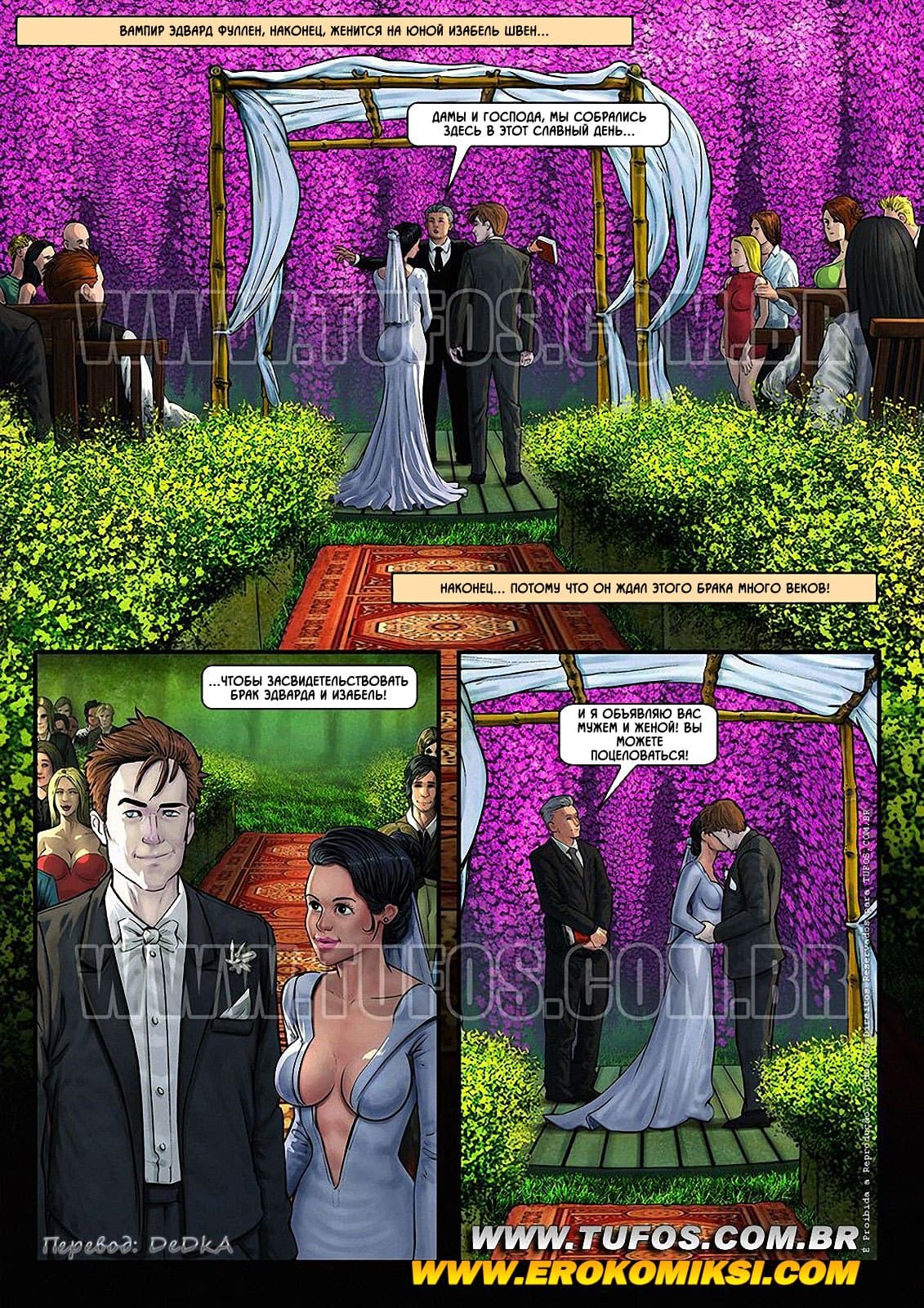 Порно комикс Сумерки начинается с того, что вампир Эдвард, наконец, женится на юной Изабель. Он мечтал об этом много веков! Весёлая свадьба в разгаре, но Изабель скучает по своему другу детства Жанобу! Зная об этом, Эдуард, приготовил ей сюрприз! Он устраивает Изабель встречу с Жанобом! Эдуард не знал, с какой просьбой оборотень Жаноб обратится к Изабель, когда останется с ней наедине…