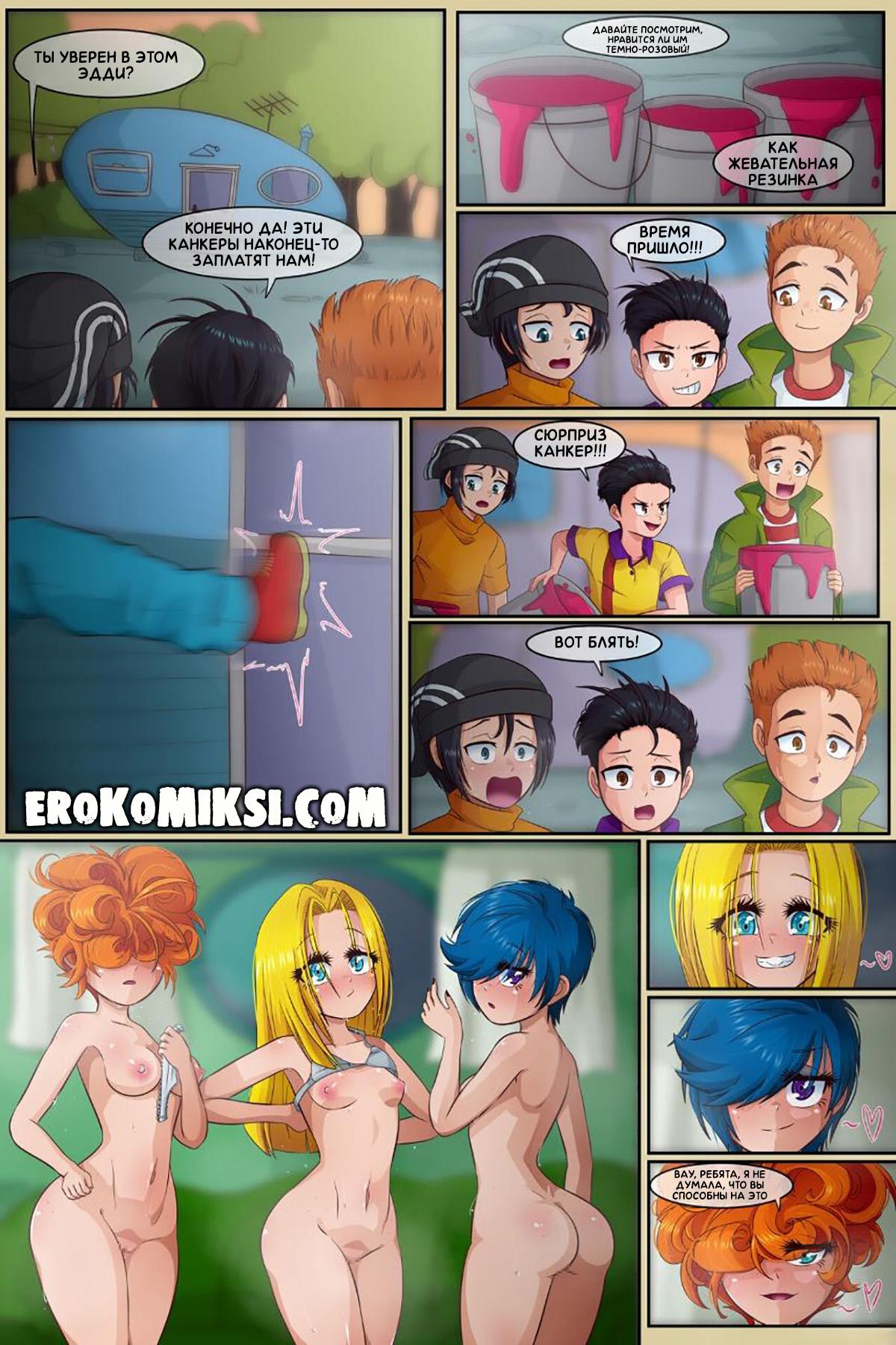 Порно комикс Сёстры Кранкер vs Эддс. Дружбаны Эд, Эдд и Эдди, решили потроллить сестёр Кранкер. Они ворвались к девчонкам в дом, чтобы облить их краской, но сестрёнки в этот момент переодевались и пацаны просто обомлели от обнажённых красоток. Не долго думая, сестрица взяли себе по парню и начали с ними забавляться…