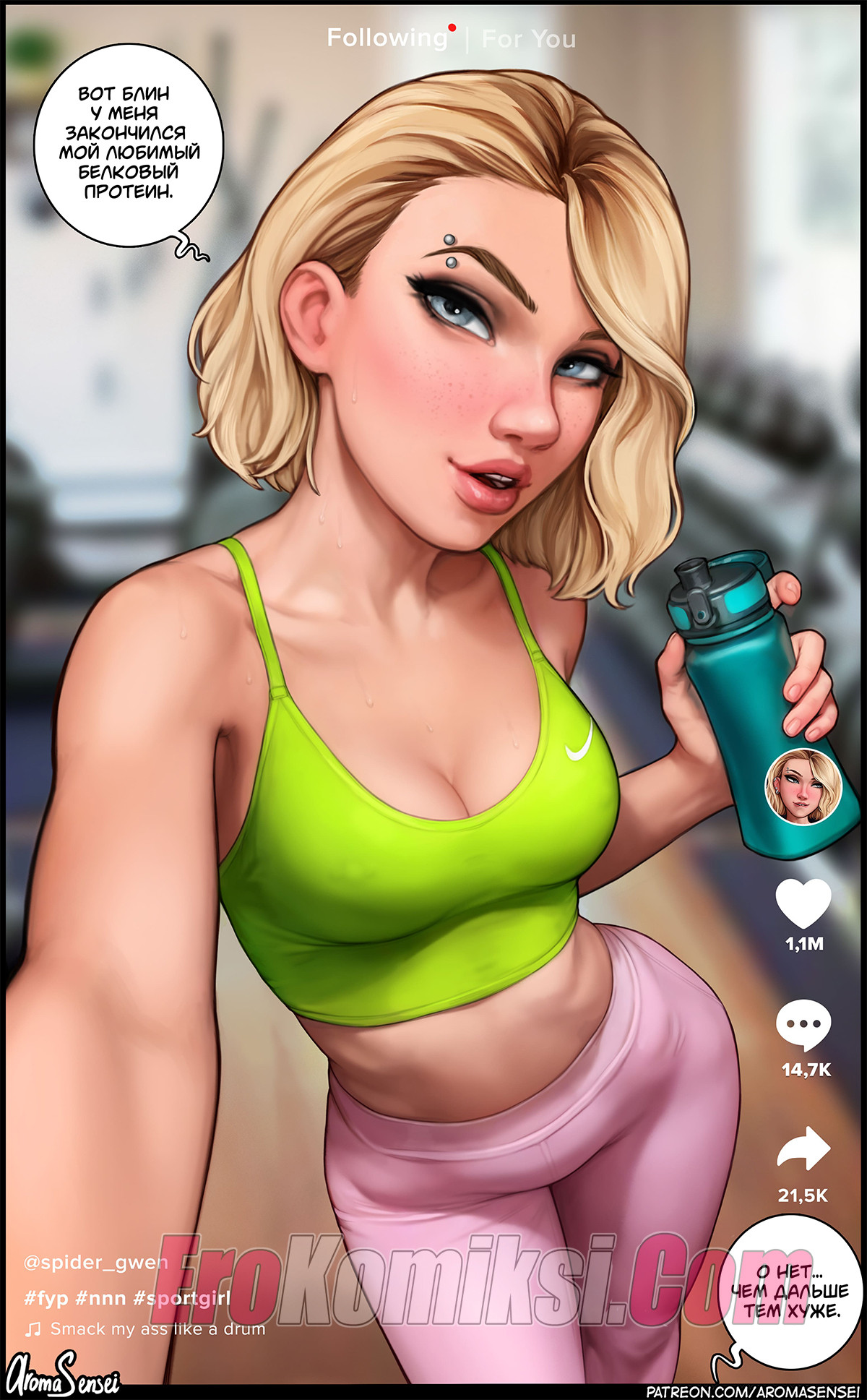 Порно комикс Тикток Гвен. AromaSensei. Горячая блондинка Гвен стала снимать свое прекрасное тело в тикток, а затем встретилась с пареньком с большим черным хуем в спортзале и раздвинула перед ним свои ножки, чтобы он ее хорошенько выебал.