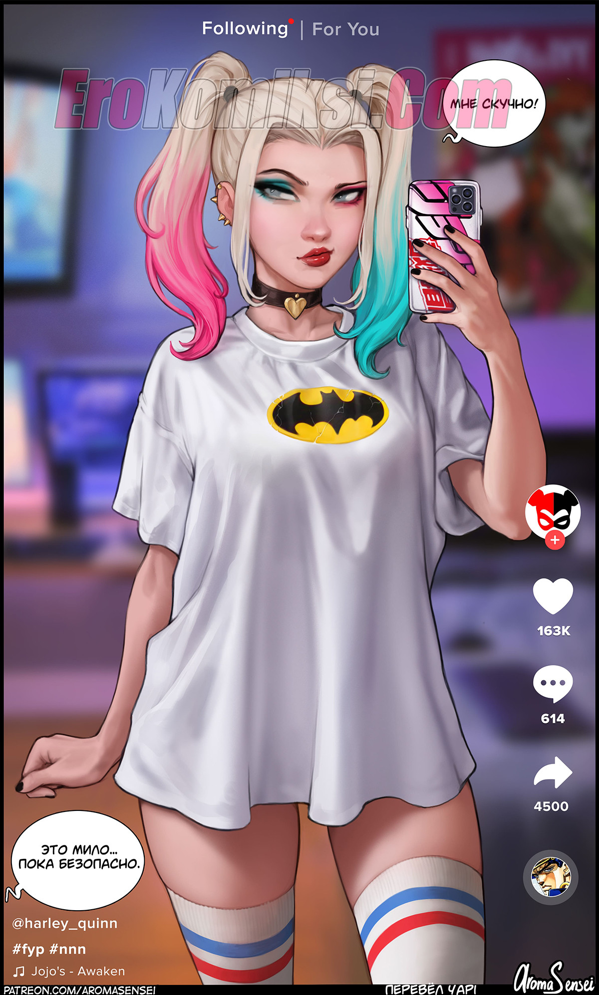 Порно комикс Тикток Харли Квин. Harley Quinn Tiktok. AromaSensei Горячая красотка Харли Квин начала снимать в тик ток свое прекрасное тело, поэтому Бэтмен захотел с ней встретиться. Он дал красотке отсосать свой большой хуй, а затем хорошенько выебал ее в пизденку раком.