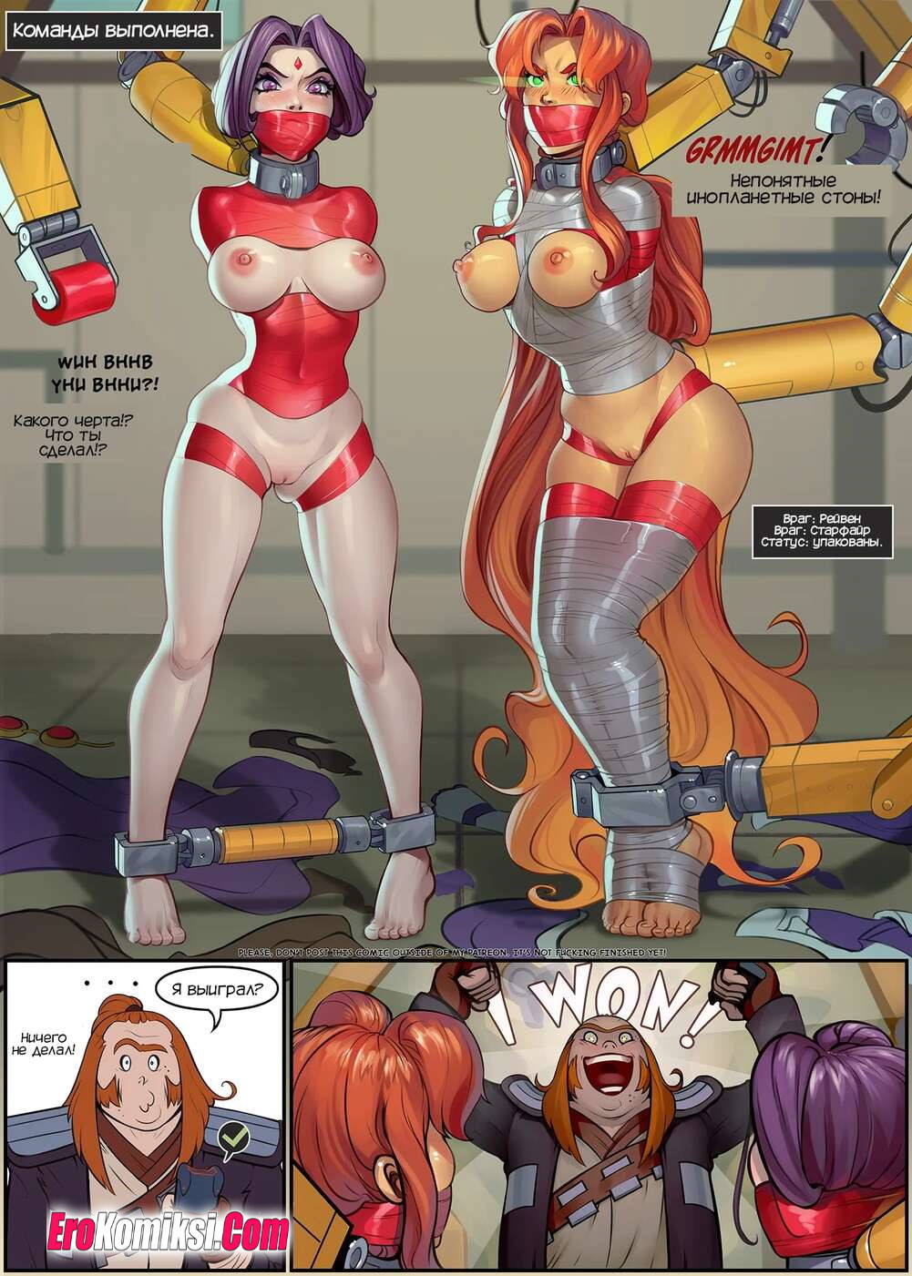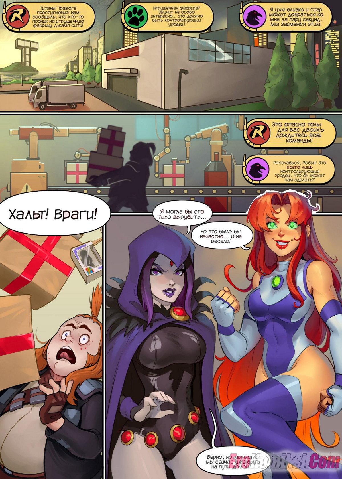 Порно комикс Титаны. Экшнигрушки. Action Toys. SanePerson Титаны получили сигнал о преступлении на фабрике игрушек. Рейвен и Старфайр отправилась туда, где они попали в ловушку злодея, и их схватили металлические клешни, которые стали раздевать девушек.