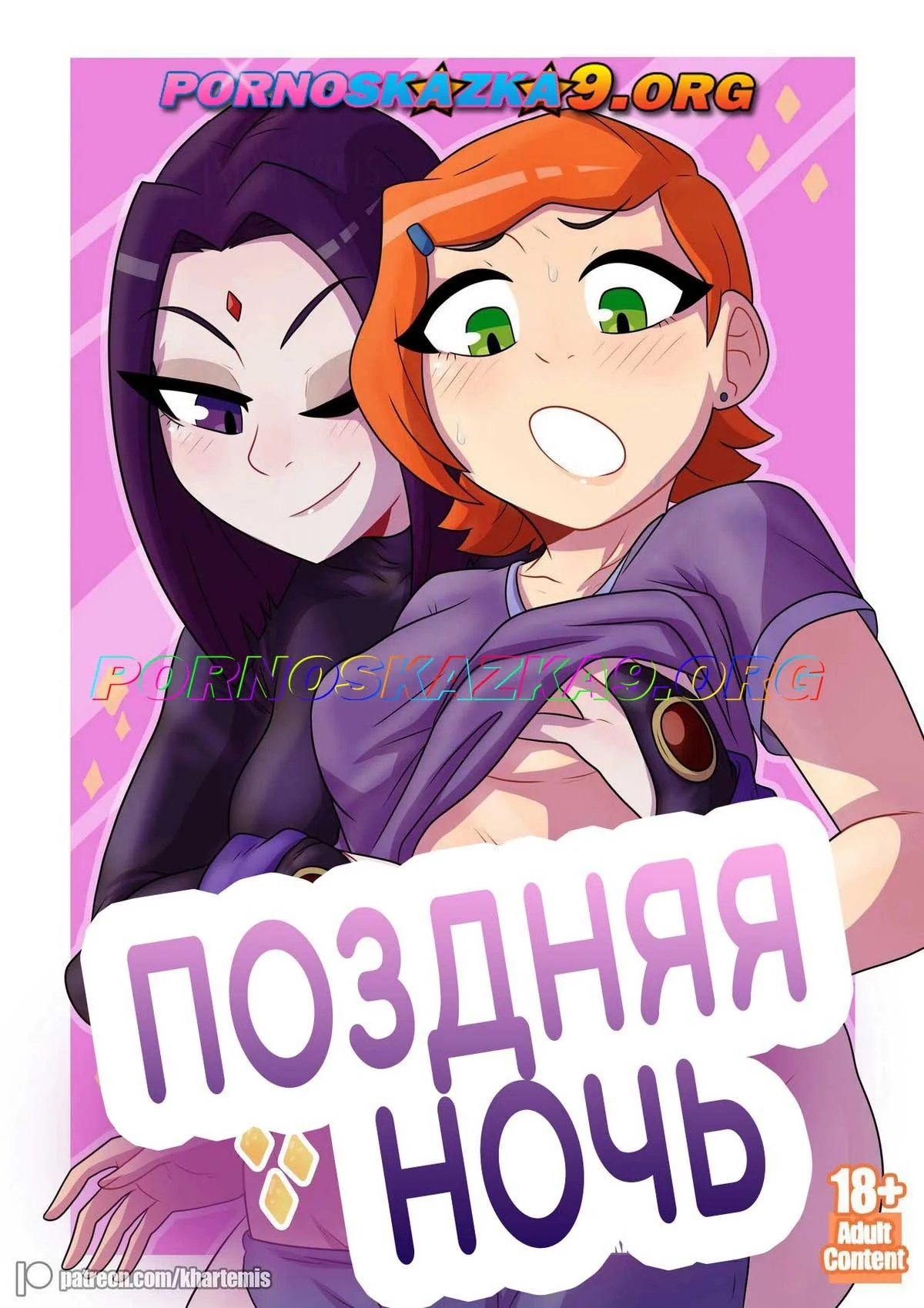 Порно комикс Титаны. Поздняя ночь. Гвен была в шоке от того, что поздно ночью, Рейвен ворвалась к ней в комнату и начала соблазнять её, показав свои огромные сочные сиськи…