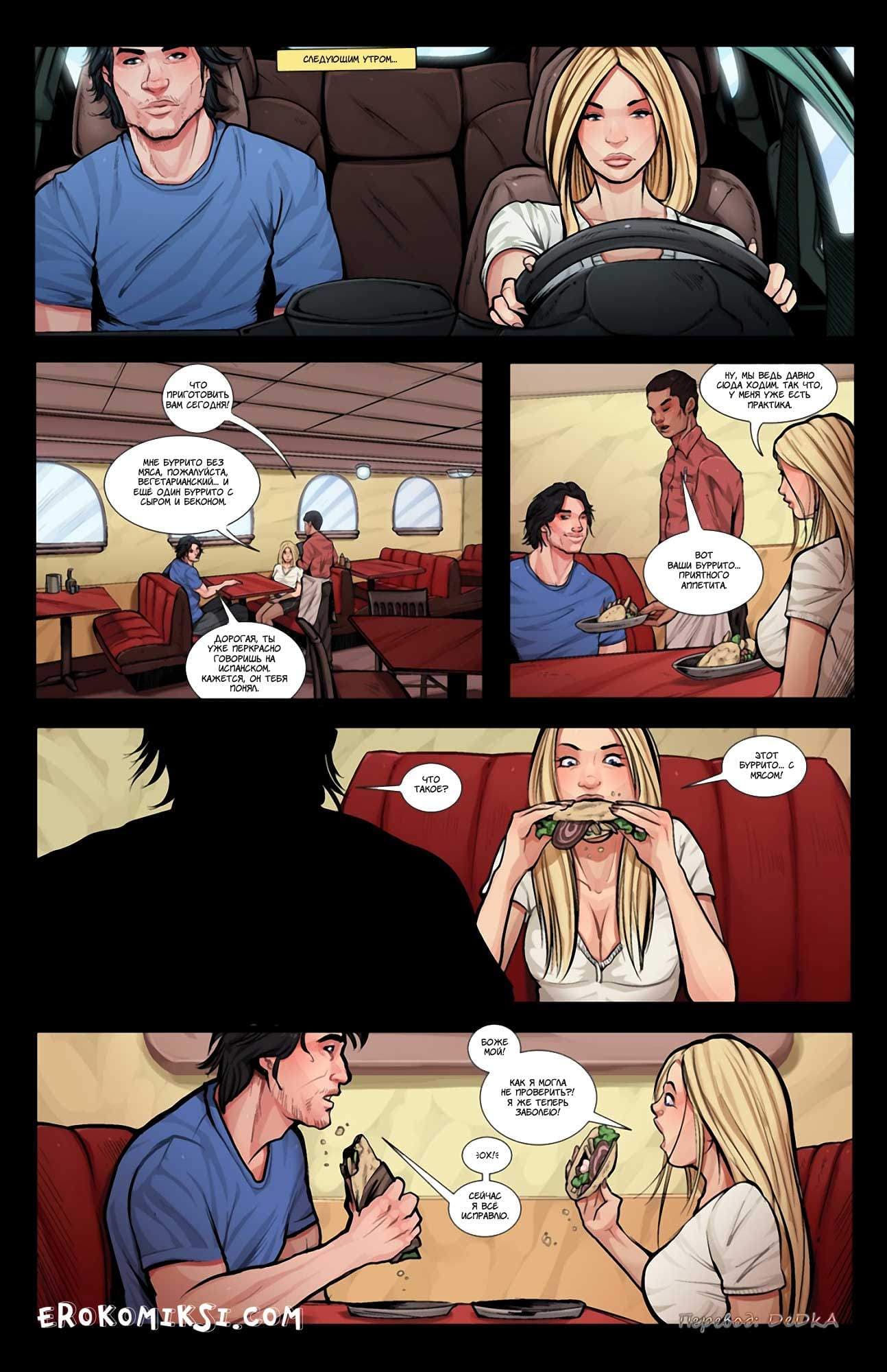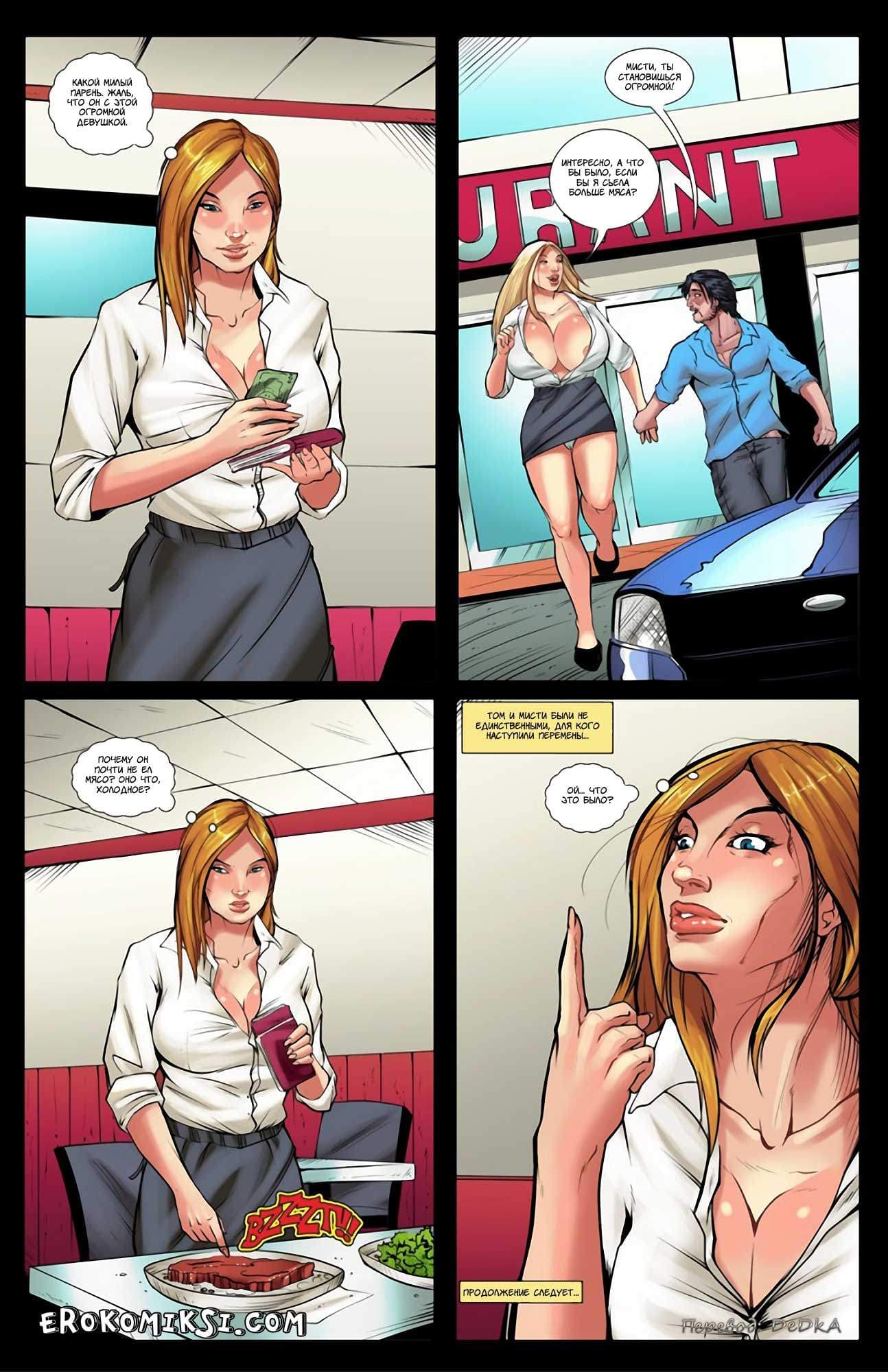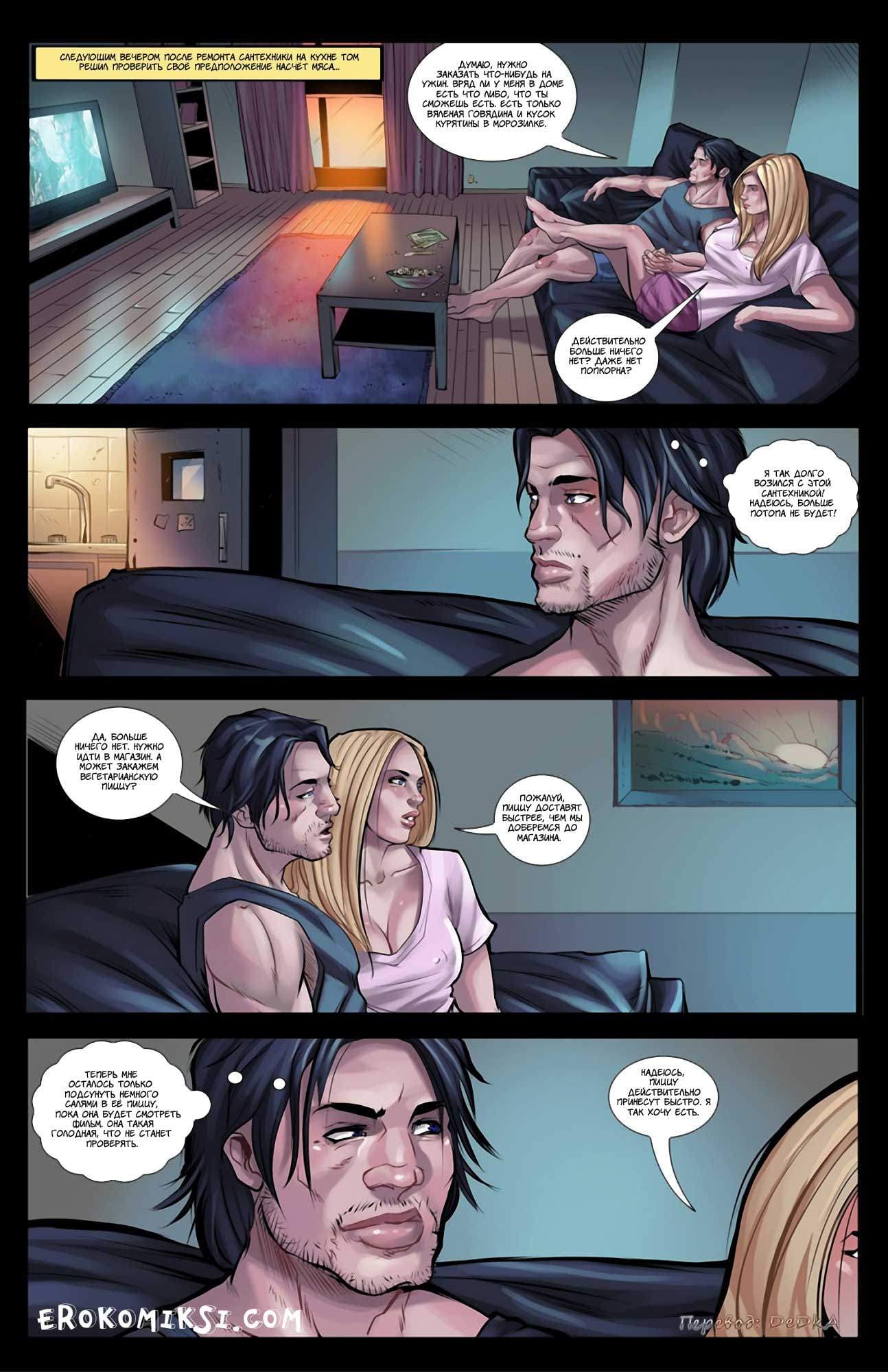 В первой части порно комикс Только не мясо рассказывается о том, как подруга Тома, Мисти, живёт у него уже больше месяца, но… она до сих пор не спала с ним, и, кажется, совсем не проявляет интереса к сексу. Том уже начал задумываться, а нужна ли ему такая подруга? Но однажды всё резко изменилось, и причиной всему стало, как не странно, мясо!