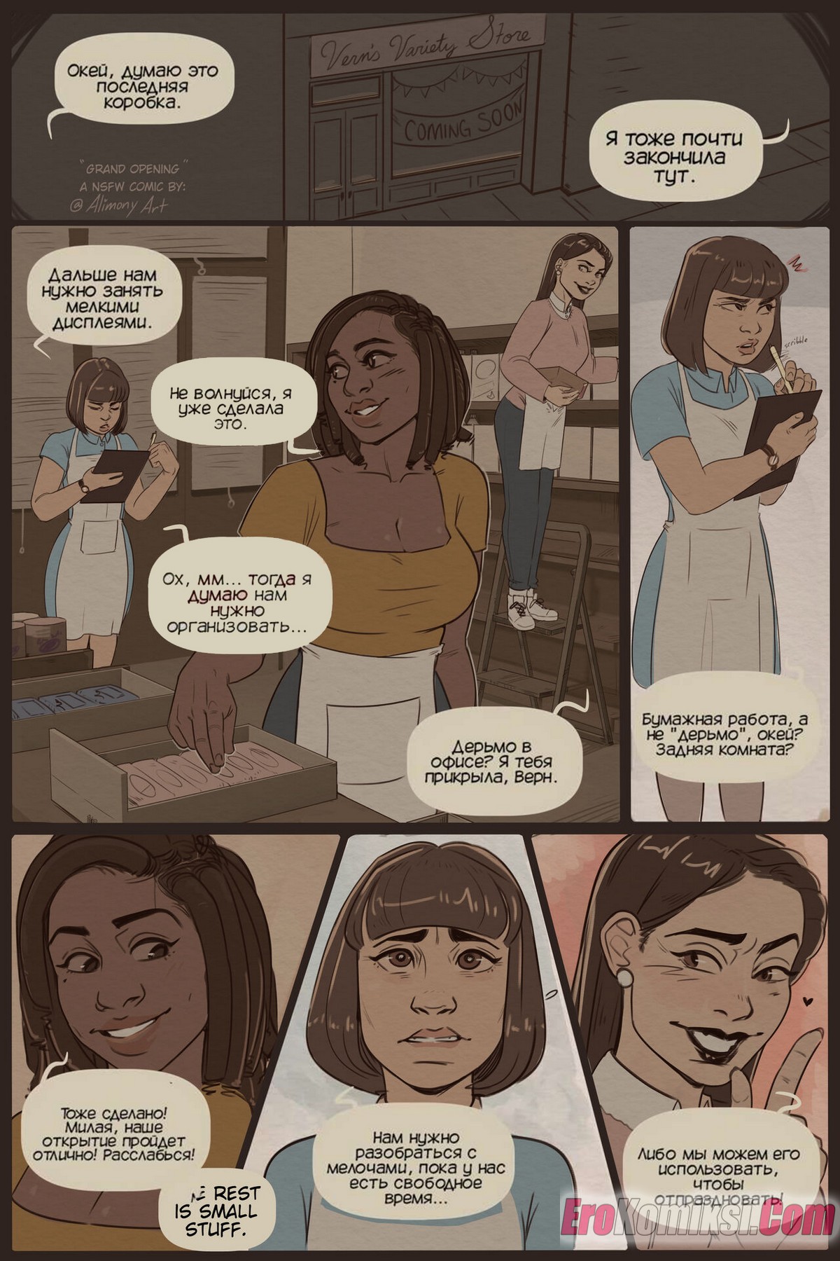 Порно комикс Торжественное открытие. Grand Opening. AlimonyArt Три горячие красотки готовятся к открытию своего магазина и решили сделать небольшую паузу. Две девушки разделись и стали сосать хуй своей подруги, после чего дали ей у себя отлизать.