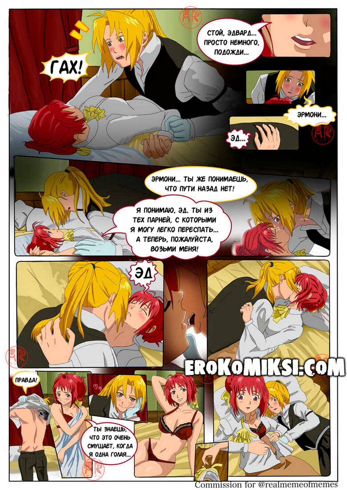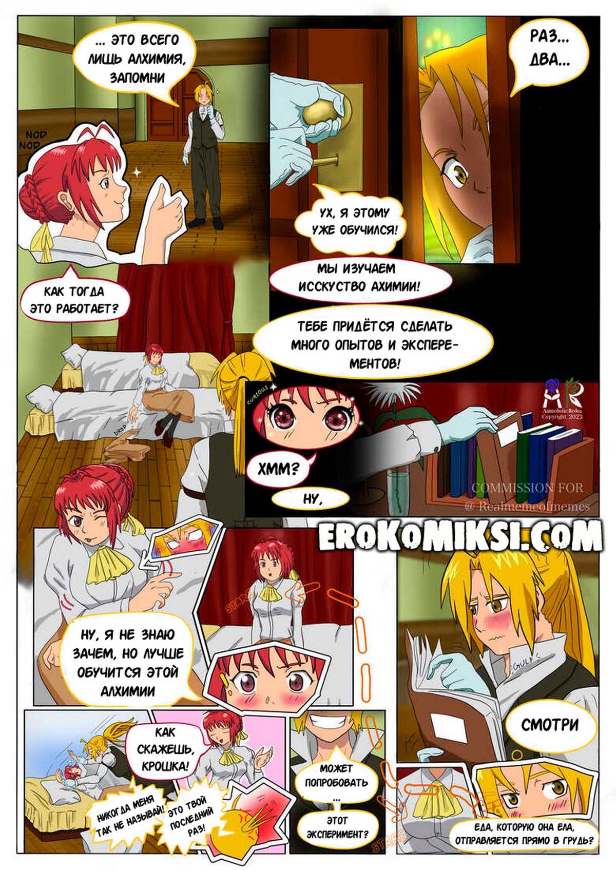 Порно комикс Трансмутация сердец. Горячая Эрмони впервые решила начать свои эксперименты в алхимии, и Эдвард вызвался ей помочь. Сначала он соблазнил эту горячую красотку, а после лишил её девственности…