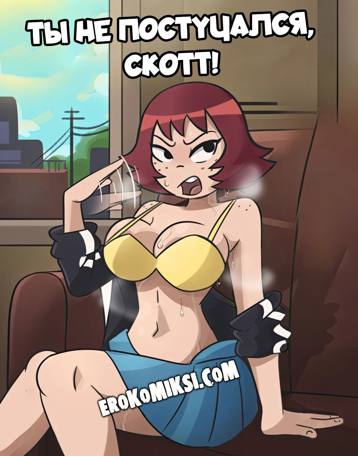 Порно комикс Ты не постучался, Скотт! Скотт и Ким остались наедине, они ждали остальную часть группы, и чтобы скоротать время, решили развлечься. Парень получил желаемое и трахнул Ким…