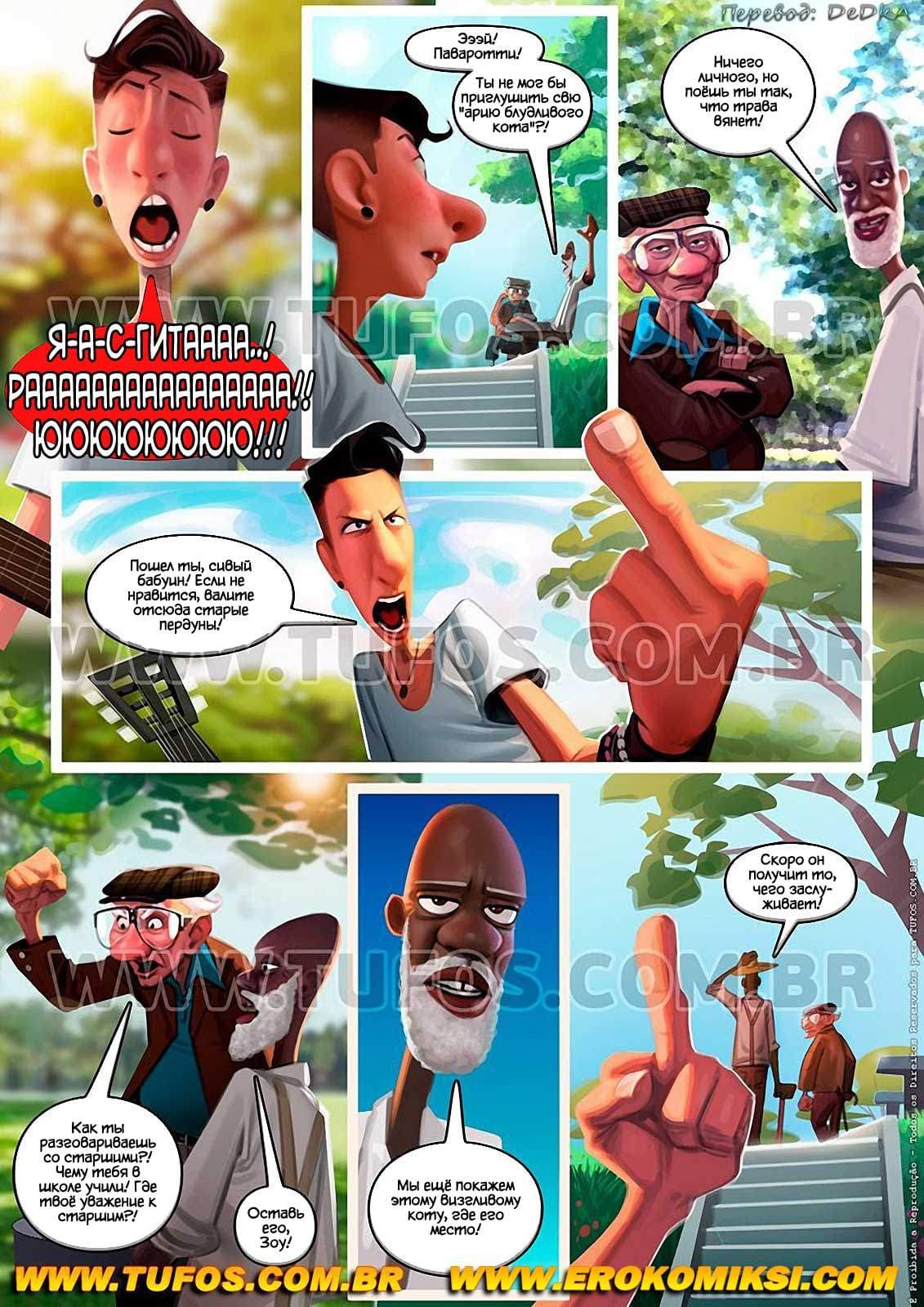 Порно комиксы Удалые старички популярной студии продолжаются. Это уже 4 серия из данной секс истории. Так Старички Зоу и Нано играют в домино. Но им мешают сосредоточиться на игре душераздирающие вопли, похожие на вой кота, которому прищемили дверями хвост! Это влюблённый юноша исполняет под гитару серенаду для своей возлюбленной. Нано просит парня слегка приглушить звук искусства, но тот с издевательским хохотом обзывает дедушек старыми пердунами и продолжает скулить ещё громче. Старички ушли, но обиду не простили. Скоро они сами будут хохотать над юным хамом…