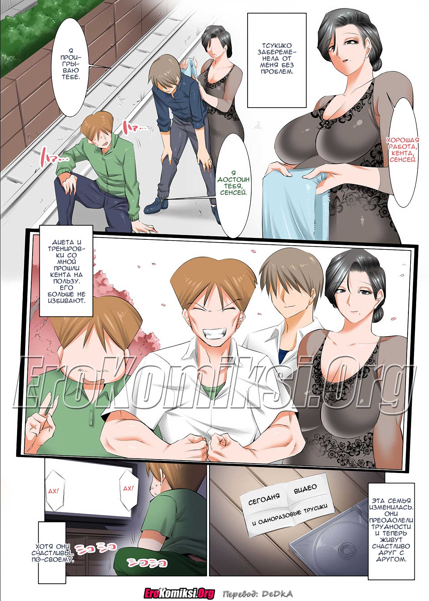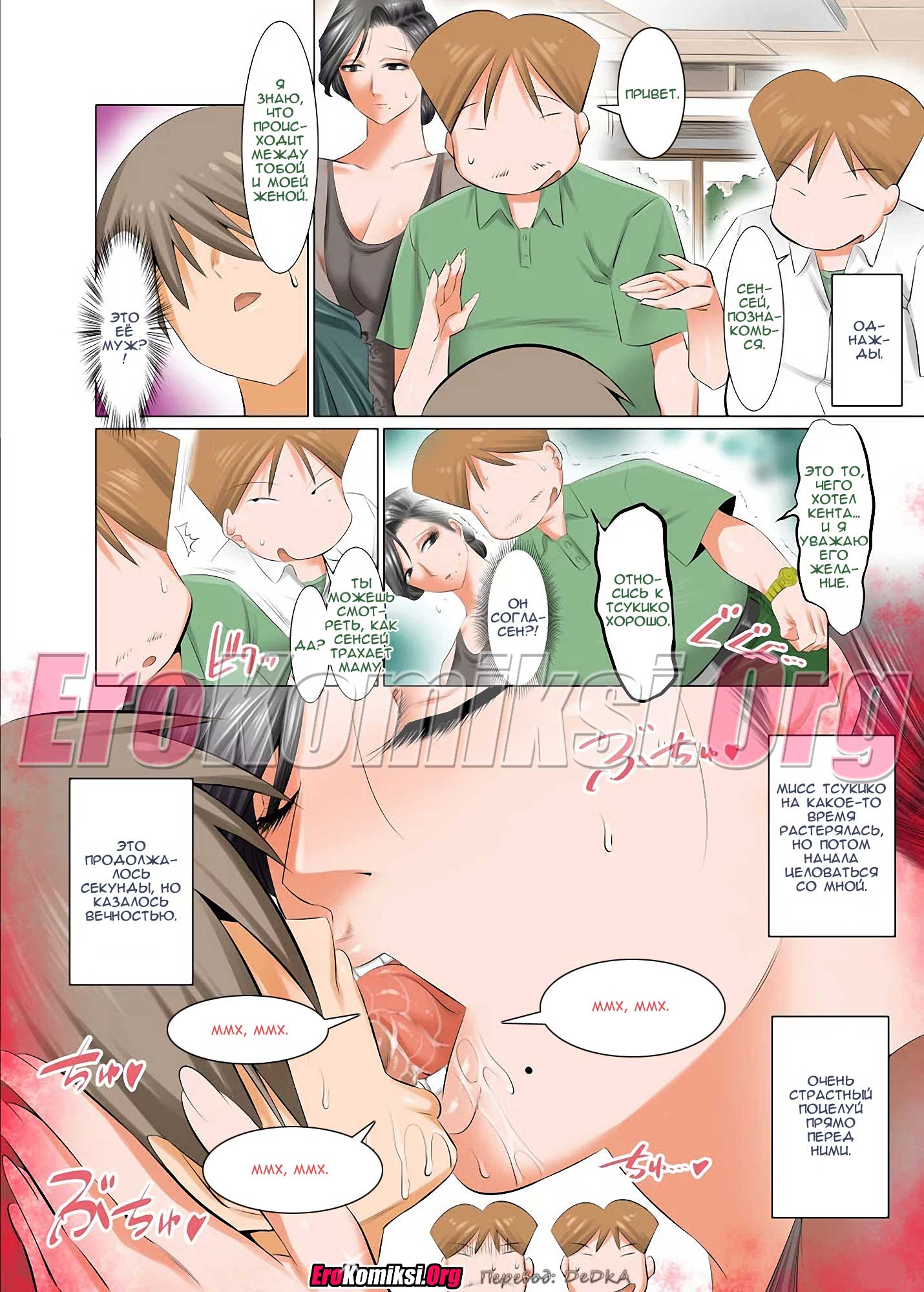Угощение очень понравилось и угощаемой стороне, и угощающей. То есть, Сенсею понравился секс с матерью друга, и ей это тоже понравилось. И так это им понравилось, и до того затянулось, что закончилось беременностью! А как же муж матери друга? Как ни странно, он остался доволен тем, что его жена родит от Сенсея, и не против, если они зачнут и следующего ребёнка, если ему будет позволено наблюдать за тем, как они это делают.