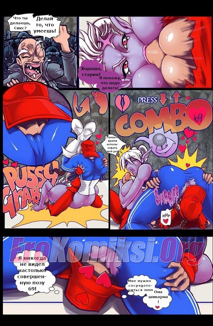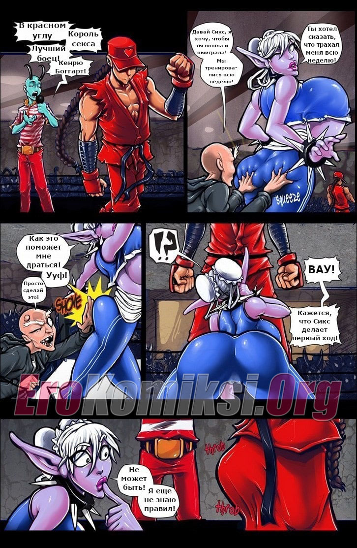 Порно комикс «Уличный Секс». Любителям всем известной игры «Уличный боец» будет очень интересно посмотреть этот порно комикс. Здесь вместо стандартных приемов используются секс приемы. На ринг выходит очень сексуальная девушка с большими буферами и аппетитной задницей, а против неё двое мужчин. Когда начинается бой, они начинают нападение, снимают с нее одежду, оголяя ее сочное тело. От этого их половые члены становятся твердыми, словно камень, используя супер приём один из бойцов наклоняет свою противницу и засовывает член ей в рот. Несколькими ритмичными движениями он трахает ее в самое горло, а потом кончает на лицо. Безусловно, это чистая победа.
