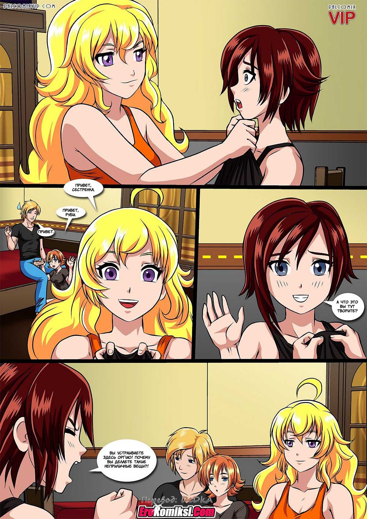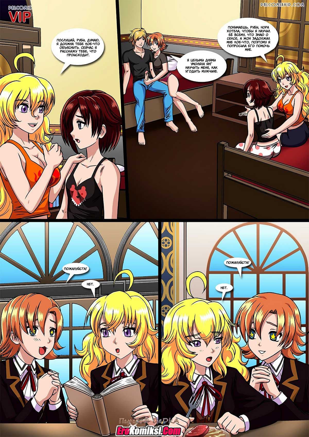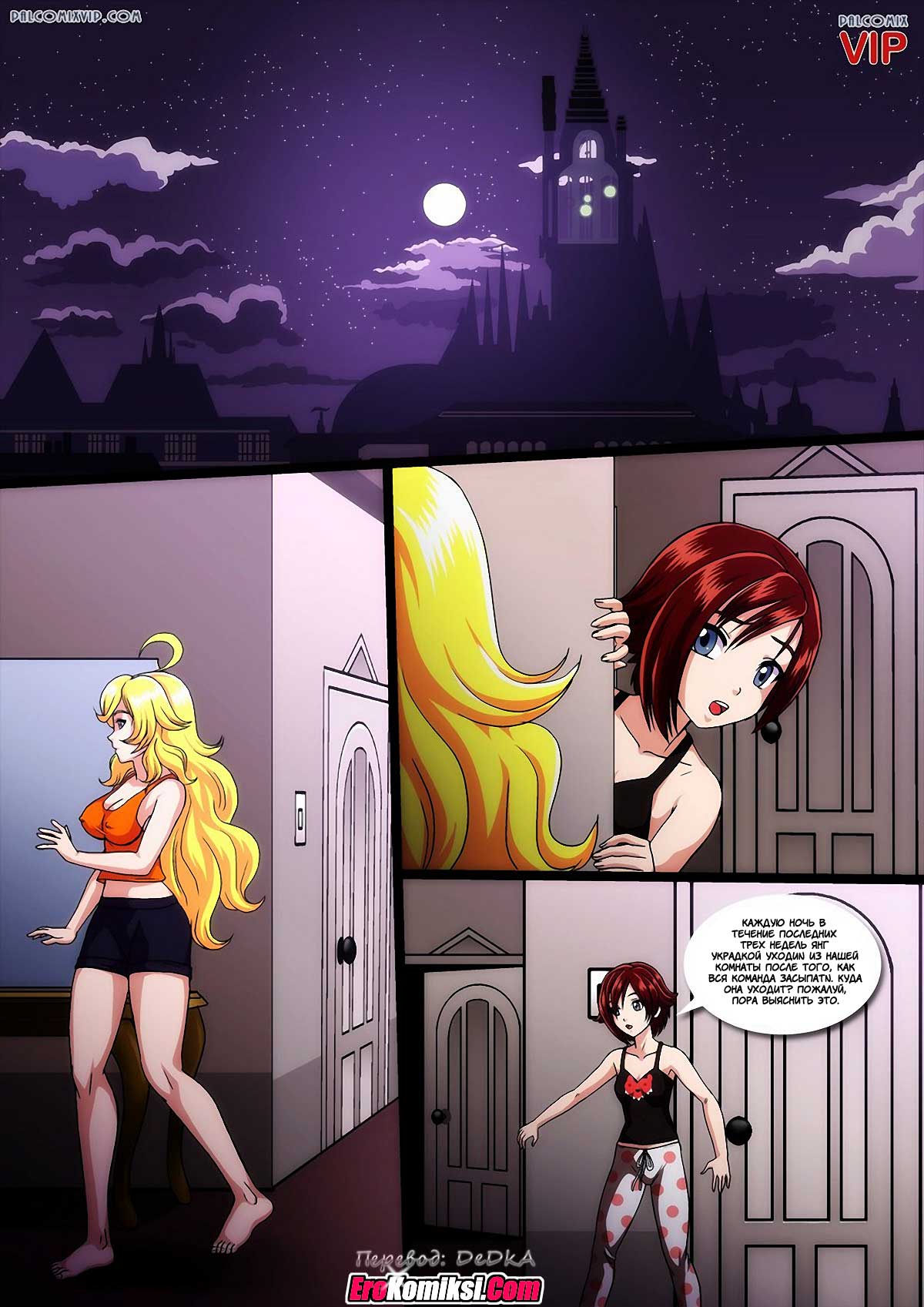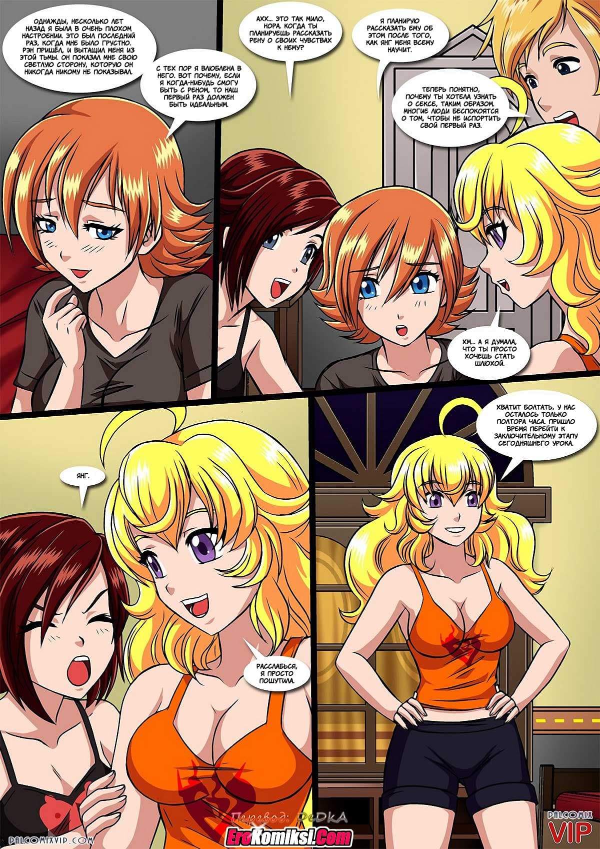 Перед вами сексуальная пародия на сериал RWBY. Каждую ночь в течение последних трех недель Янг украдкой уходила из комнаты после того, как вся команда засыпала. Куда она уходит, задумалась её младшая сестра, и решила выяснить это. Она проследила за старшей сестрой и застала её обучающей свою подругу основам секса. Практическим пособием на этом «уроке» был не какой-нибудь фаллоимитатор, а настоящий парень…