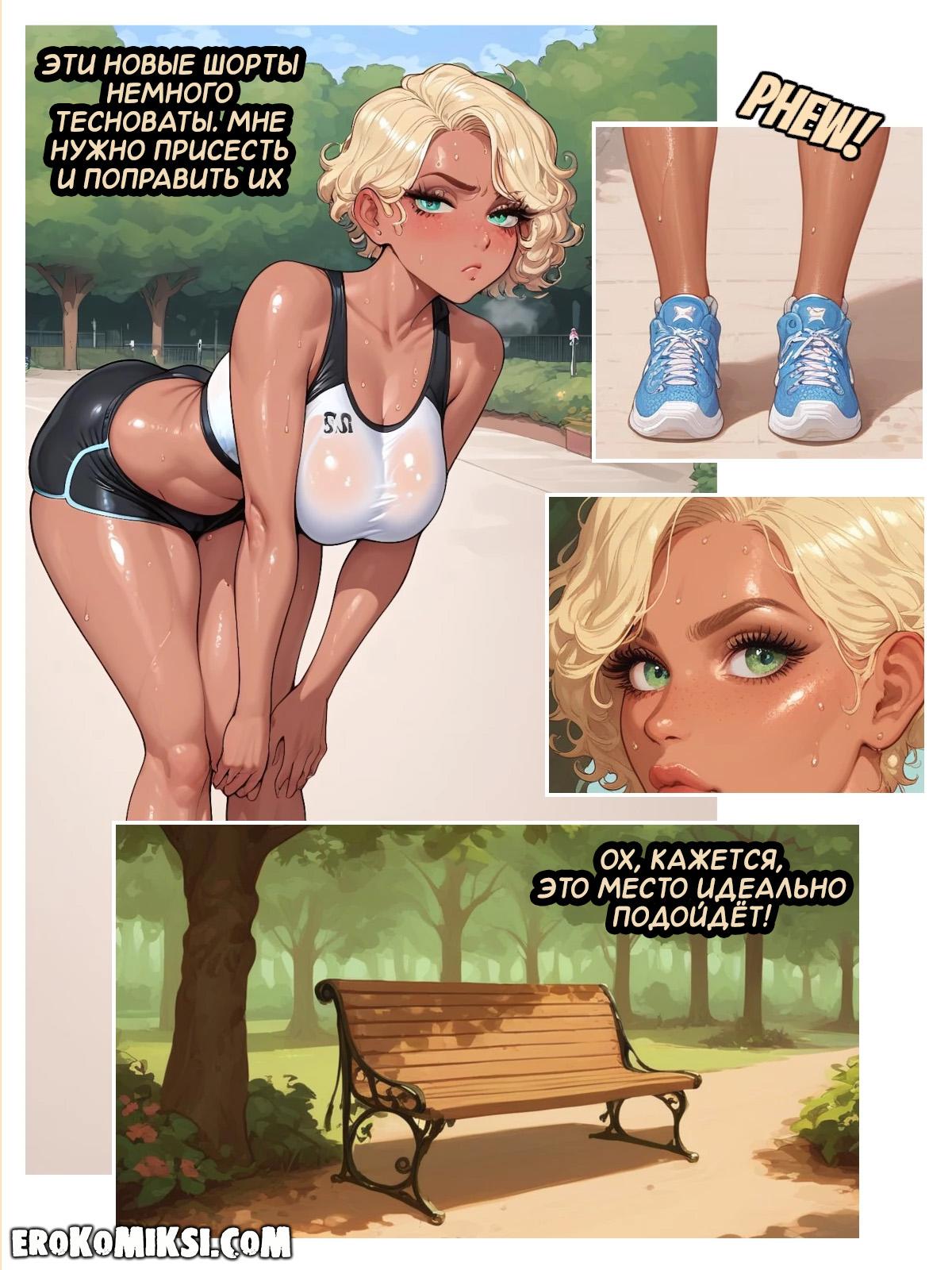 Порно комикс Утренняя пробежка. Во время утренней пробежки, молодая красотка сильно возбудилась от тесных шорт, натирающих её киску, и решила помастурбировать прямо в парке, но её спалил паренёк и сняв на видео, решил шантажировать красотку. Он отвёл её в туалет, где как следует оттрахал своим огромным членом.