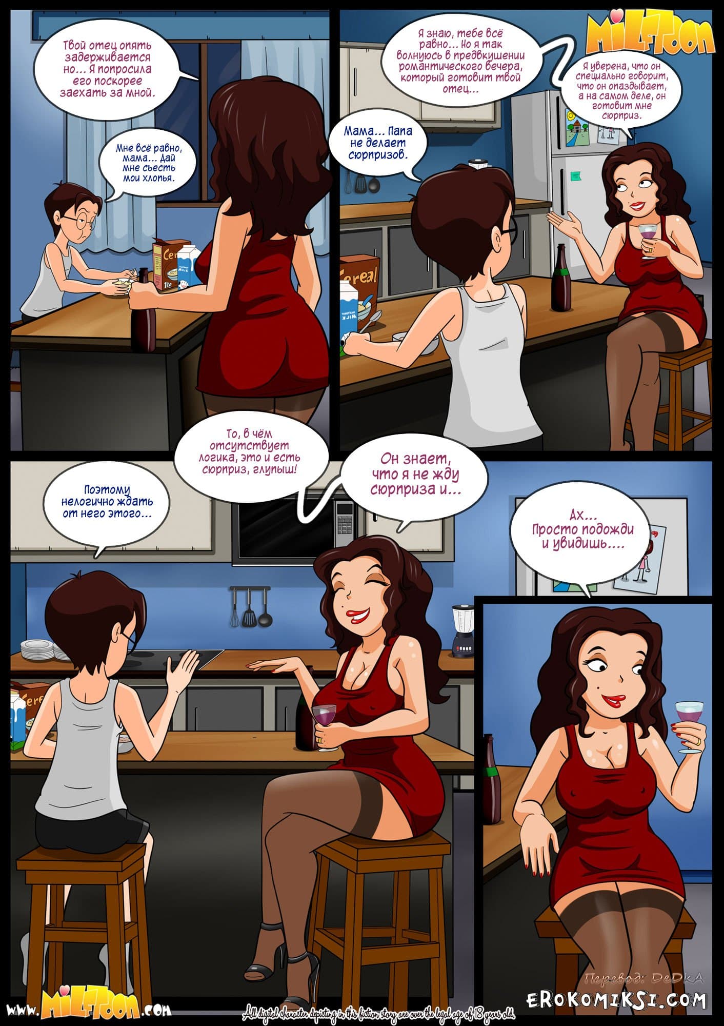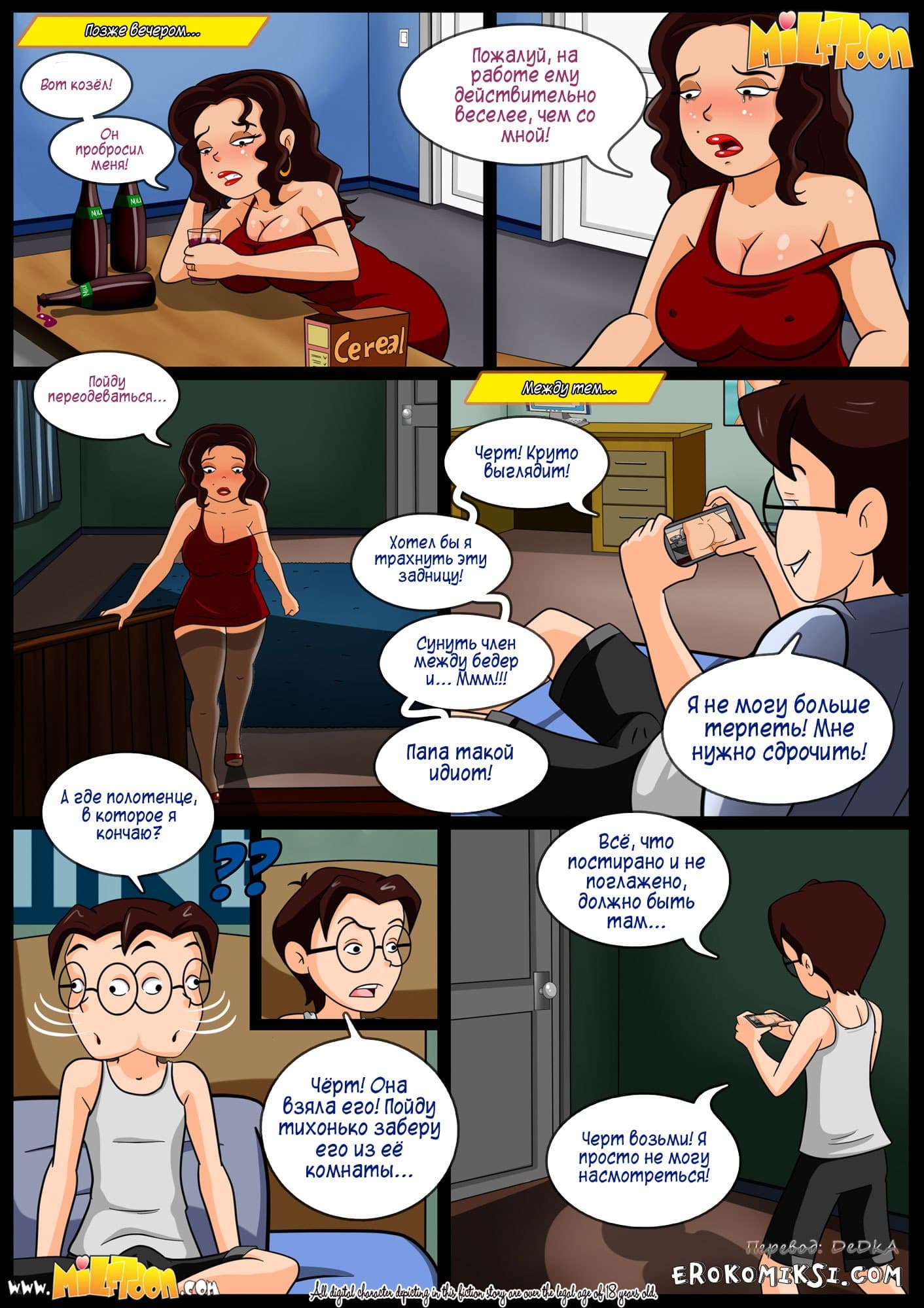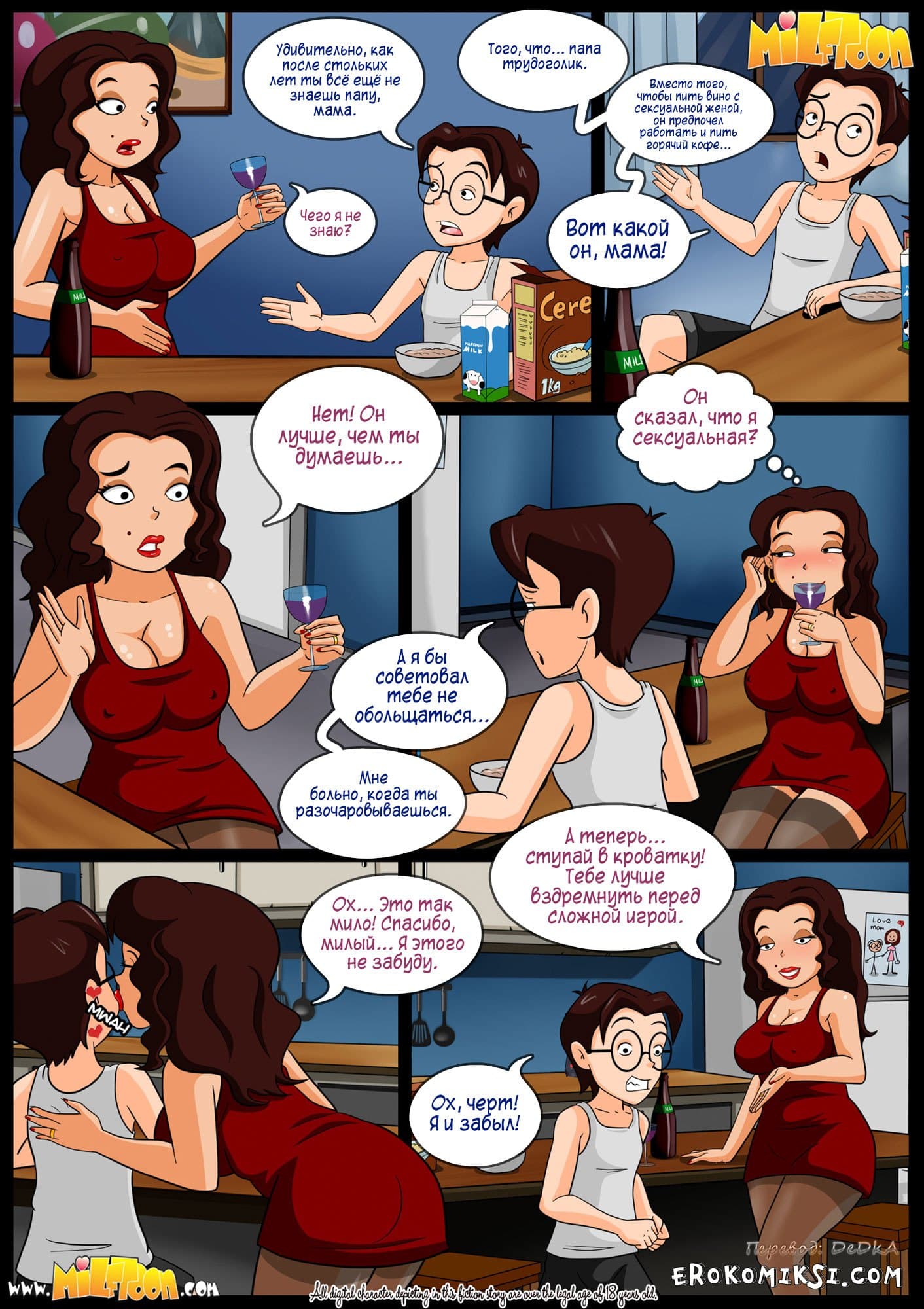 Порно комикс «Ужин с вином» начинается с того, что в честь годовщины свадьбы муж пообещал жене романтический ужин с вином! Но, когда пришло время, муженёк позвонил домой жене и сказал, что он очень занят на работе, и не может выполнить своё обещание. Бедной домохозяйке осталось только напиться с горя в одиночестве. Но муж и жена, это ещё не все герои этого комикса. Есть ещё и сынок. Вот он то и будет главным действующим лицом! Но действовать он будет не лицом…