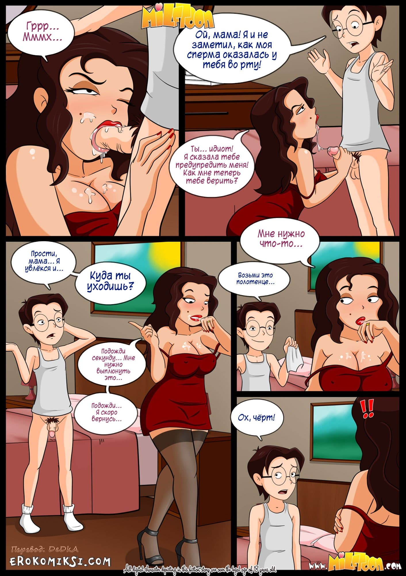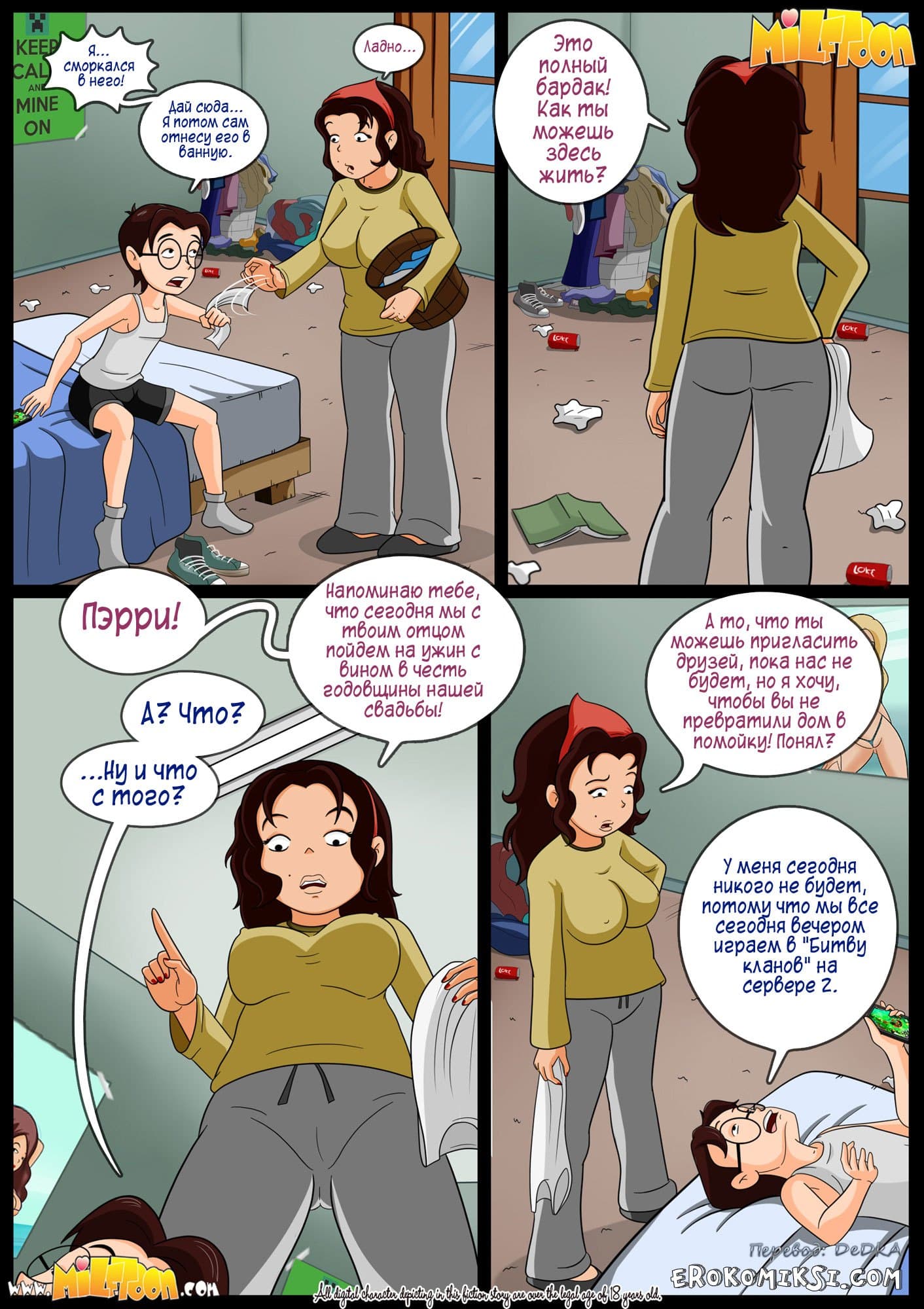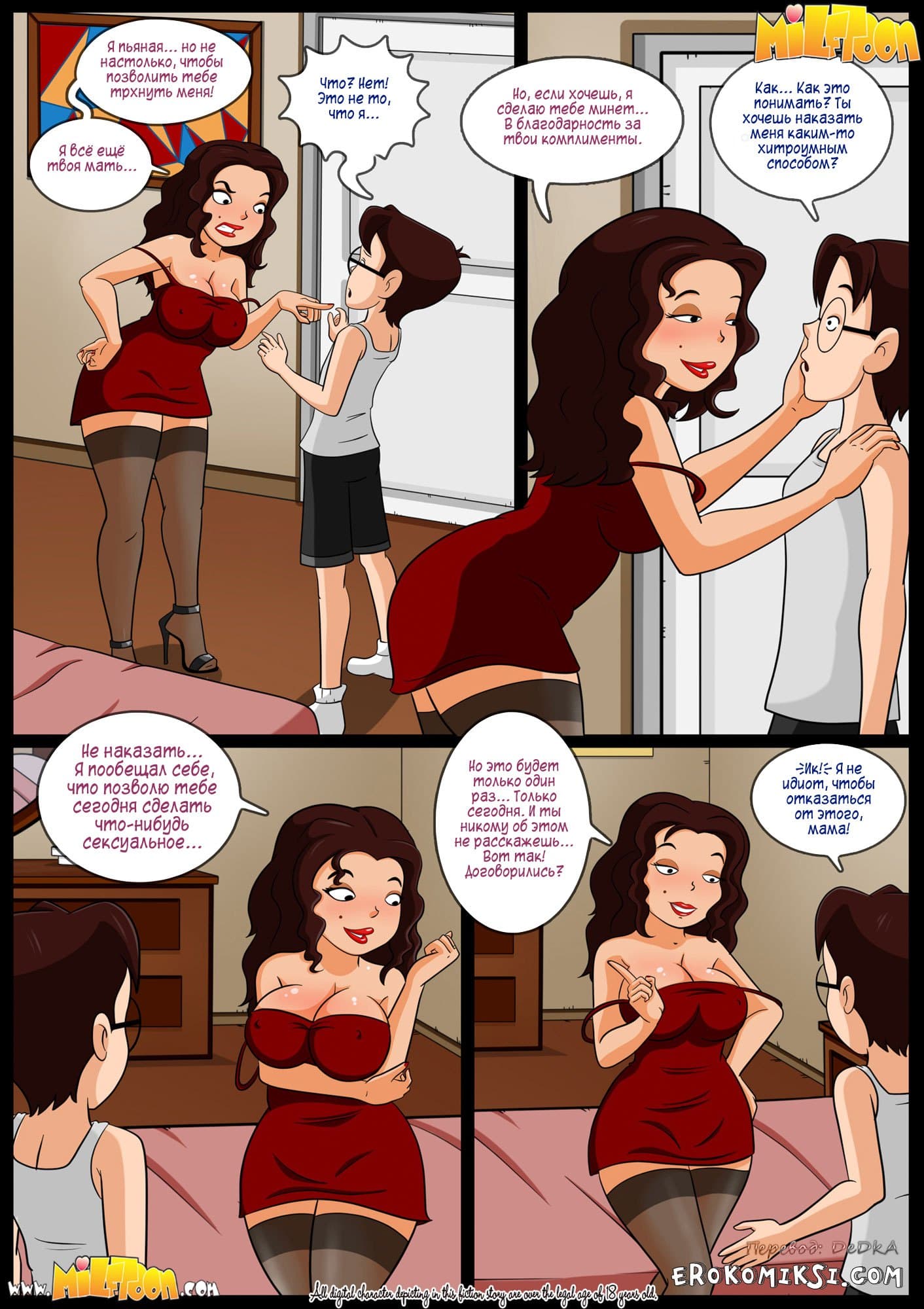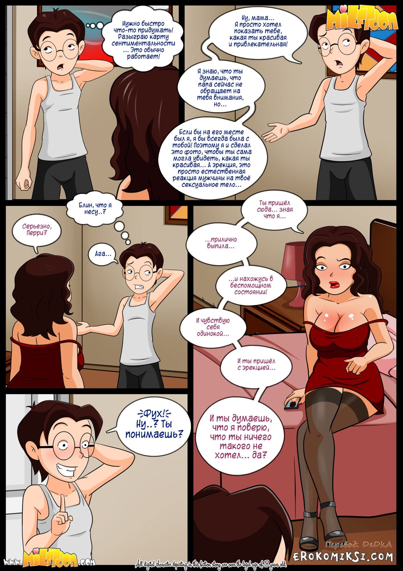 Порно комикс «Ужин с вином» начинается с того, что в честь годовщины свадьбы муж пообещал жене романтический ужин с вином! Но, когда пришло время, муженёк позвонил домой жене и сказал, что он очень занят на работе, и не может выполнить своё обещание. Бедной домохозяйке осталось только напиться с горя в одиночестве. Но муж и жена, это ещё не все герои этого комикса. Есть ещё и сынок. Вот он то и будет главным действующим лицом! Но действовать он будет не лицом…